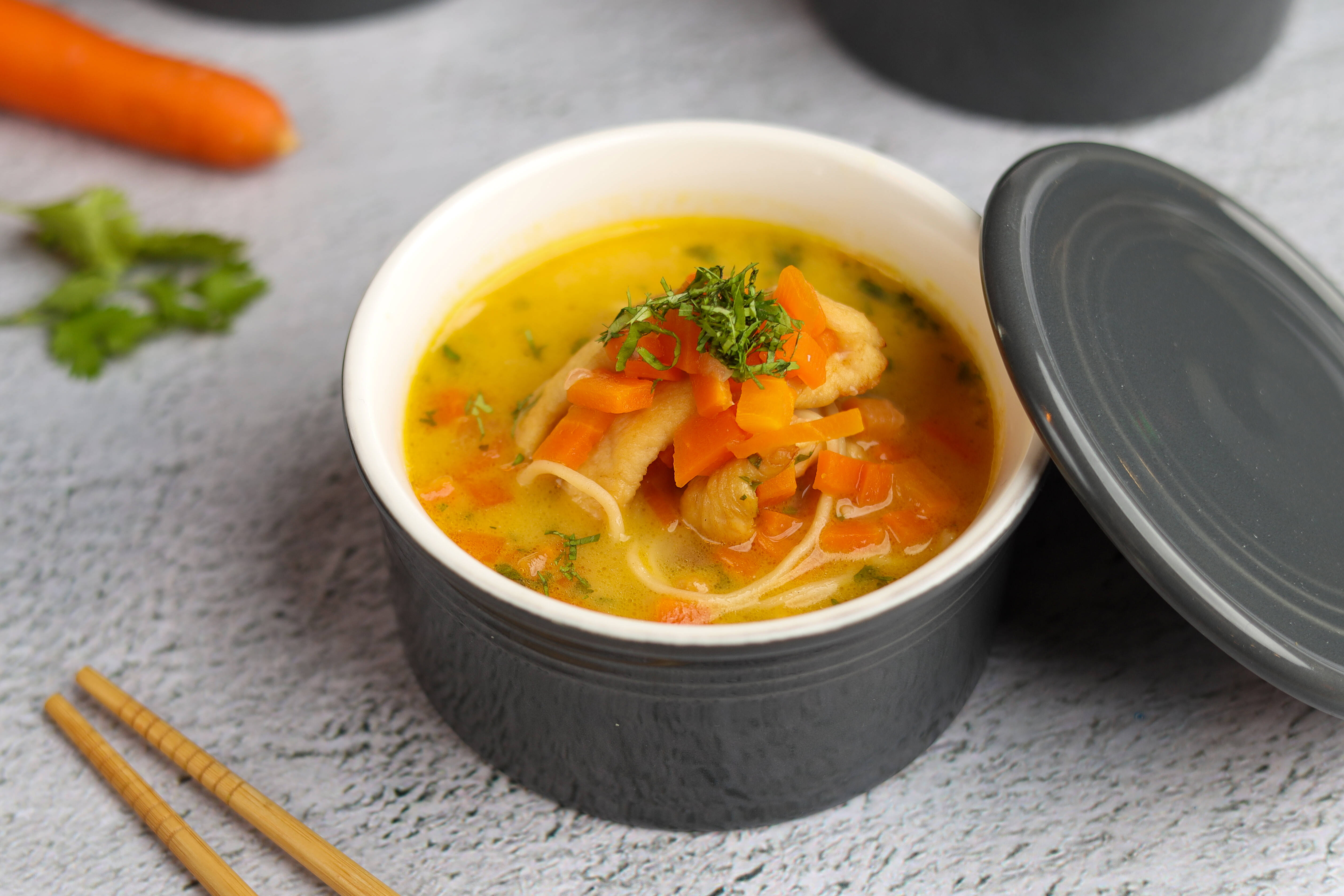 .حساء معكرونة الدجاج الشهير، والذي يشمل المعكرونة والدجاج والجزر والبصل والكزبرة