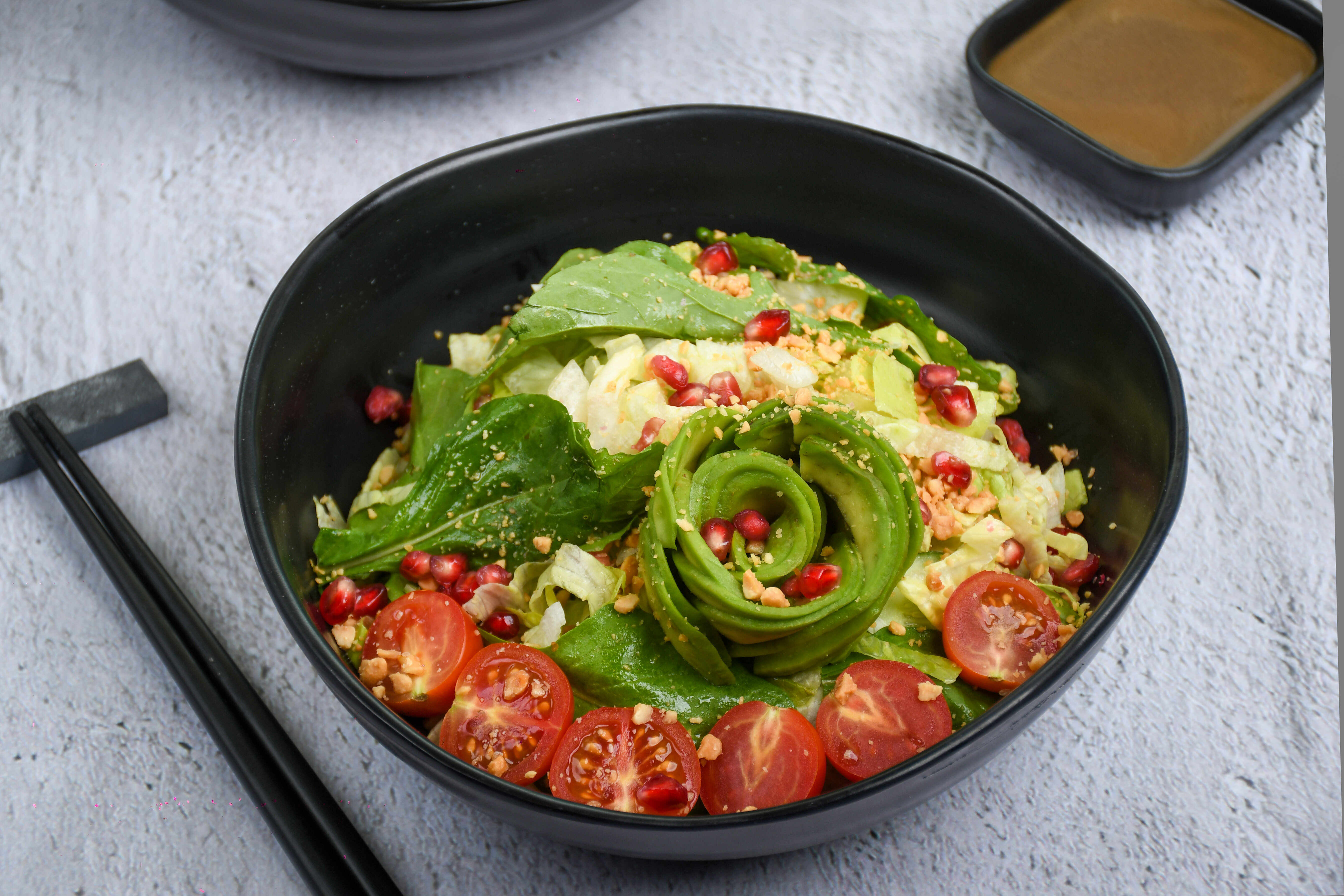 مجموعة من الخضار الورقية، طماطم كرزية، الخيار، رشة من الفول السوداني والرمان مضاف اليها شرائح الافوكادو