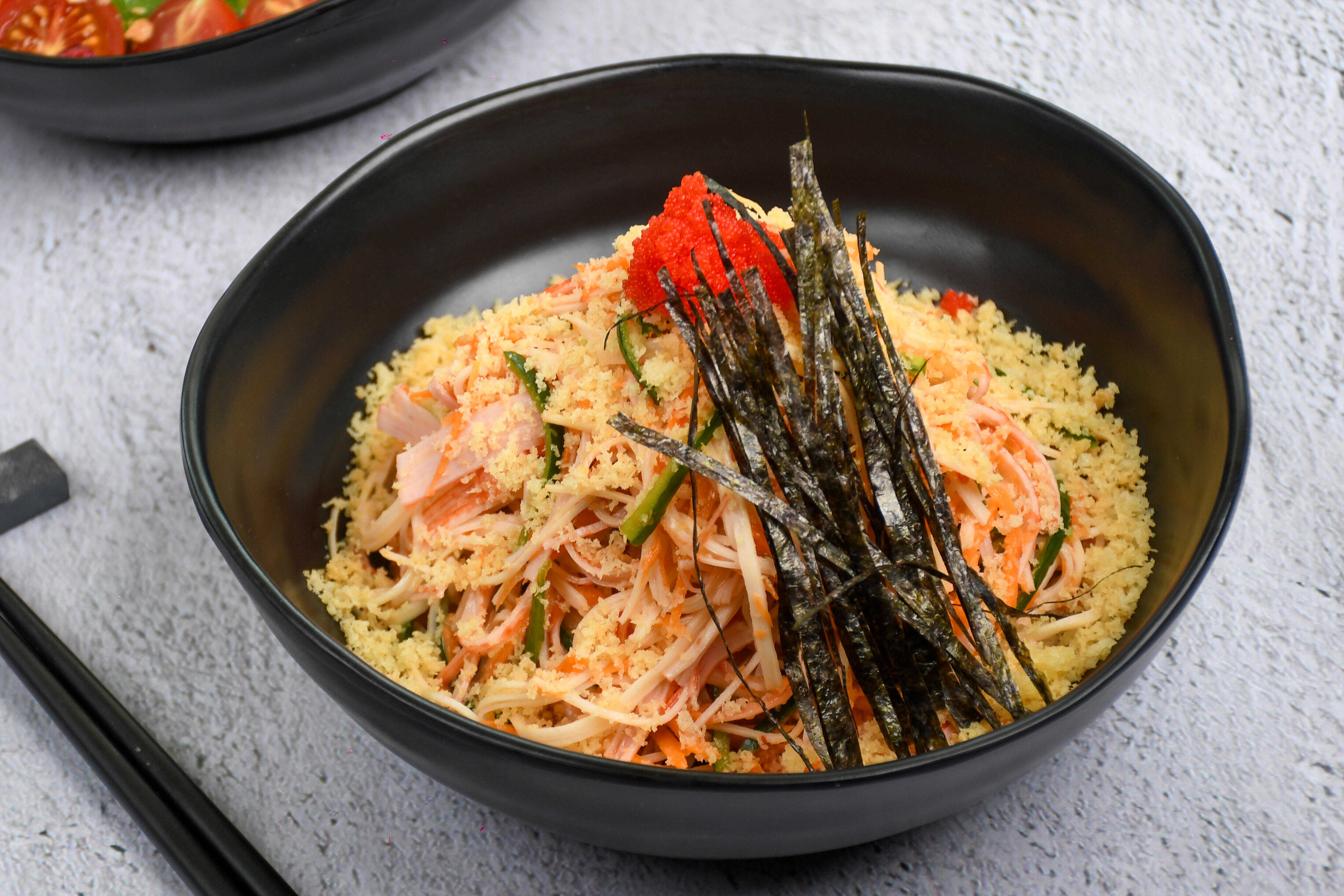 سلطة ملونة من السلطعون المبخر والخضروات مع صلصة يابانية خاصة يغطيها الكافيار توبيكو