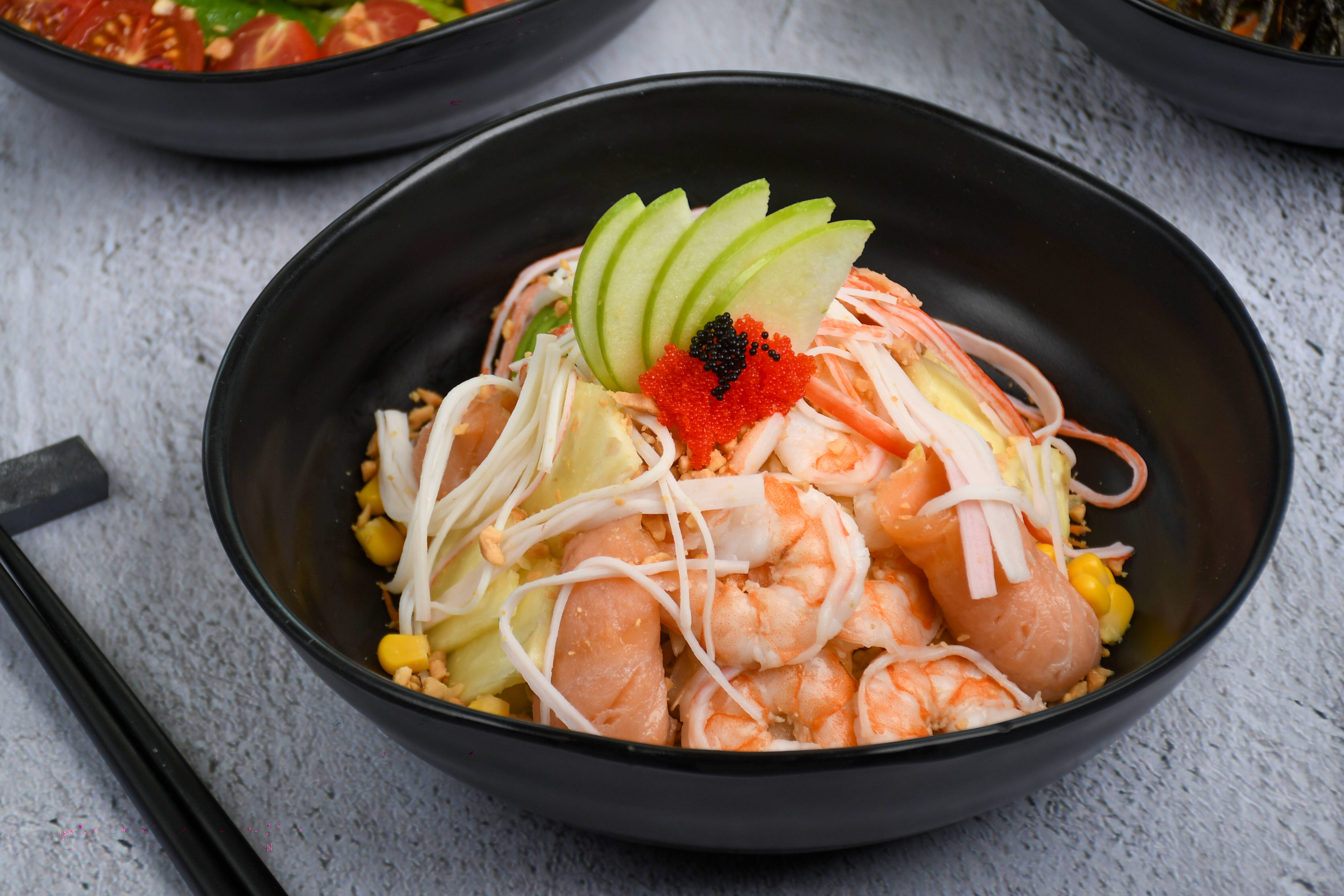 سلطة السوشي رول الخاصة من سمك السلمون المدخن ,الروبيان المطبوخ,الكاليماري"الحبار" ,الذرة الحلوة والتفاح ,الأناناس ,خضار ورقية مع رشة من الفول السوداني و الكافيار مع الصلصة