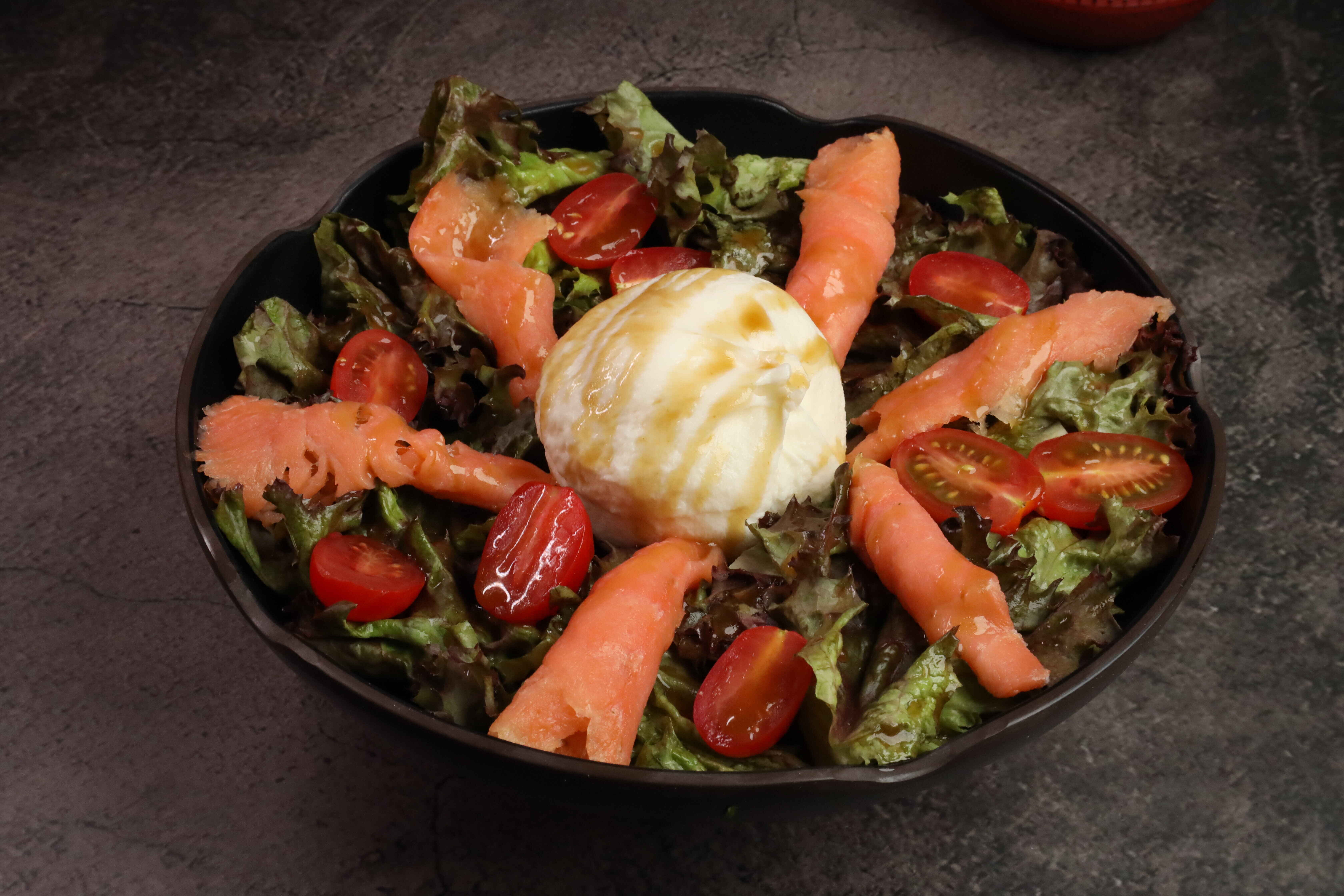 سلطة جبنة البوراتا المشهورة مع الخس والطماطم الكرزية وقطع من السالمون المدخن مع شرائح البرتقال