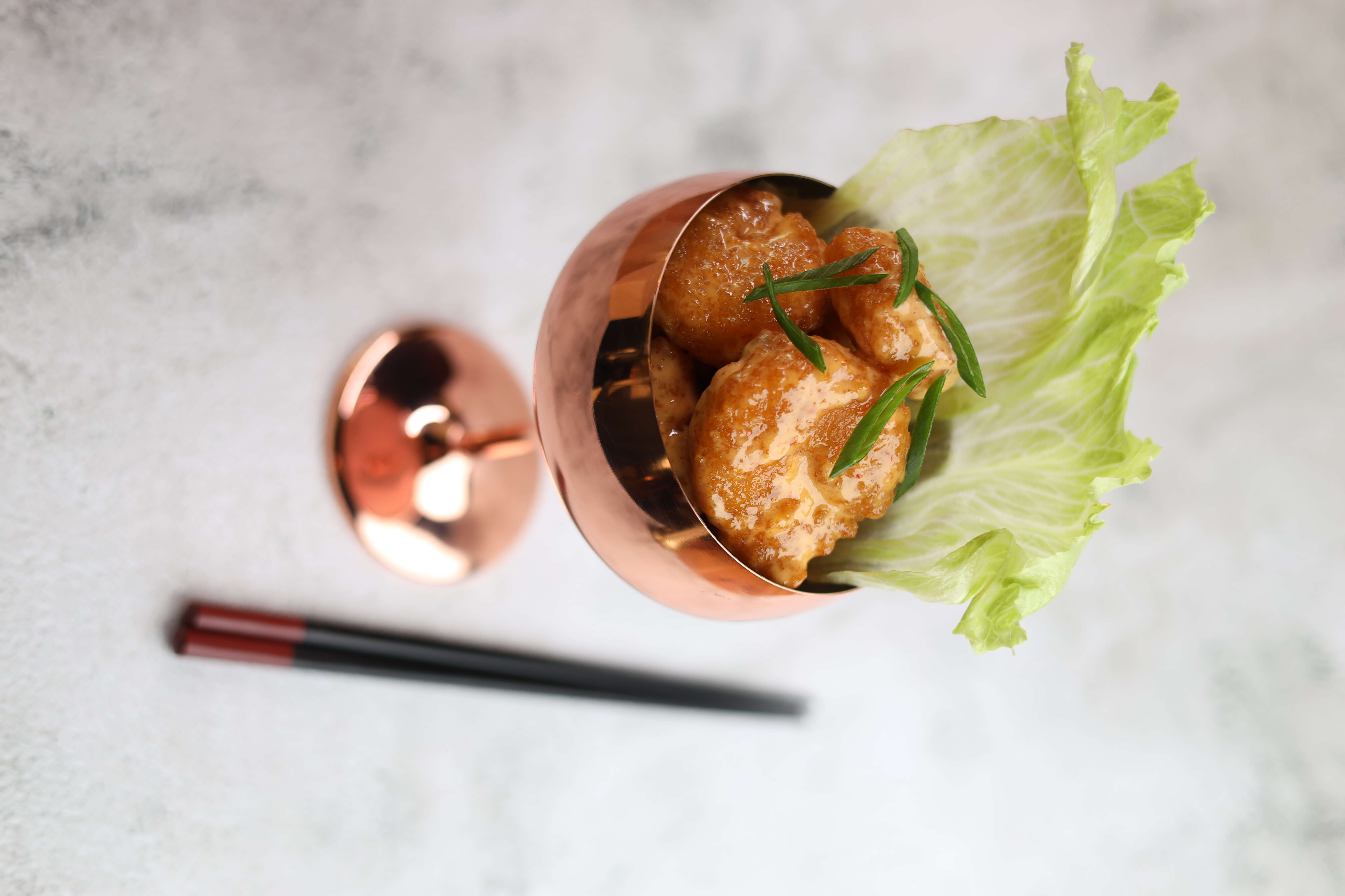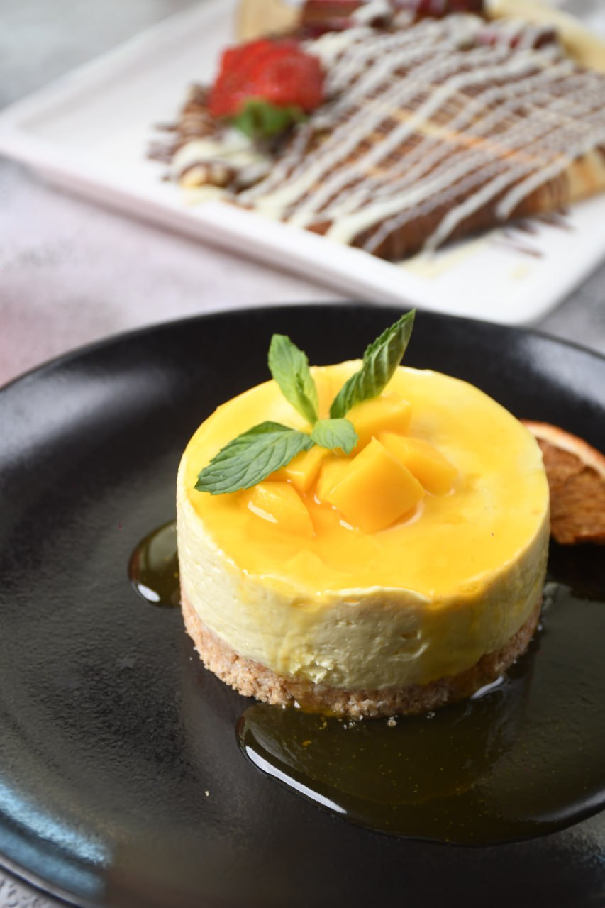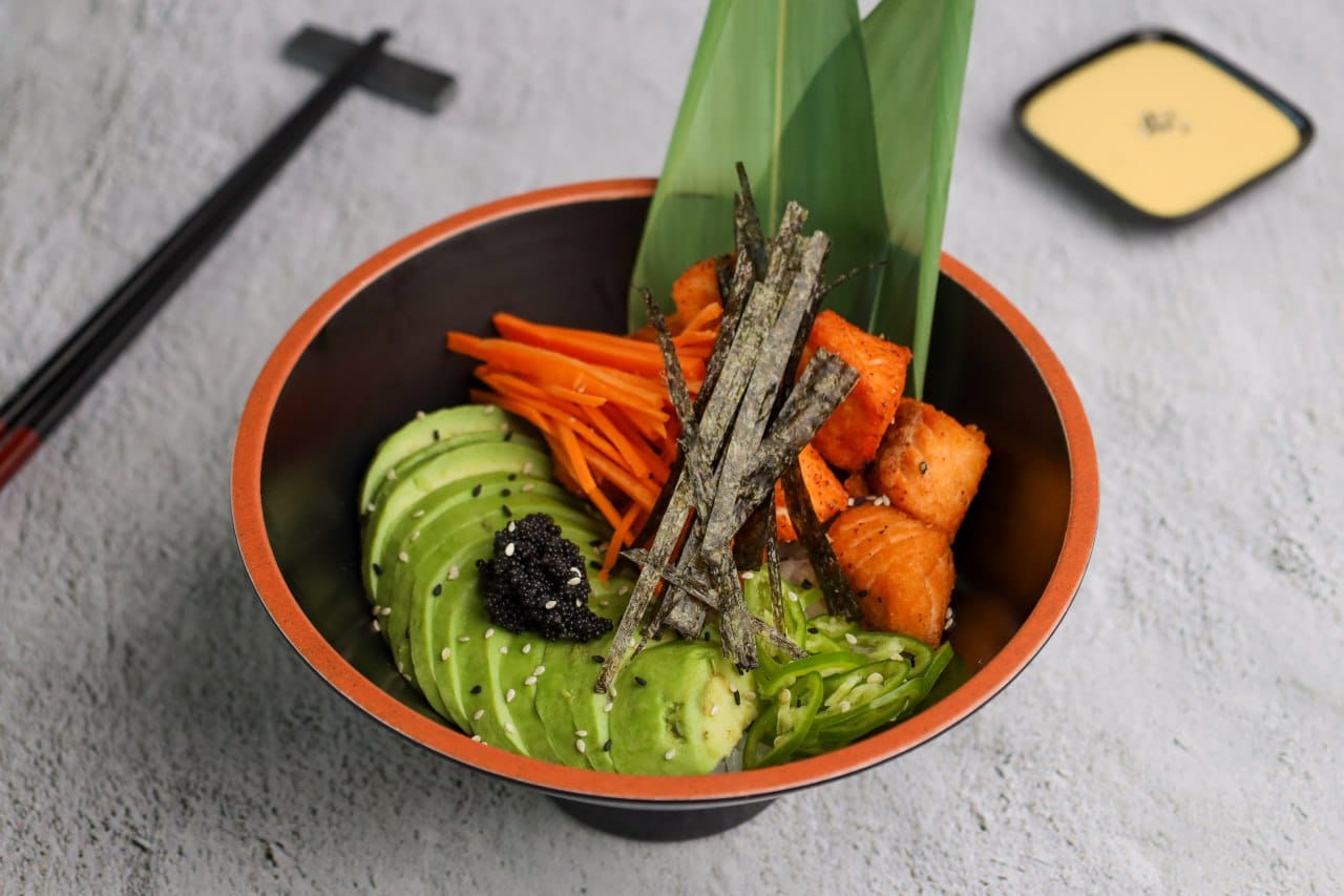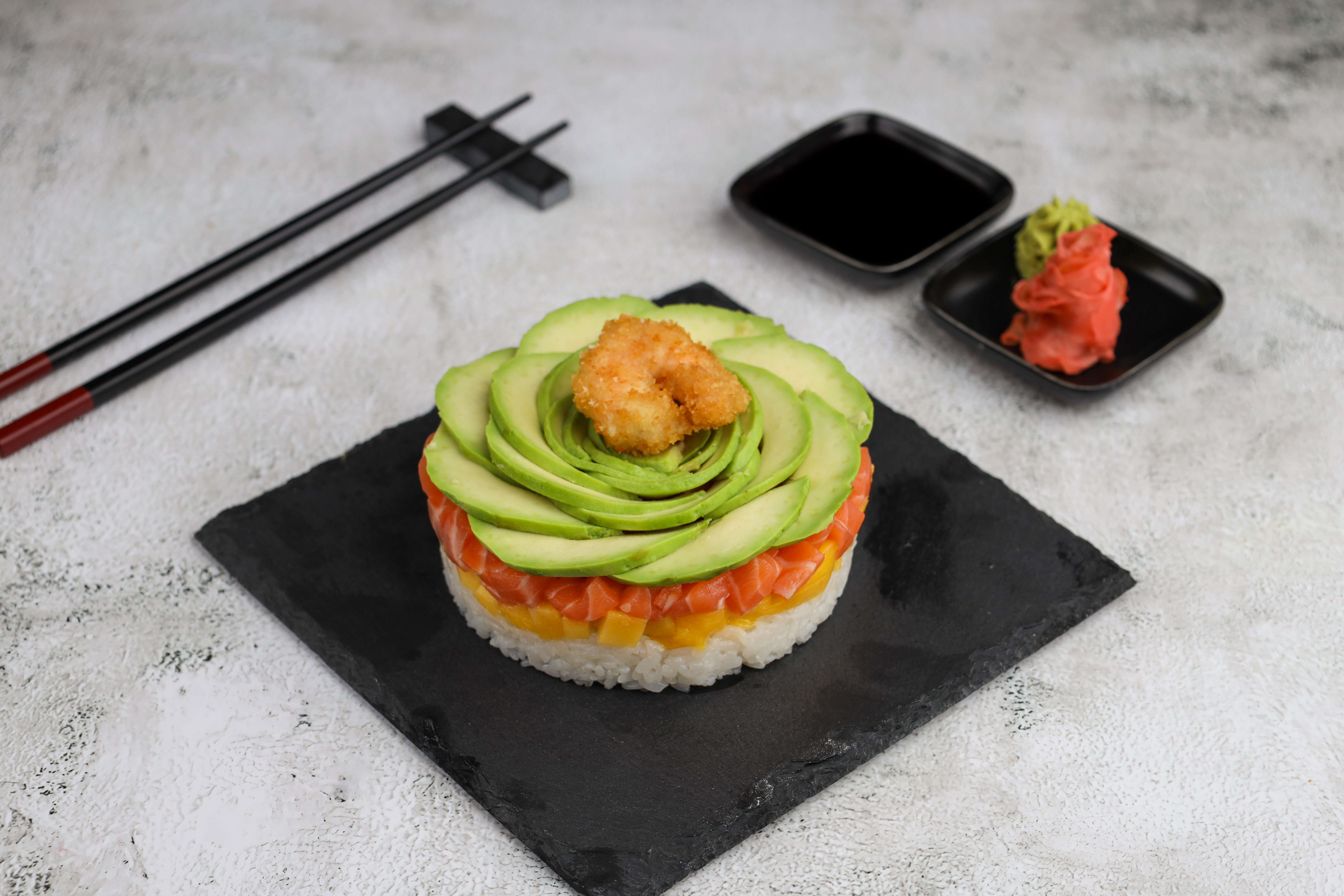 مكعبات السلمون متبلة في صلصة آسيوية منعشة، مقترنة بالمانجو الطازج، مع الأفوكادو الكريمي، وتنتهي بأرز السوشي المطهو على البخار