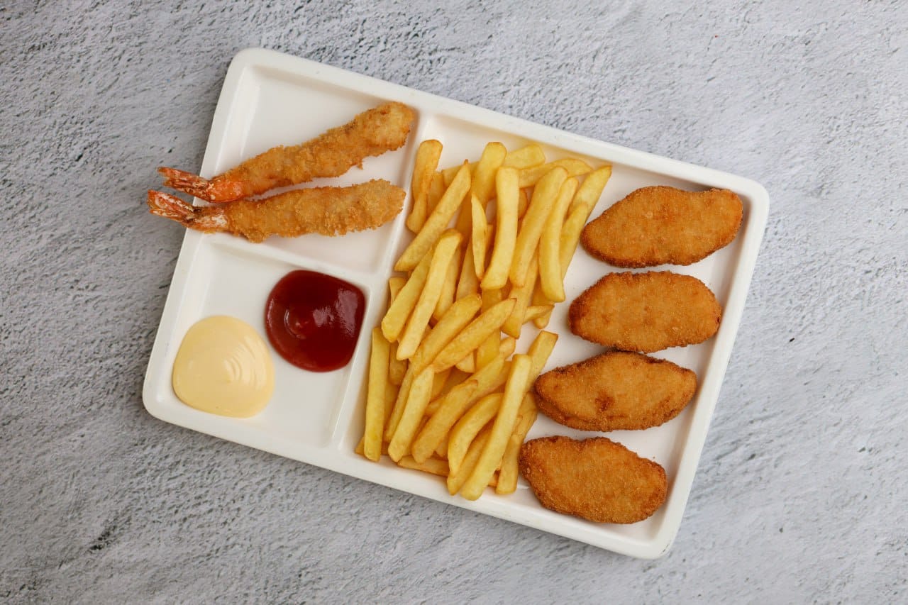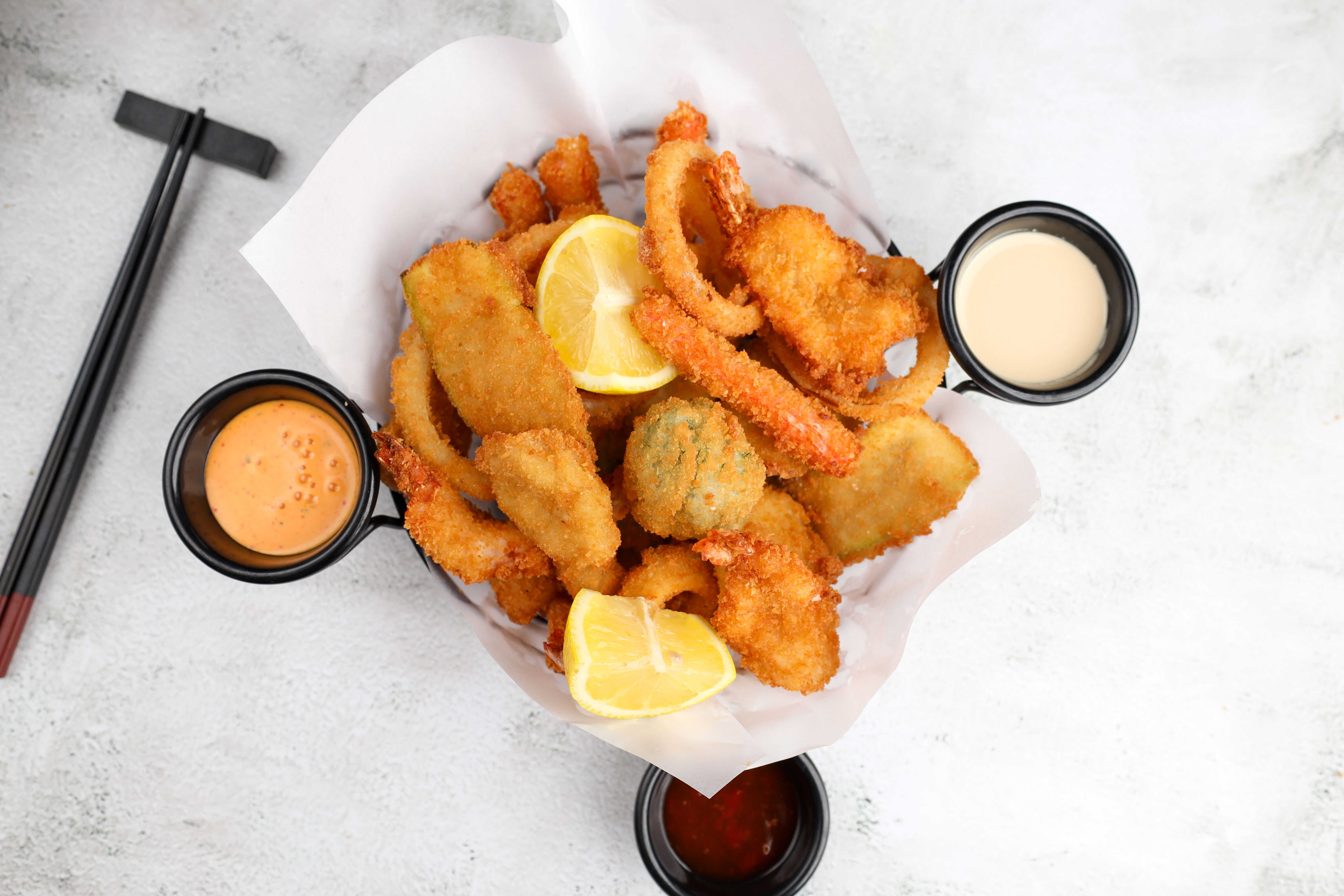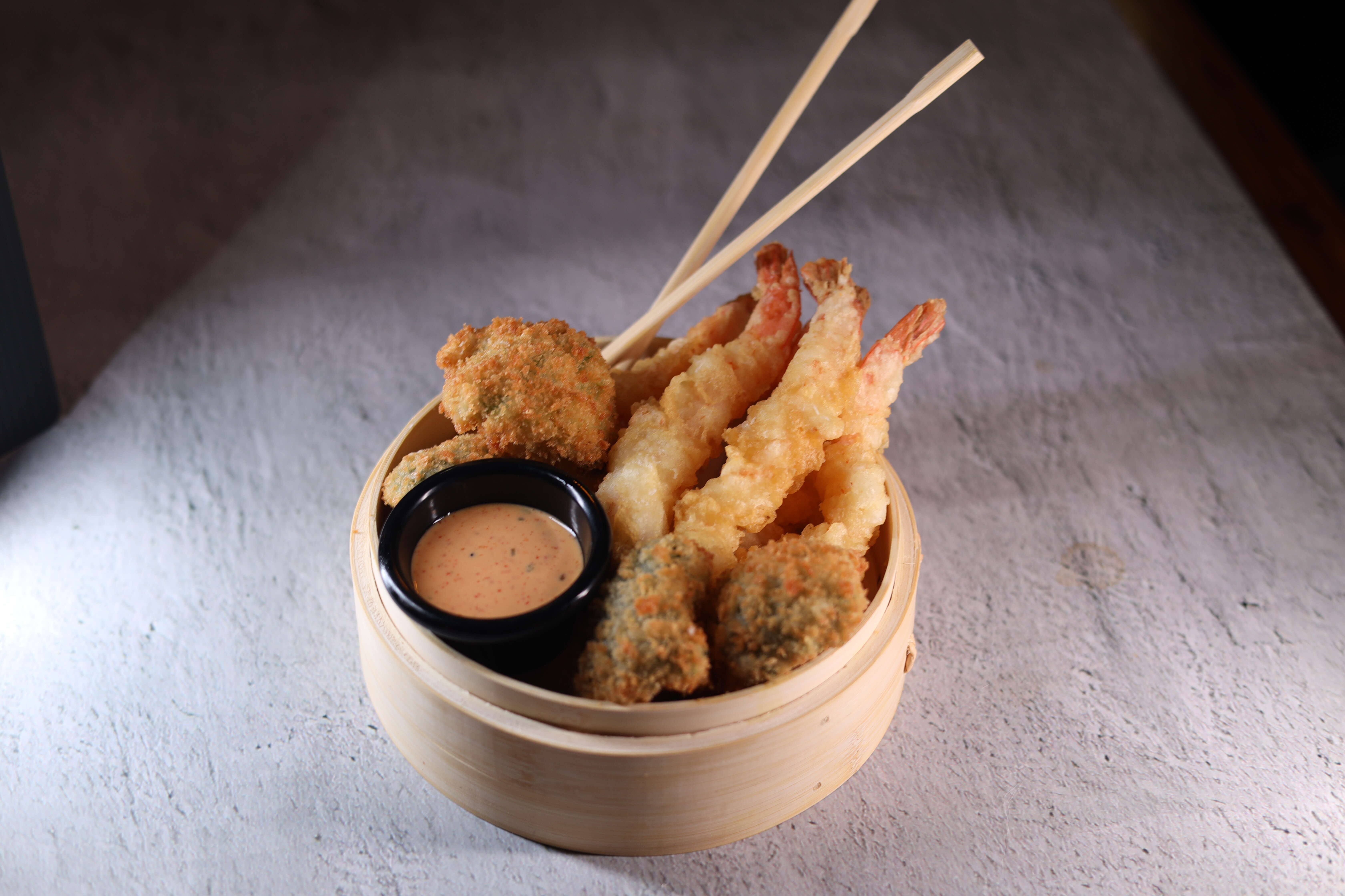 يتم تقديم تشكيلة من التمبورا على طبق يحتوي على تمبورا الروبيان، وتمبورا الحبار، وتمبورا السلطعون، والأسماك والبطاطس، وتمبورا الخضار، بالإضافة إلى مجموعة متنوعة من صلصات الغمس.