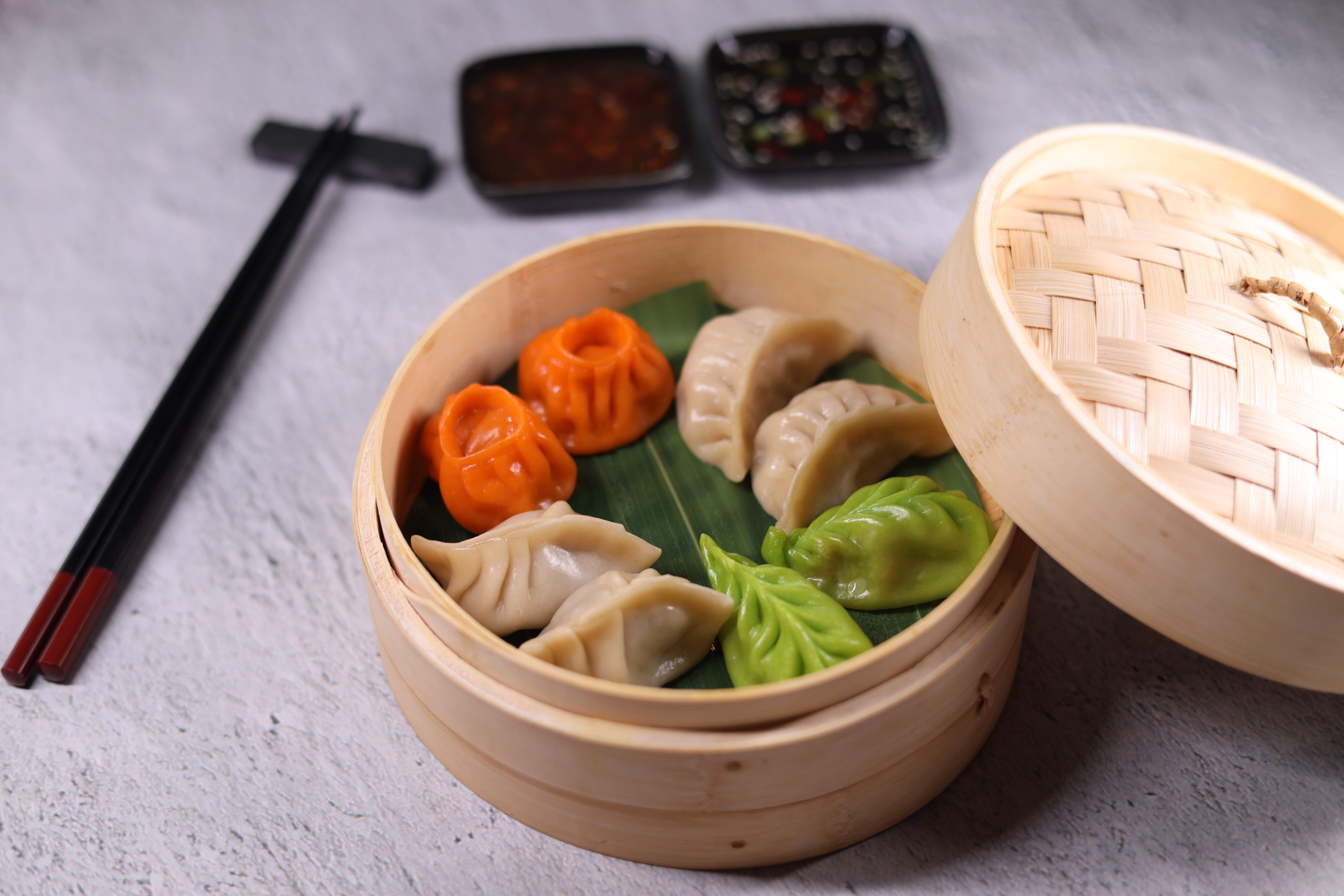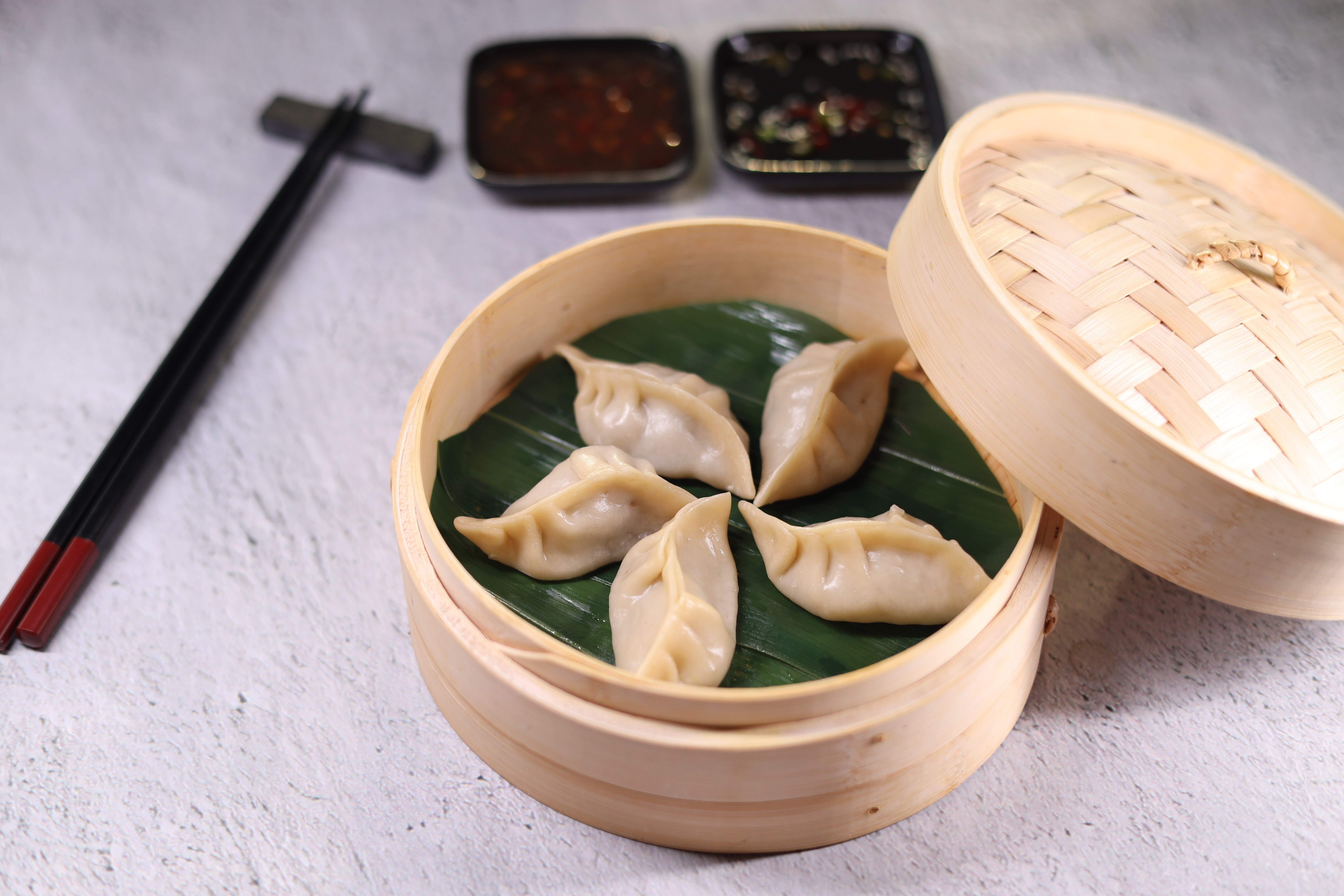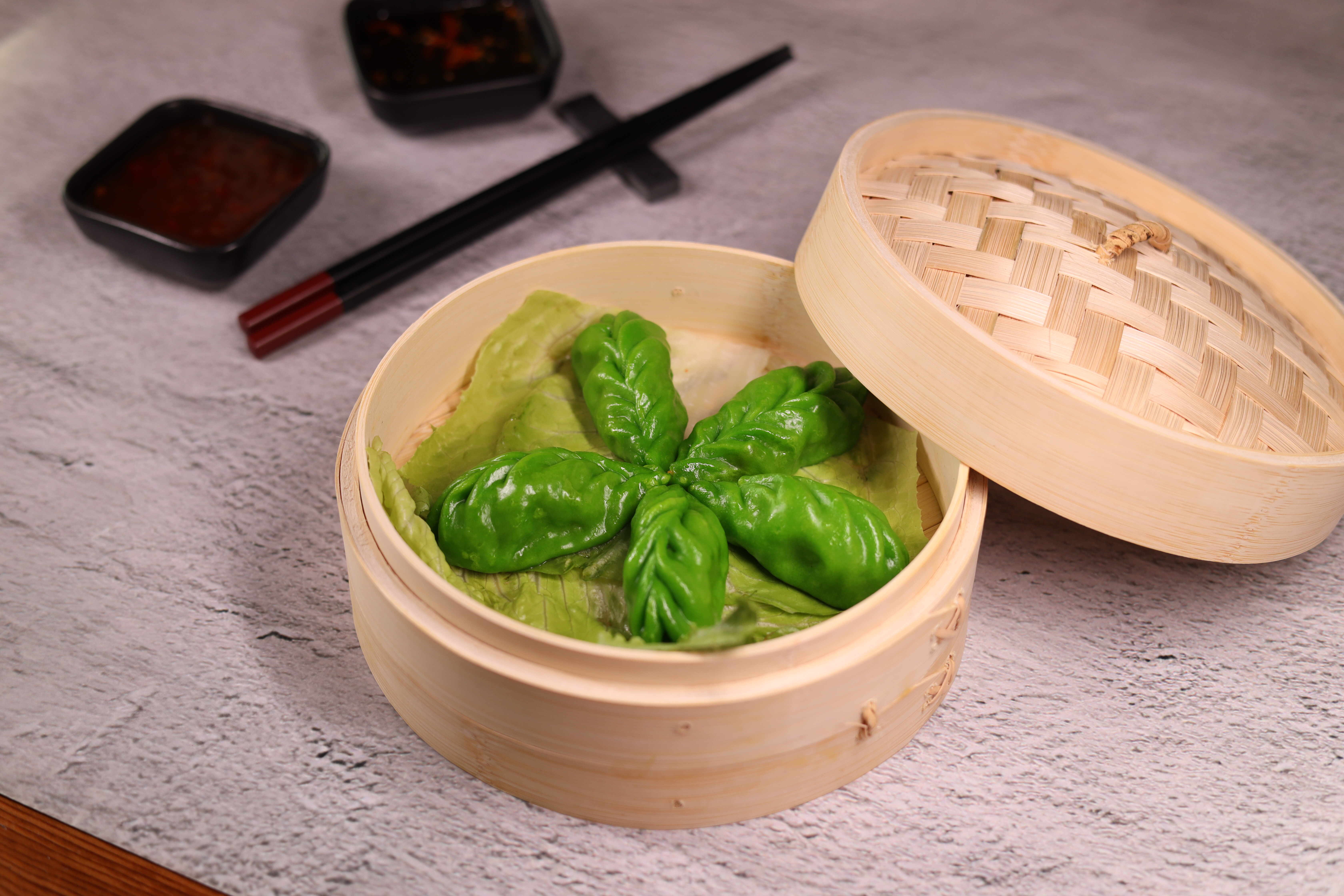 مزيج من الفطائر بالنكهة الاسيوية المطهوة على البخار مع الخضار والدجاج والروبيان