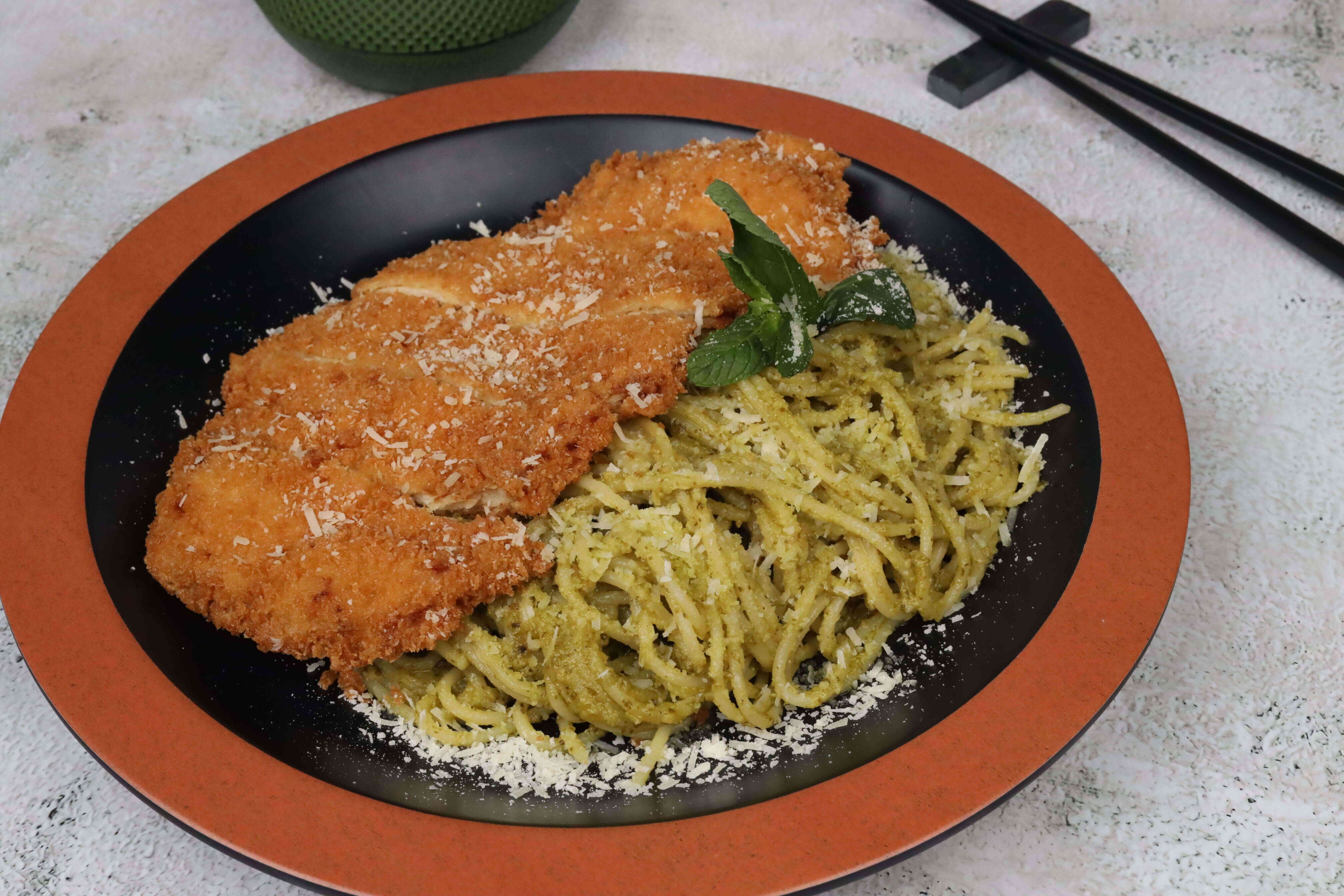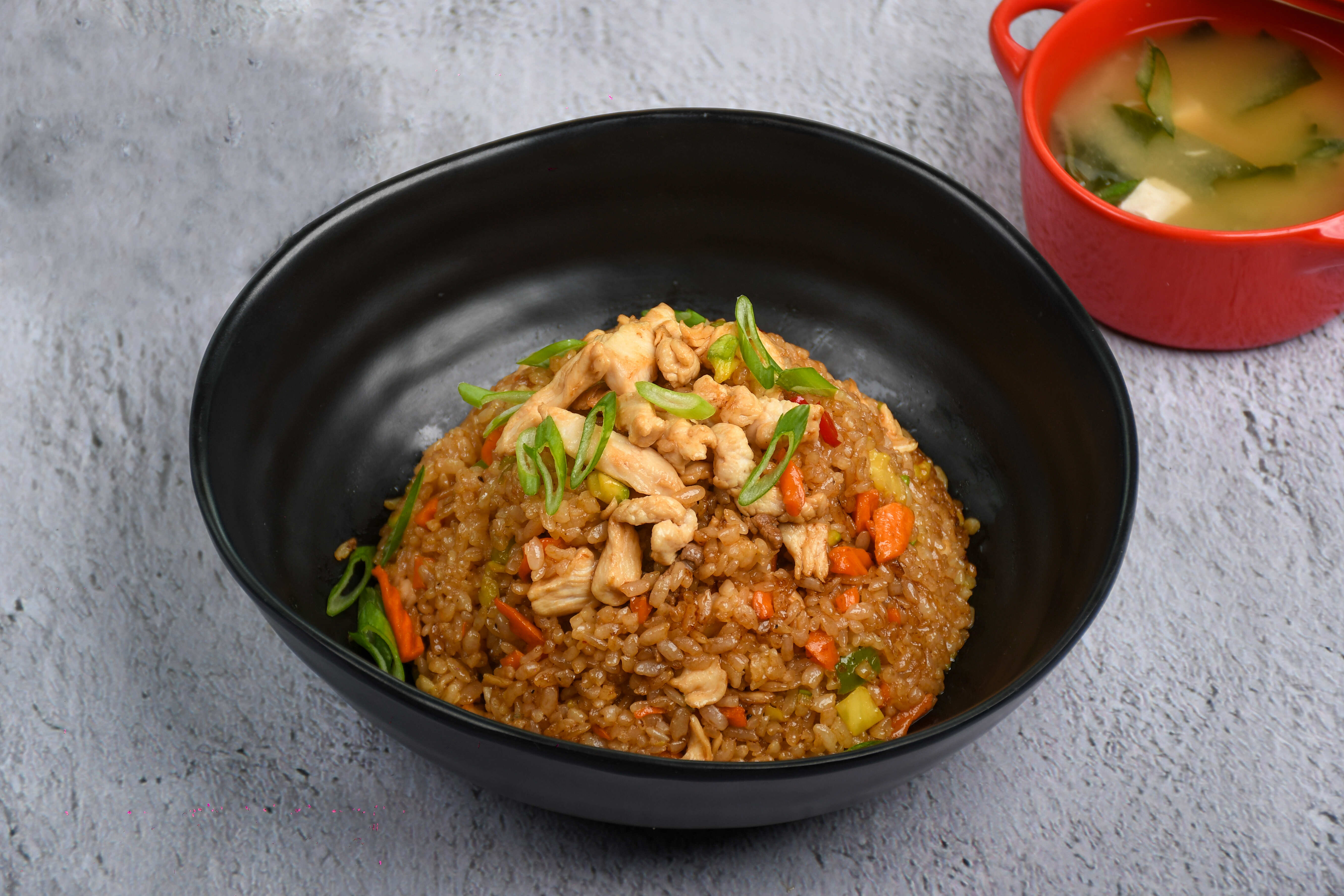 يأتي الرز الأسيوي بالدجاج بصلصة السمك والصويا مع البيض المخفوق او بدونه و رشة من البصل الاخضر مع شوربة الميسو كطبق جانبي