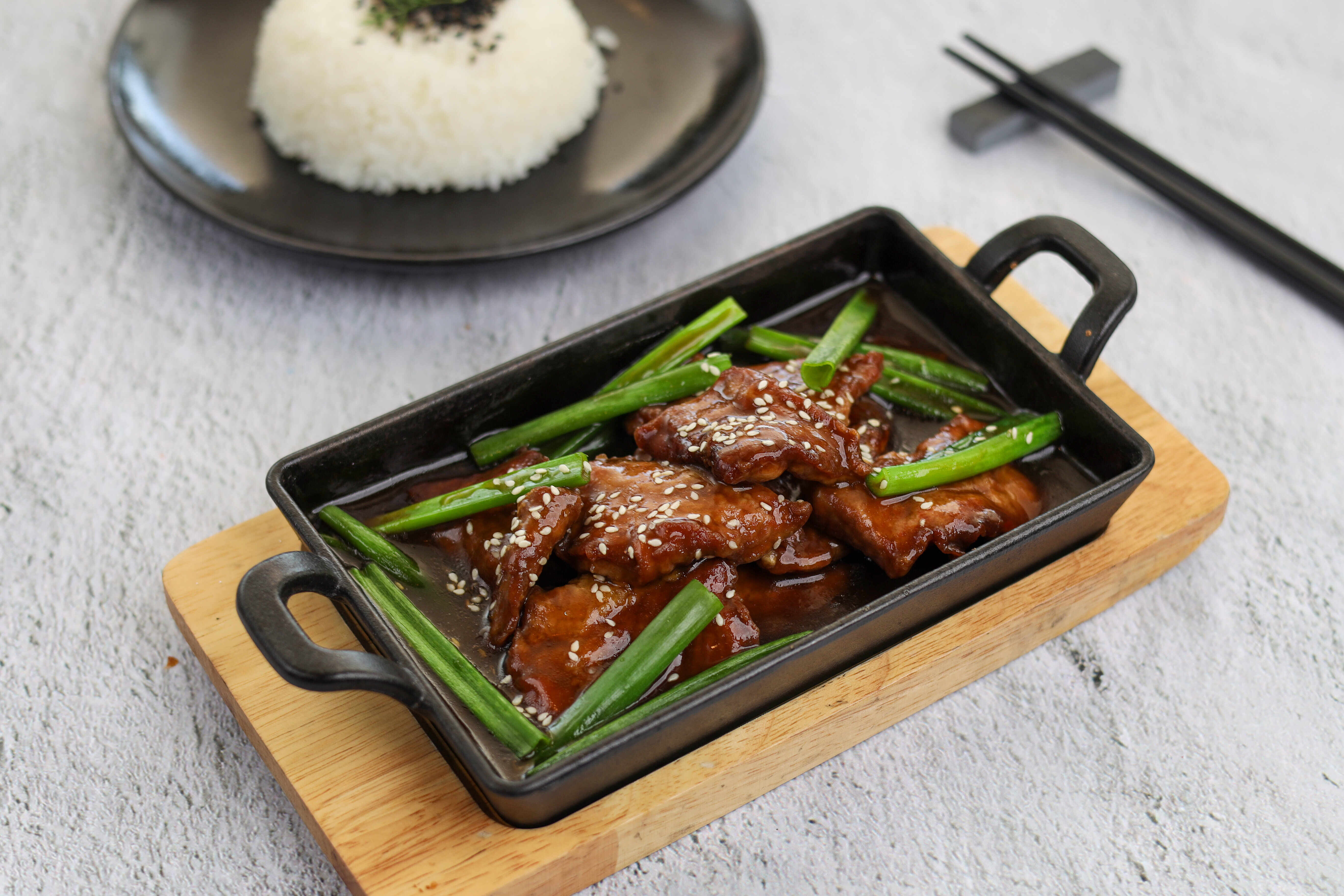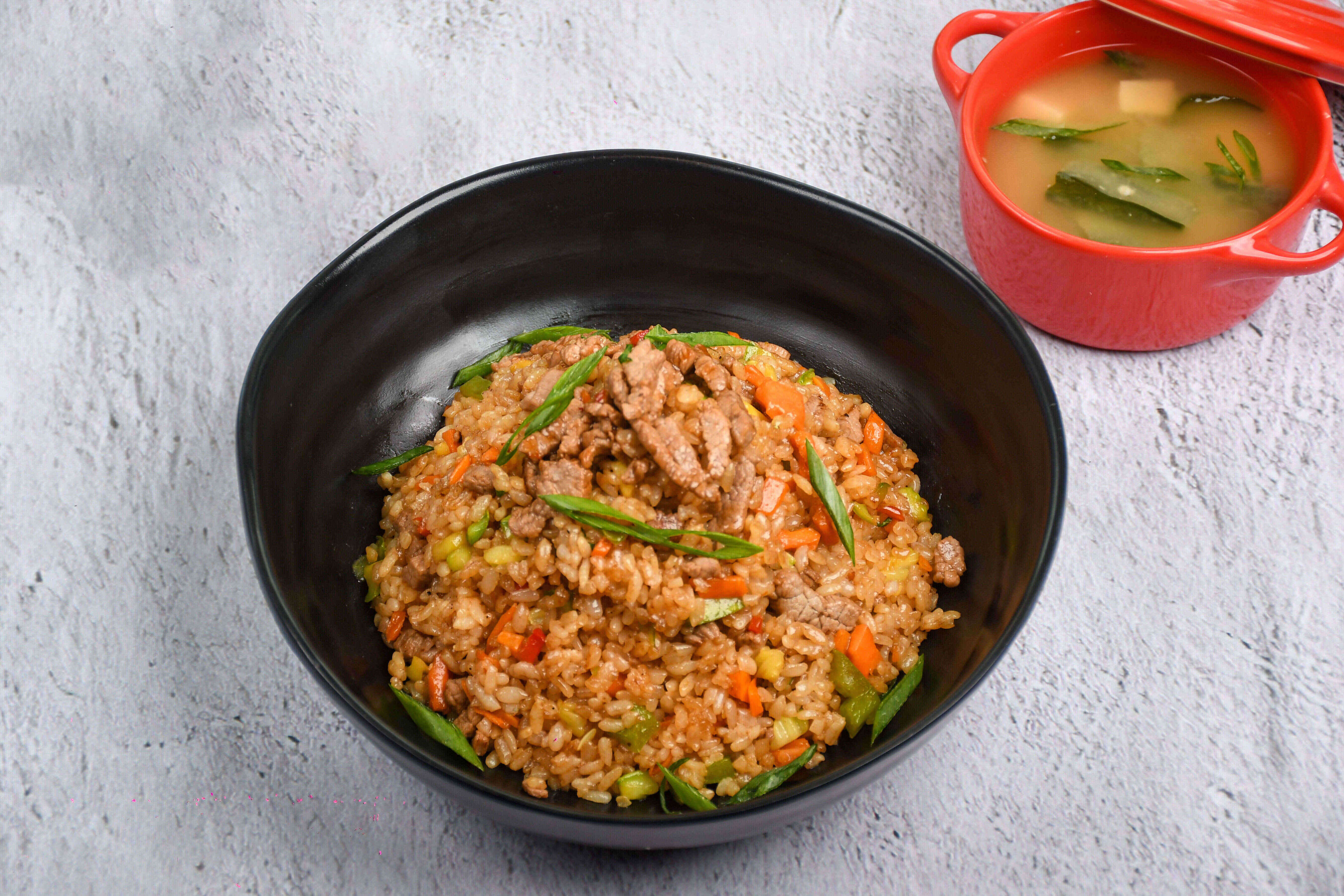 يأتي الرز الأسيوي باللحم بصلصة السمك والصويا مع البيض المخفوق او بدونه و رشة من البصل الاخضر مع شوربة الميسو كطبق جانبي