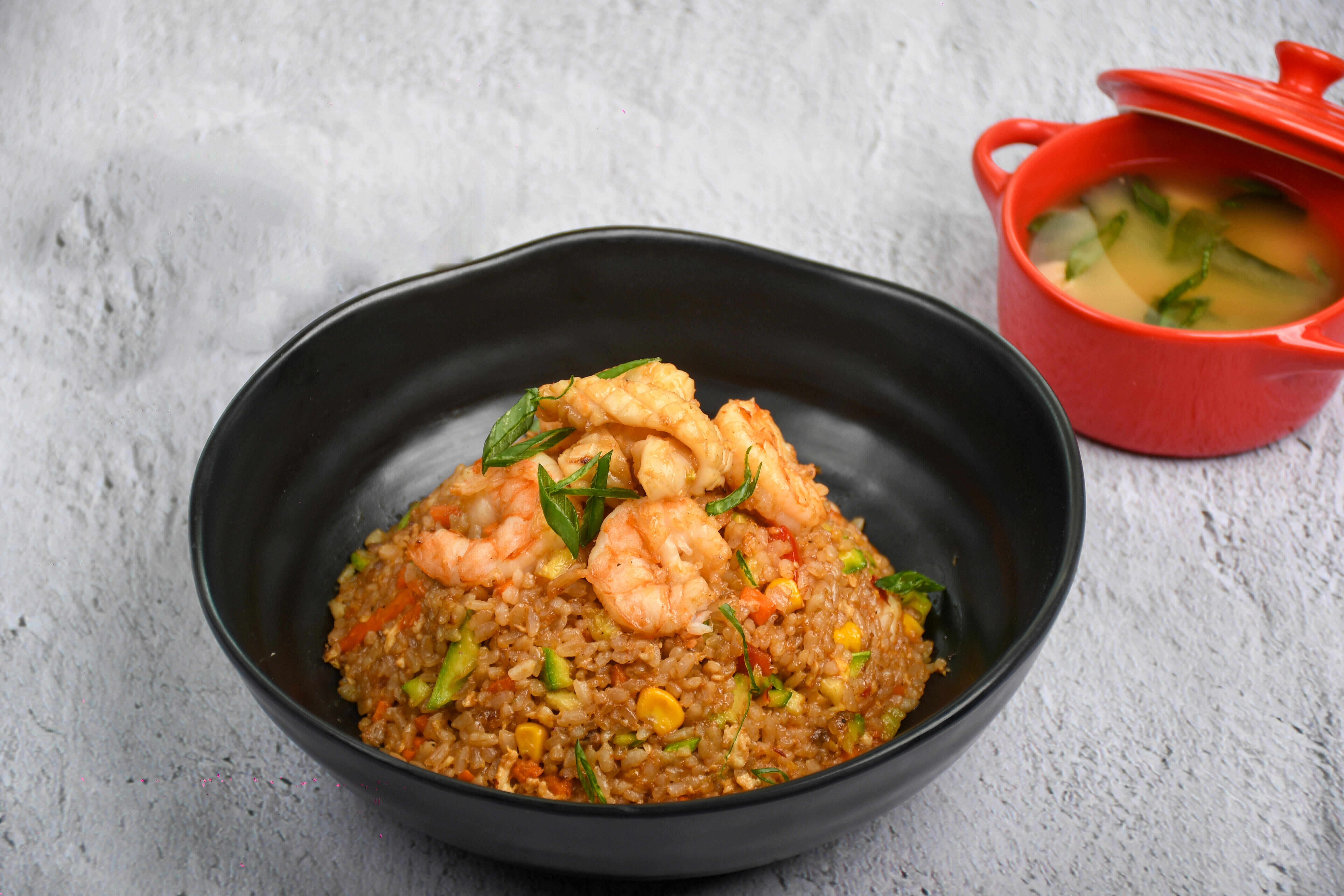 يأتي الرز الأسيوي بصلصة السمك والصويا مع البيض المخفوق او بدونه و رشة من البصل الاخضر مع شوربة الميسو كطبق جانبي