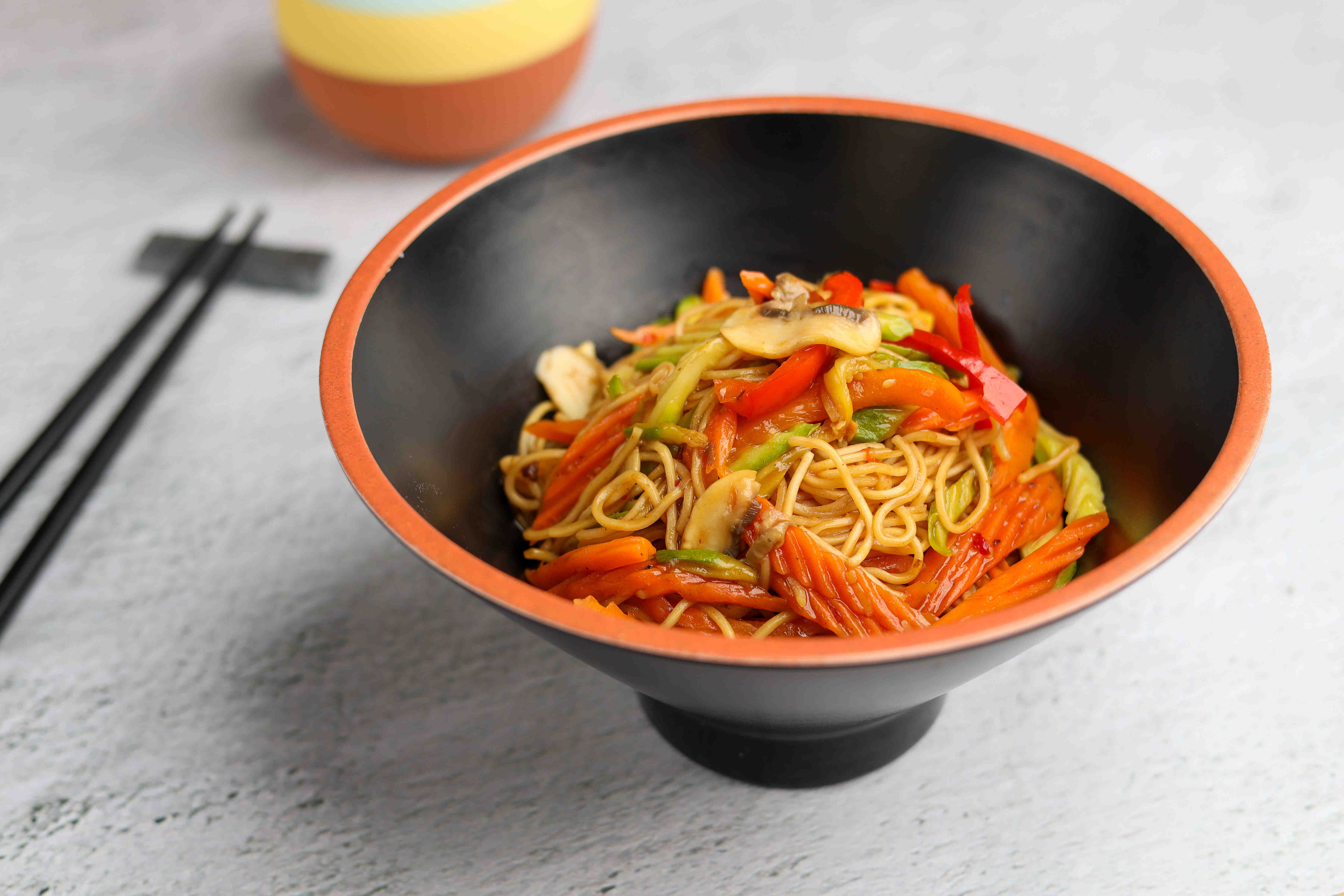 نودلز الخضار الآسيوية مقلية ومطبوخة مع صلصة نودلز خاصة