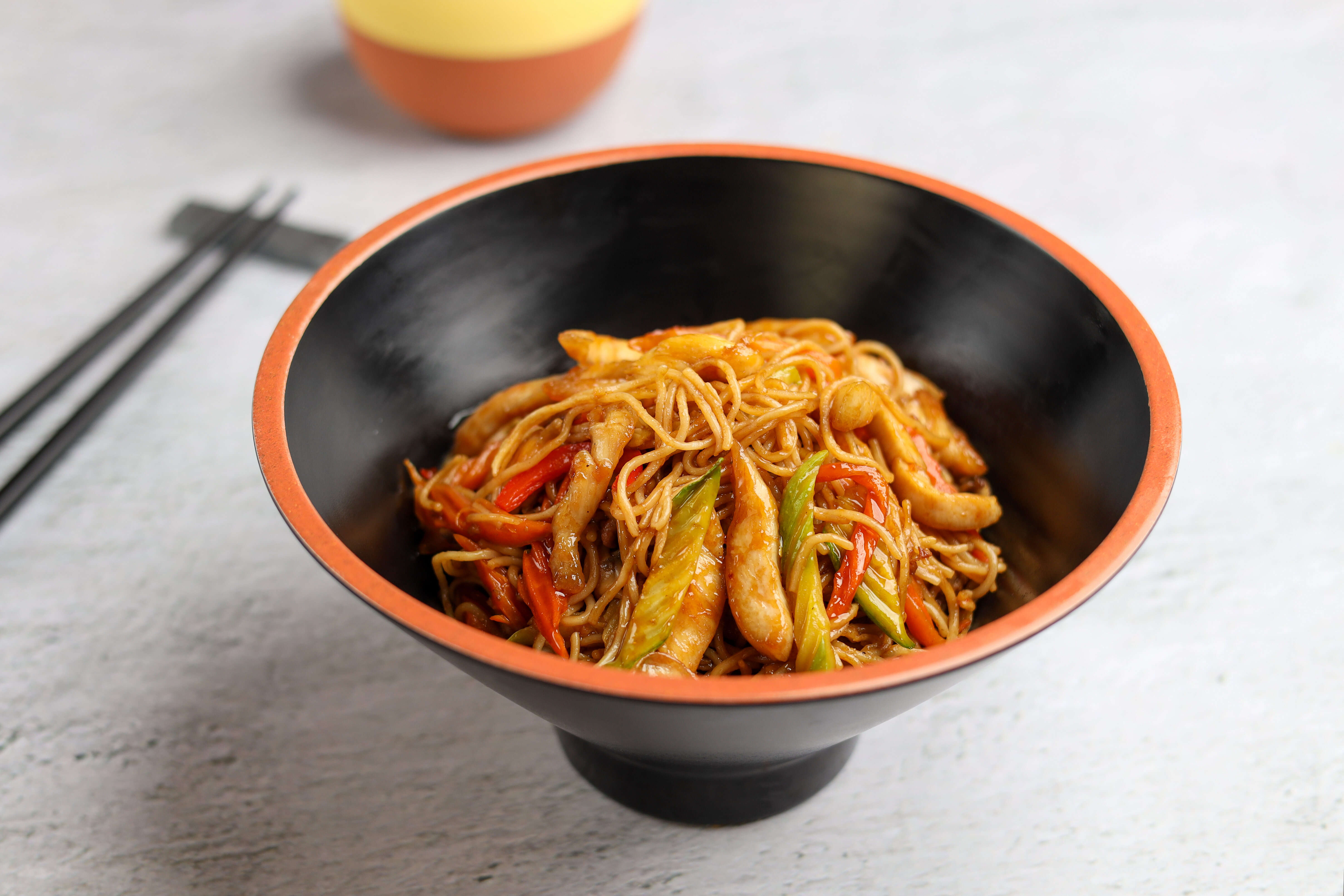 نودلز دجاج الآسيوية مقلية ومطبوخة مع صلصة النودلز الخاصة والخضروات