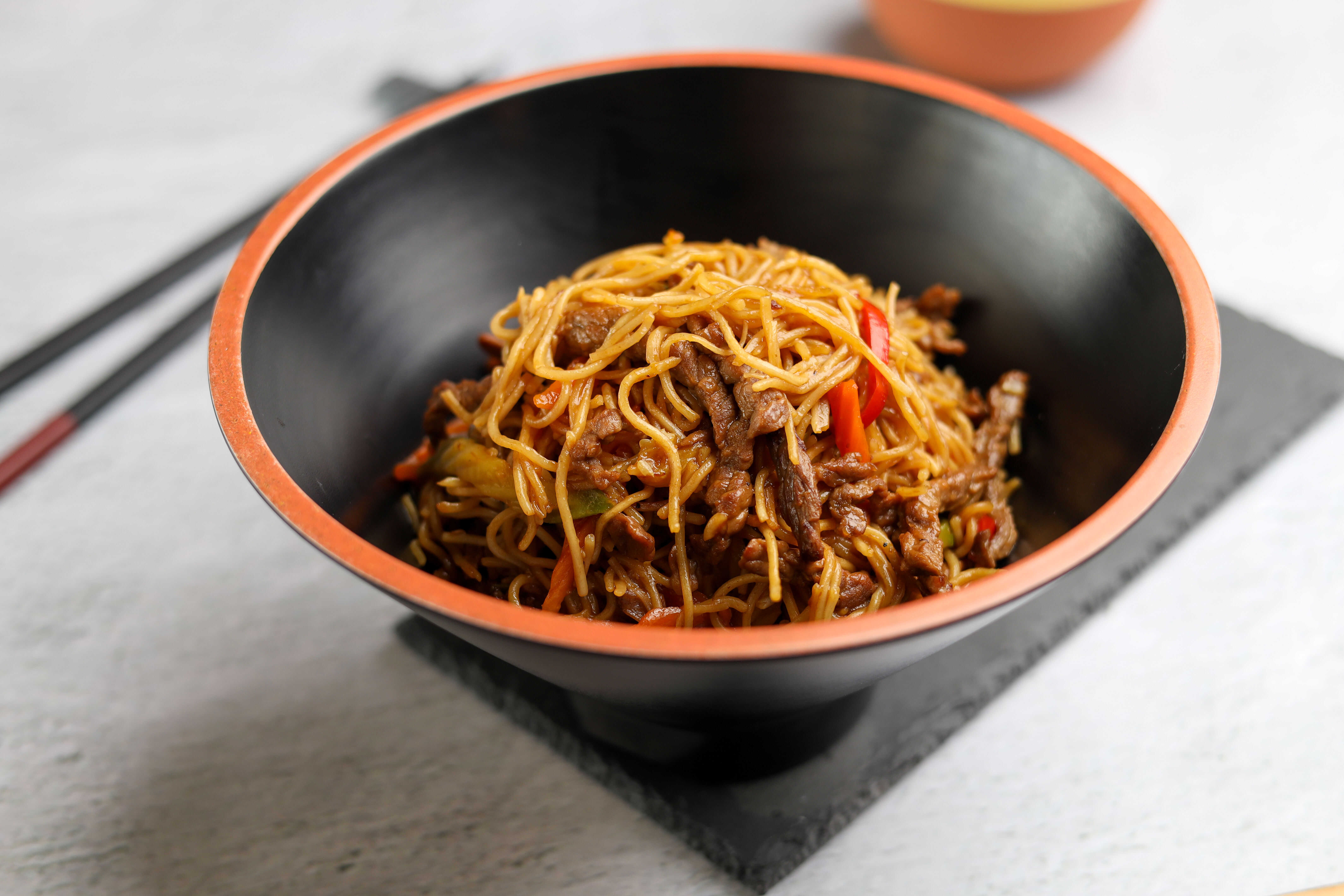نودلز لحم الآسيوية مقلية ومطبوخة مع صلصة النودلز الخاصة والخضروات