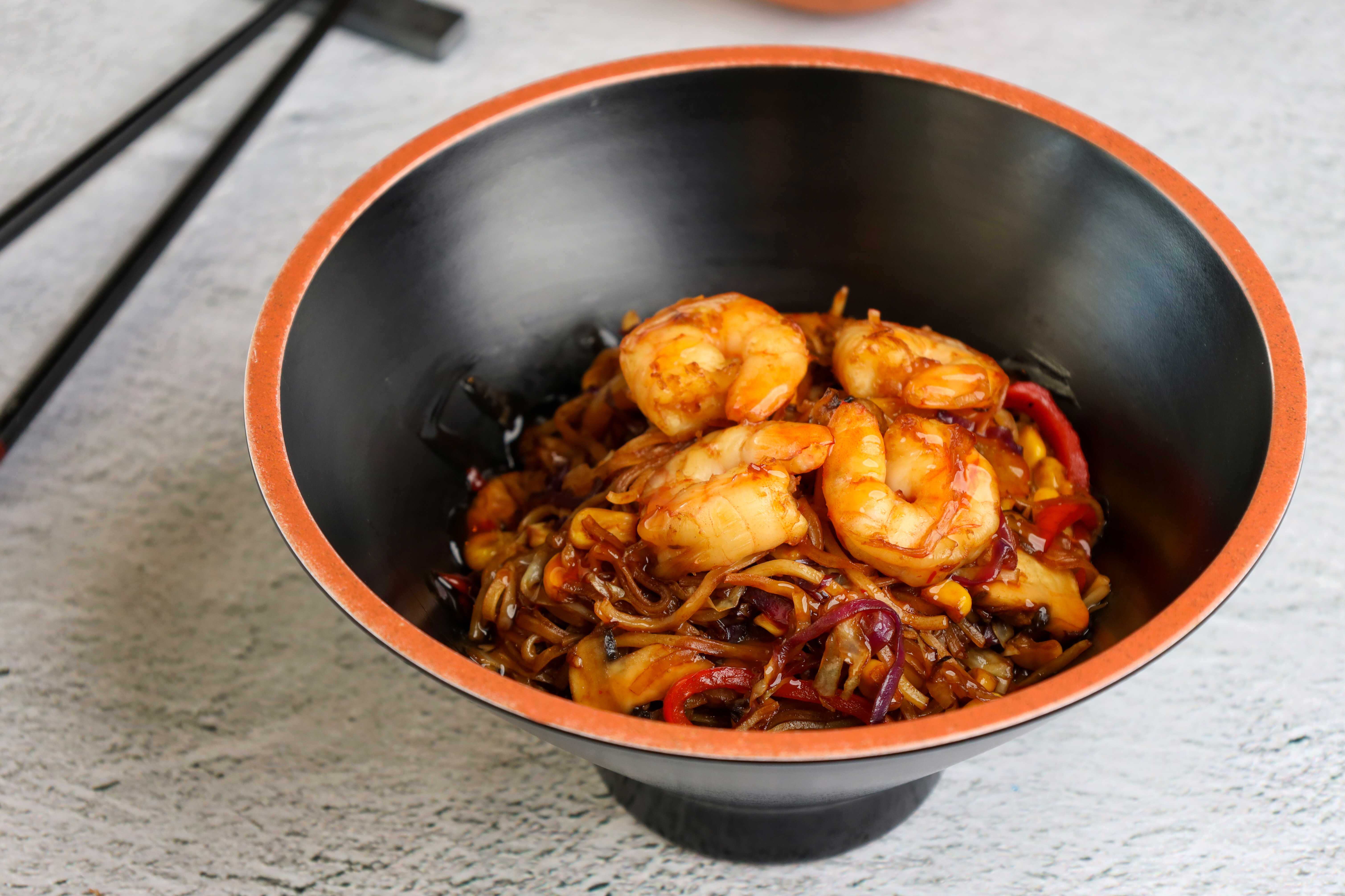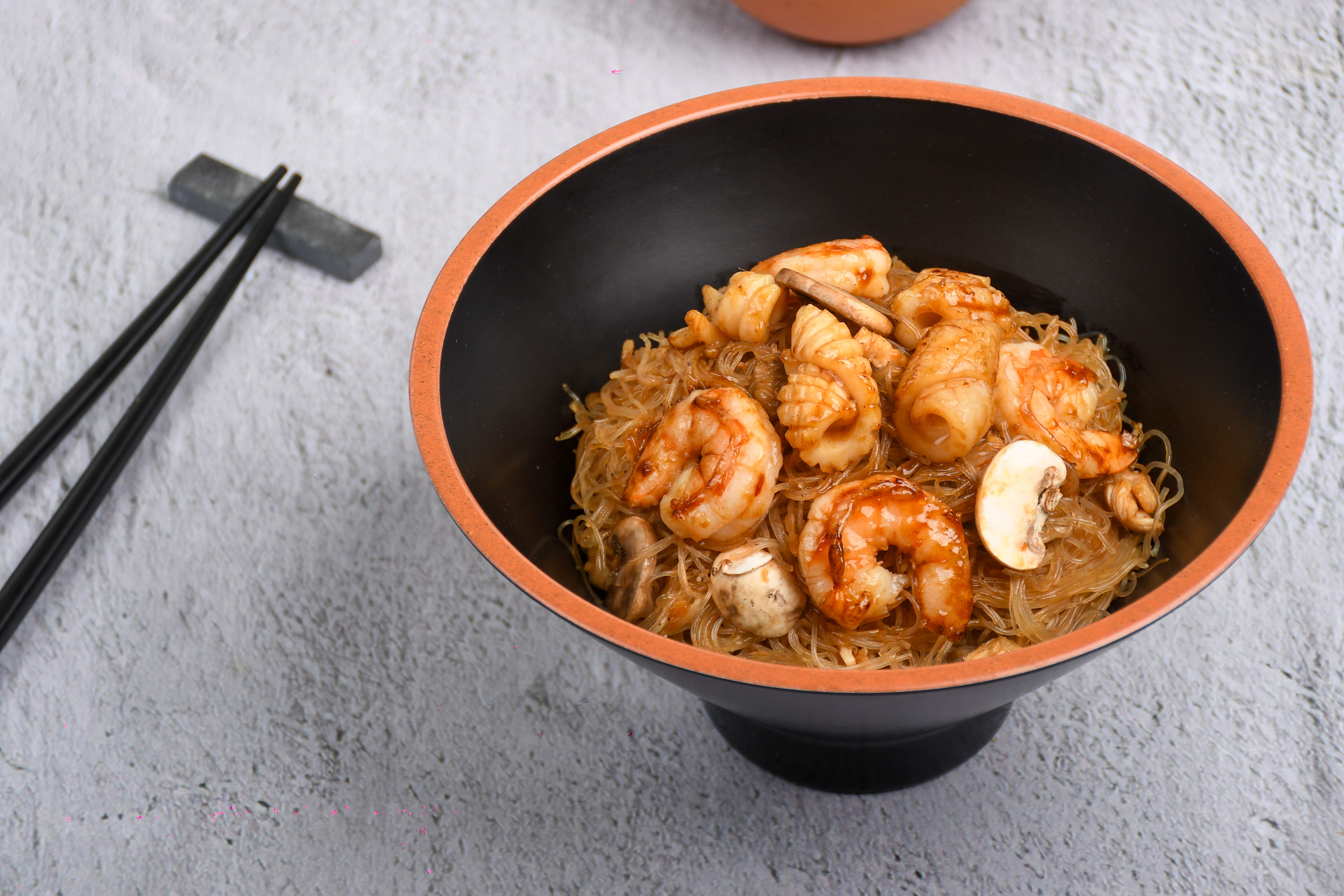 نودلز مأكولات بحرية اسيوية مقلية ومطبوخة مع صلصة النودلز الخاصة والخضروات