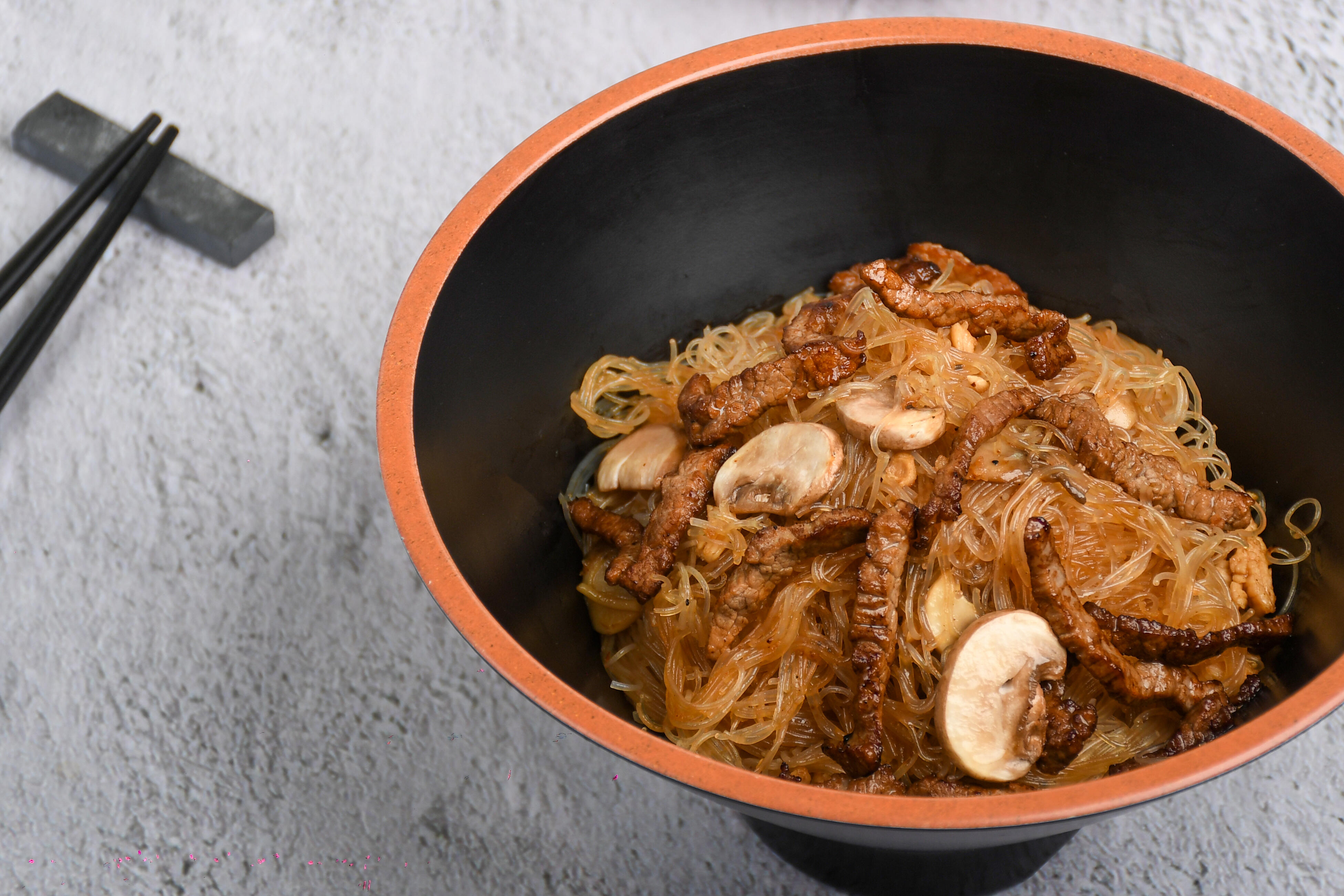 شعيرية الرز الآسيوية باللحم مصنوعة من الأرز الدقيق، وهو ما يفسر سبب تصنيفها أيضًا على أنها نودلز الأرز