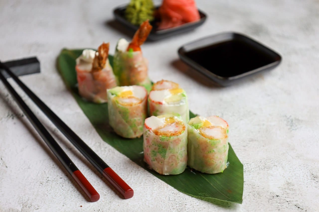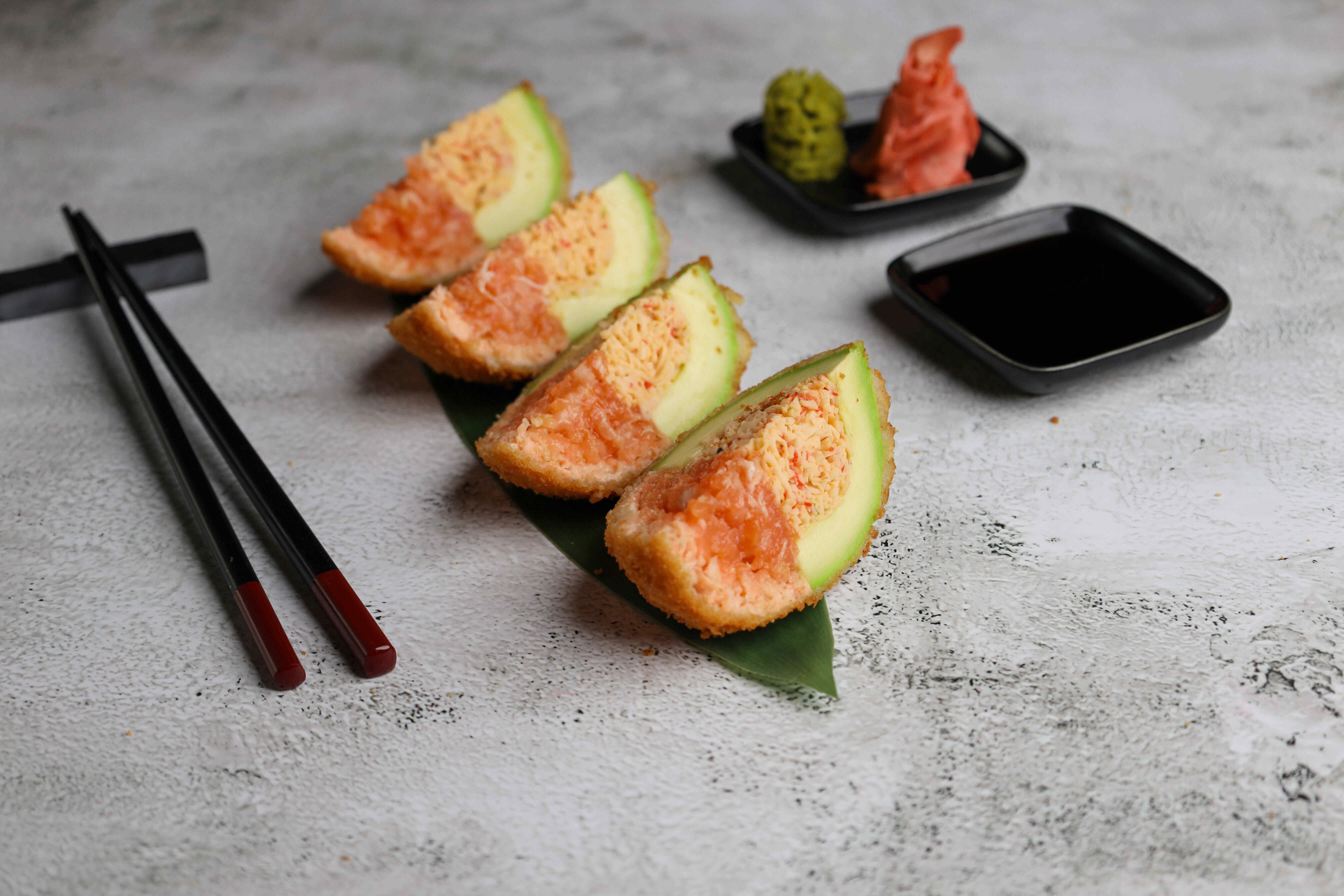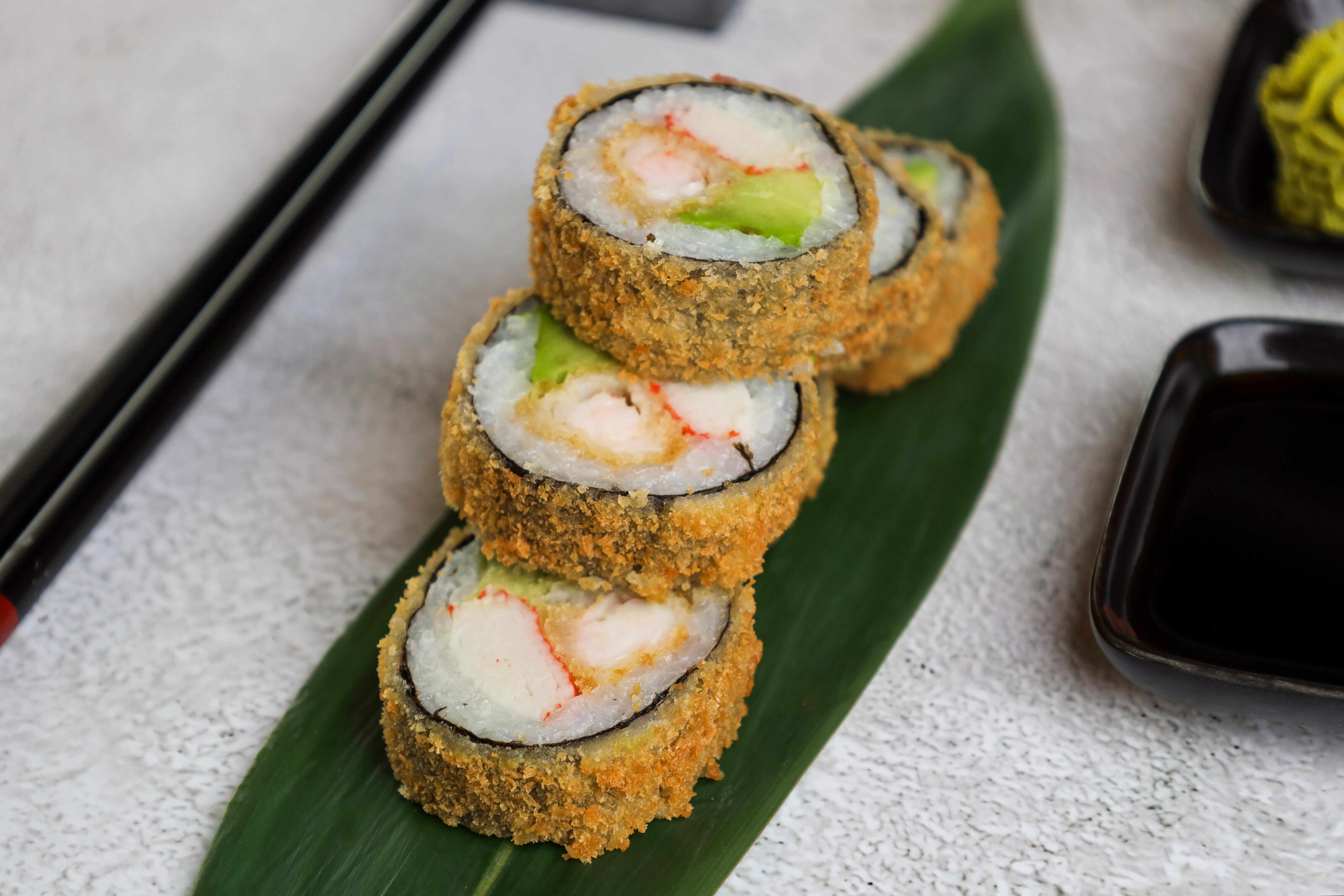 رول مقلي مقرمش من الروبيان تمبورا , السلطعون, افوكادو, جبنة