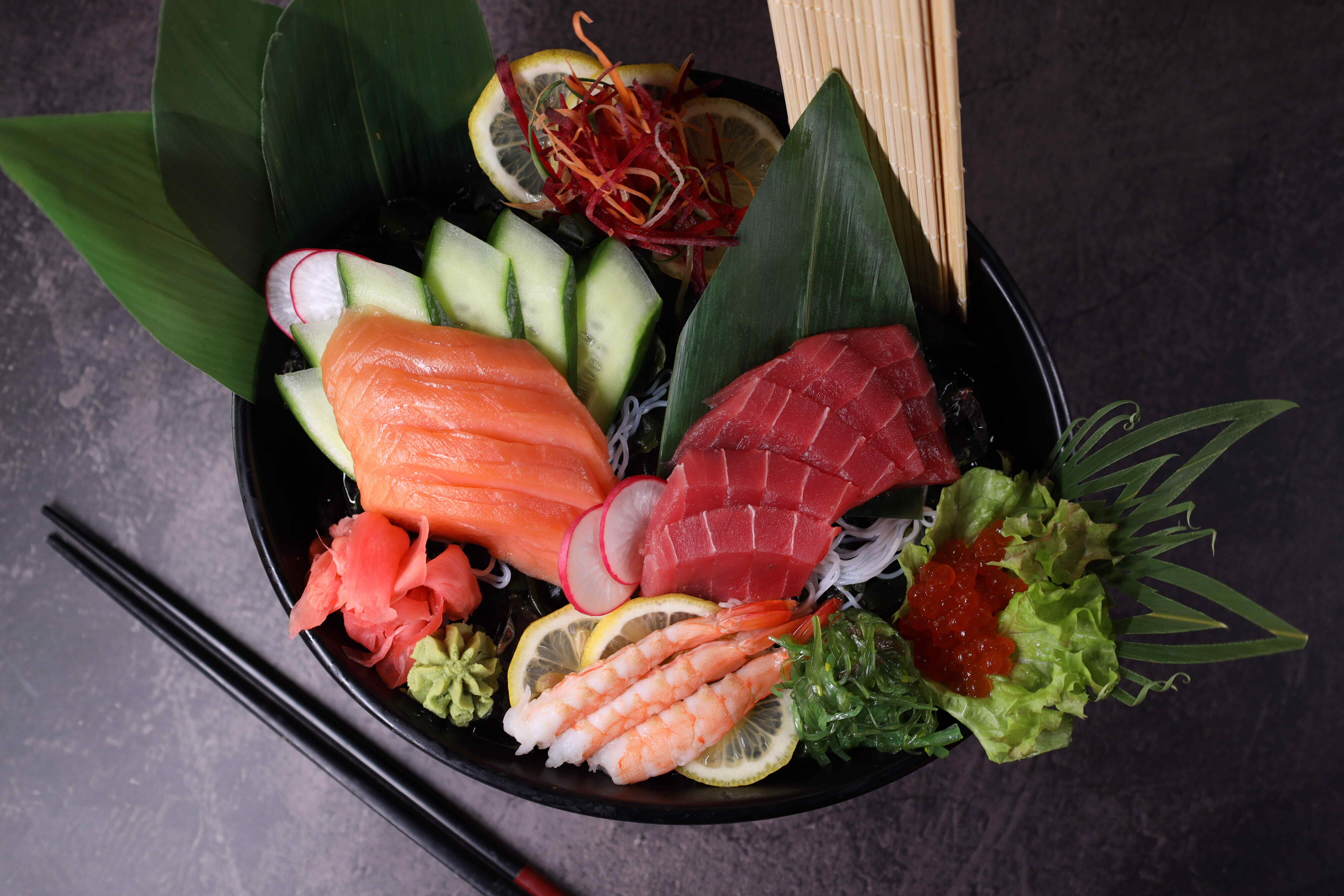 شرائح رقيقة من لحم السلمون النيئ وشرائح التونة الطازجة وروبيان إيبي الطازج، وعادةً ما يأتي بدون أرز ويقدم مع النوري الطازج وعصي الأرز الطازجة وبيض السلمون