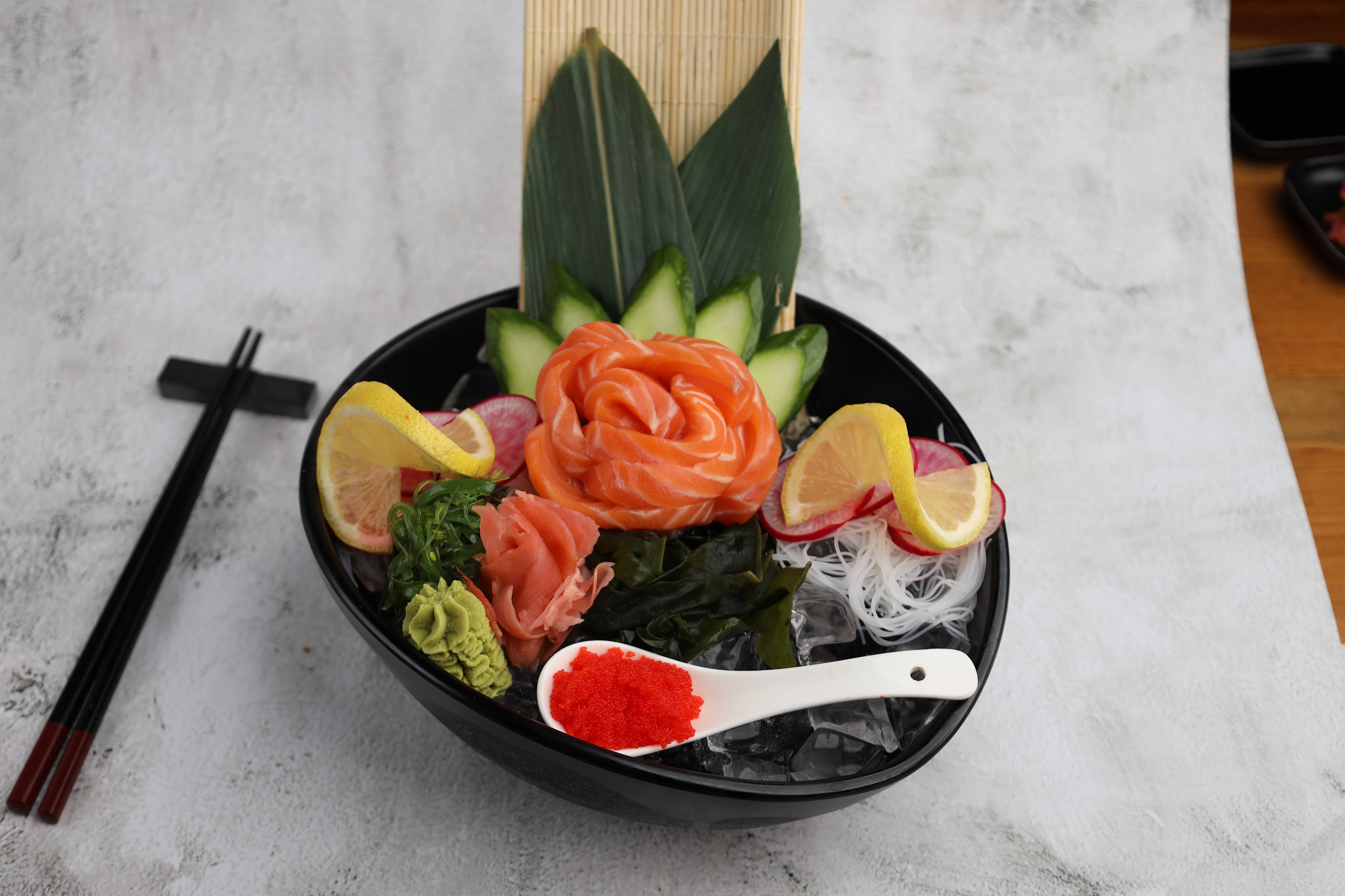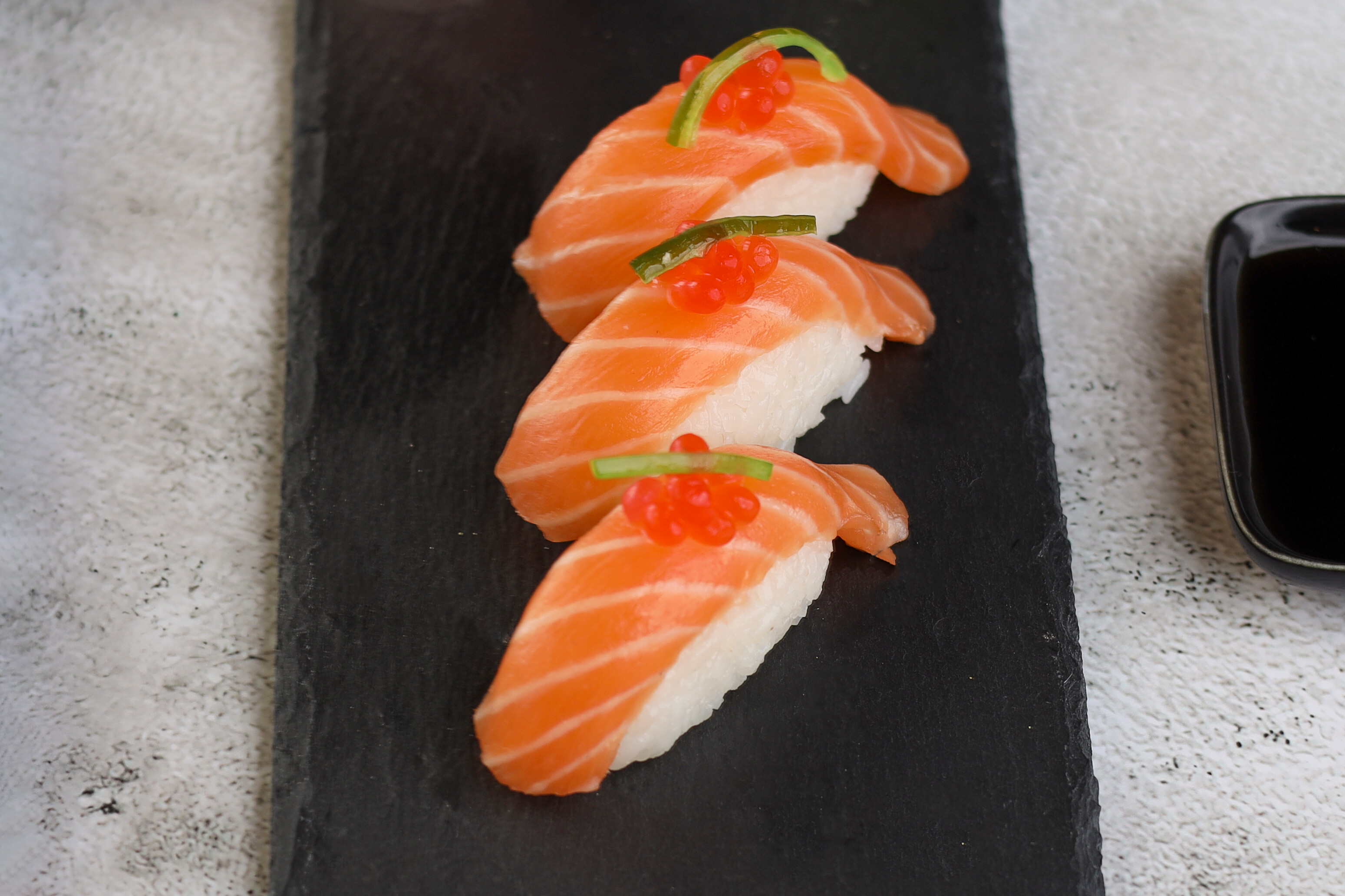 شرائح رقيقة من لحم السلمون النيئ الرقيقة، وعادةً ما يأتي بدون أرز ويقدم مع النوري الطازج وعصي الأرز الطازجة وبيض السلمون