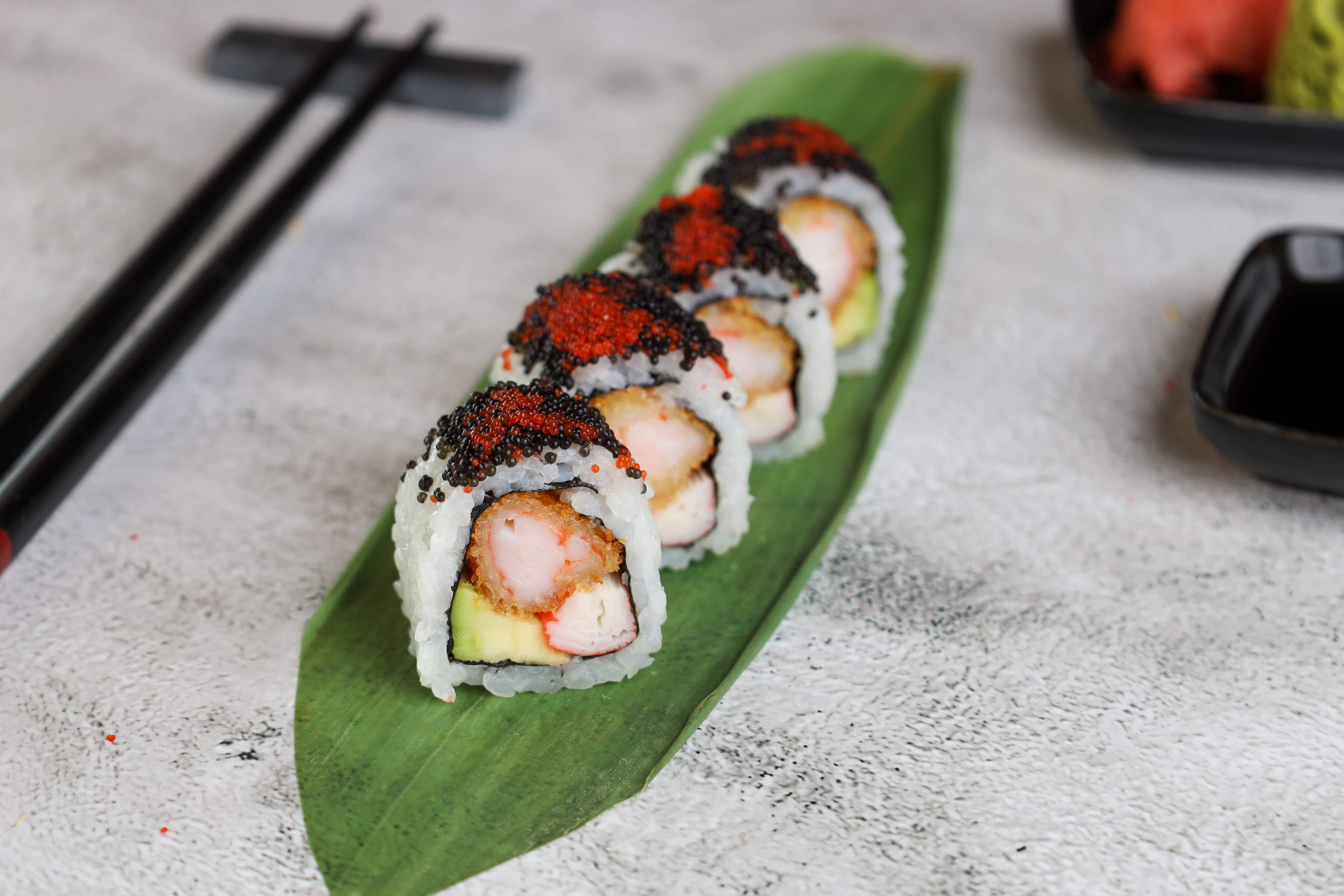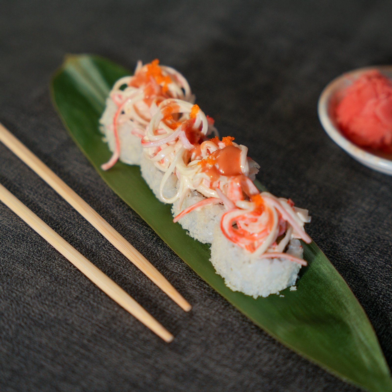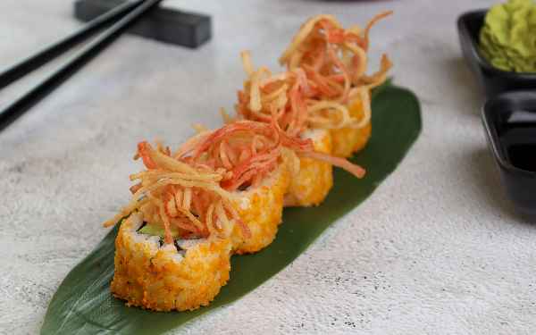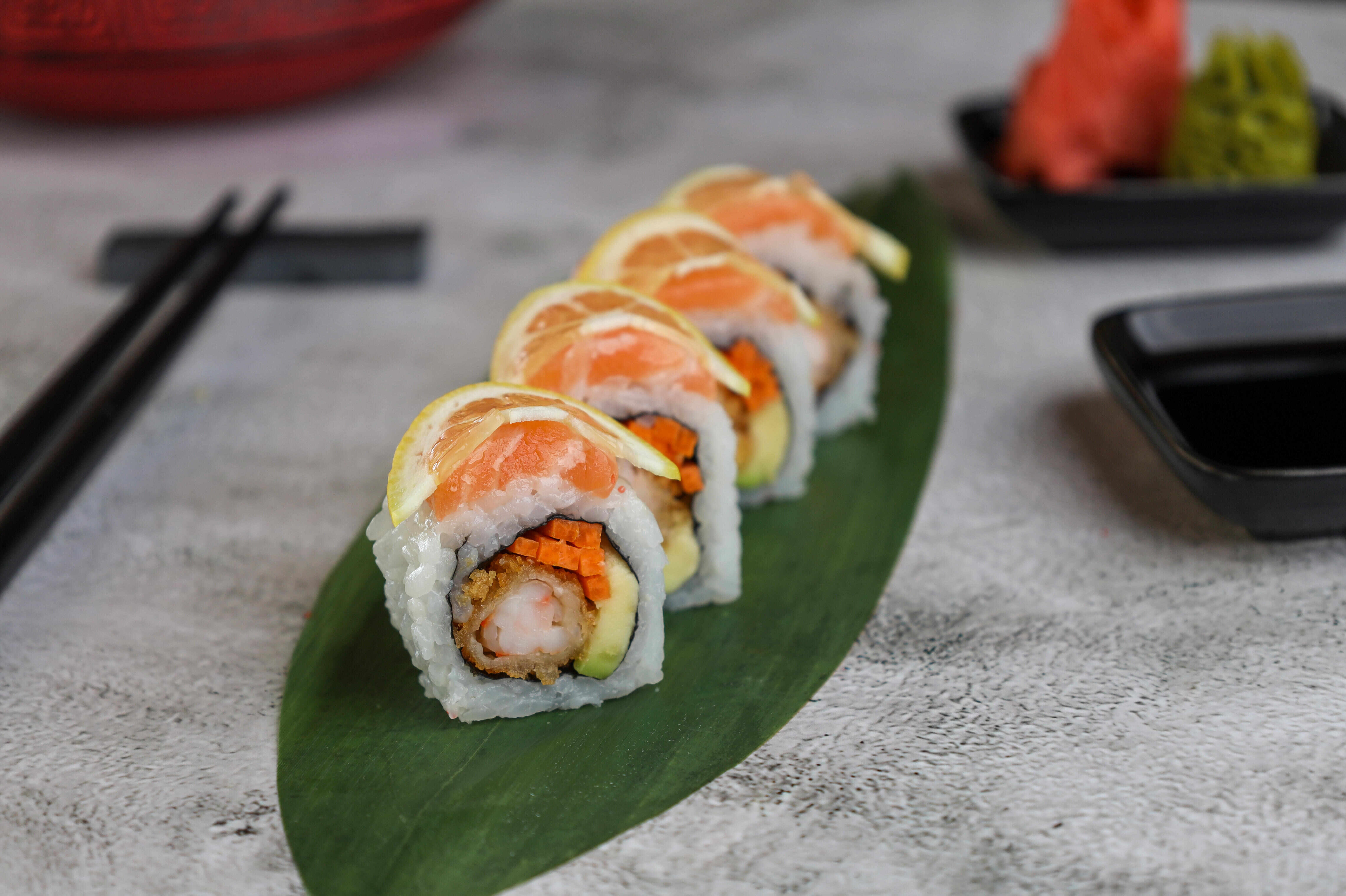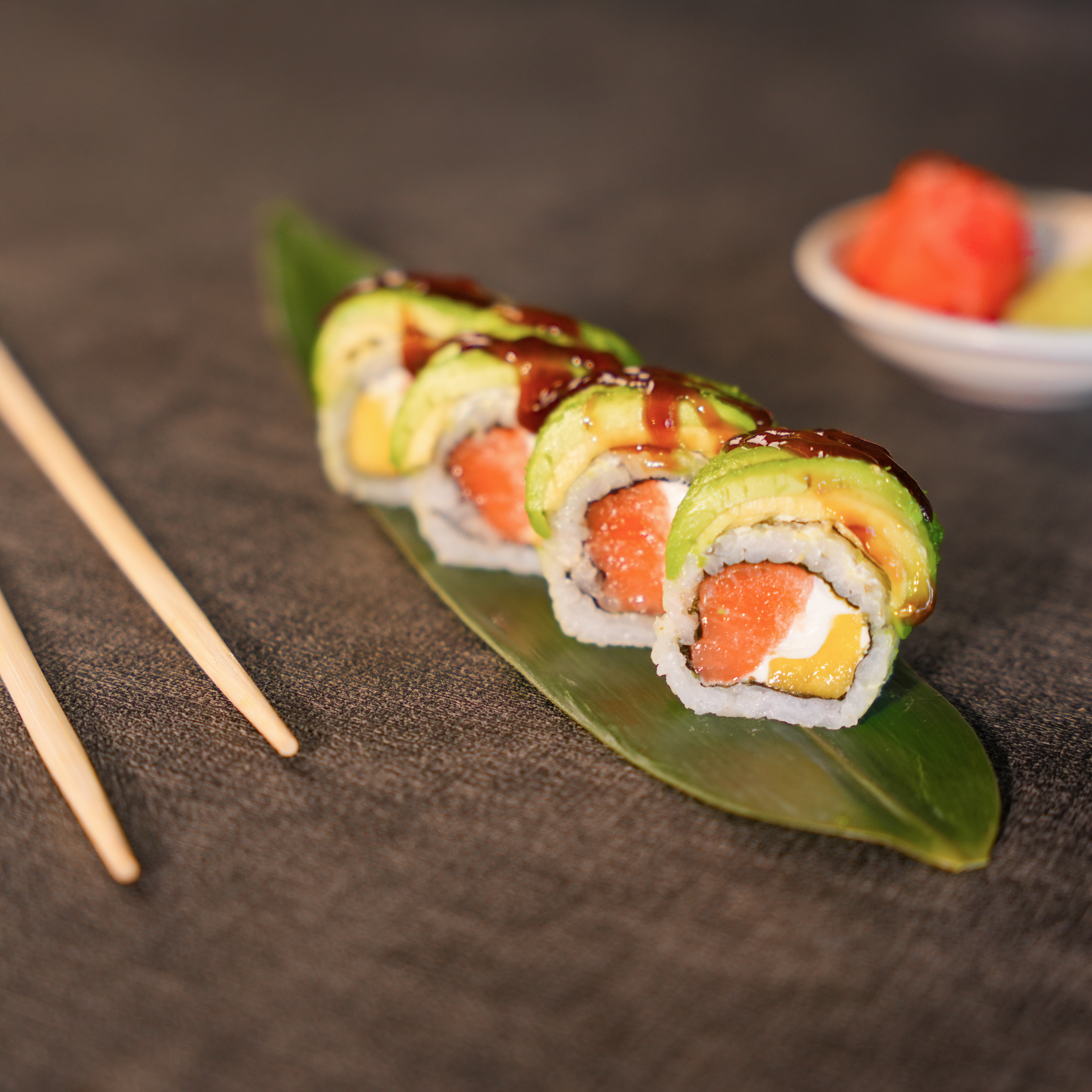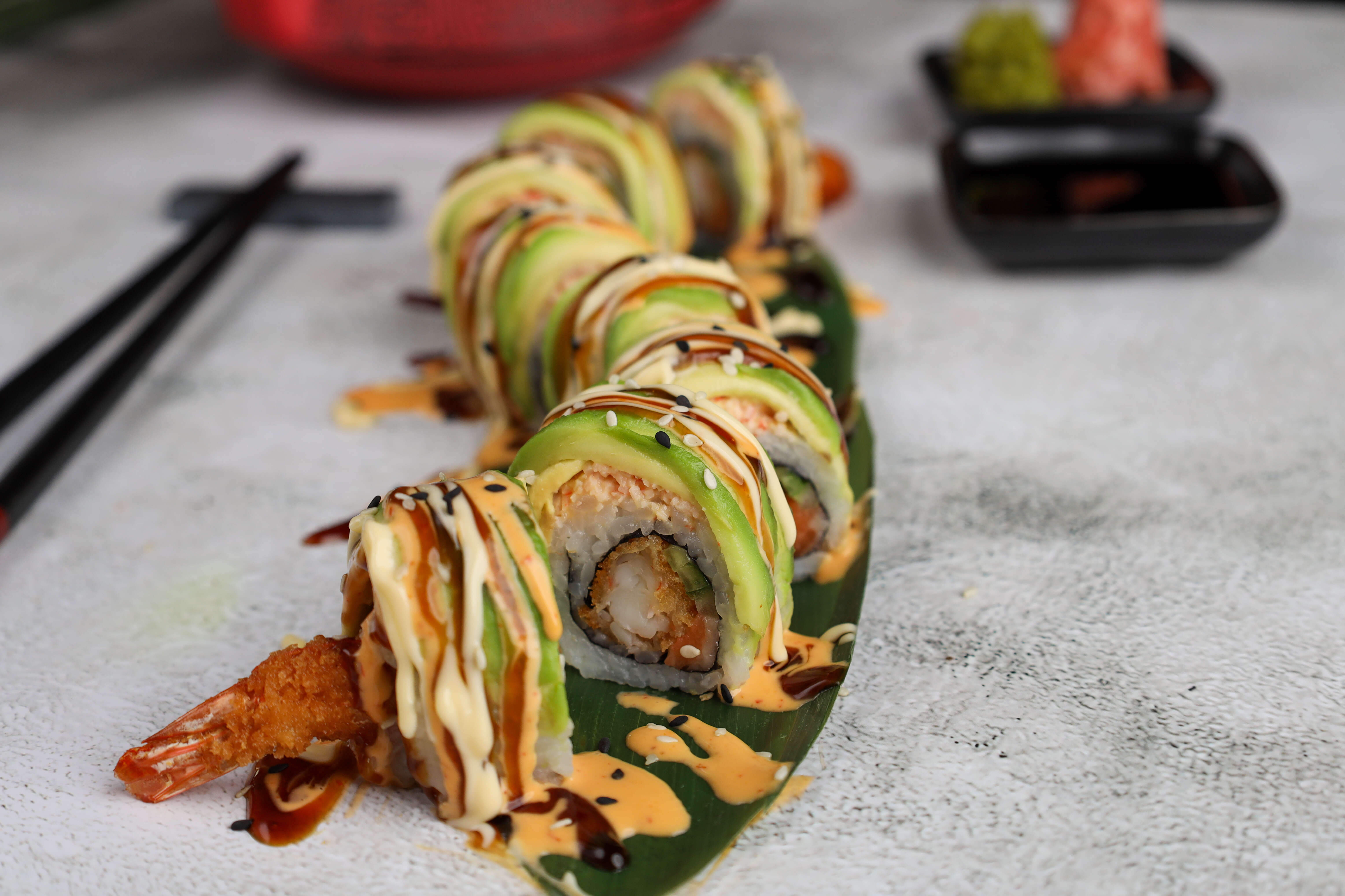 سوشي التنين؟ عبارة عن رول خاصة محشوة بأوراق نوري ملفوفة حول المكونات من الداخل وأرز السوشي من الخارج. هنا، يتم وضع سمك السلمون وتيمبورا الروبيان والخيار داخل النوري، وفي الأعلى مغطى بسرطان البحر والأفوكادو . يرش المايونيز والصلصة الحارة وصلصة أوناجي، مما