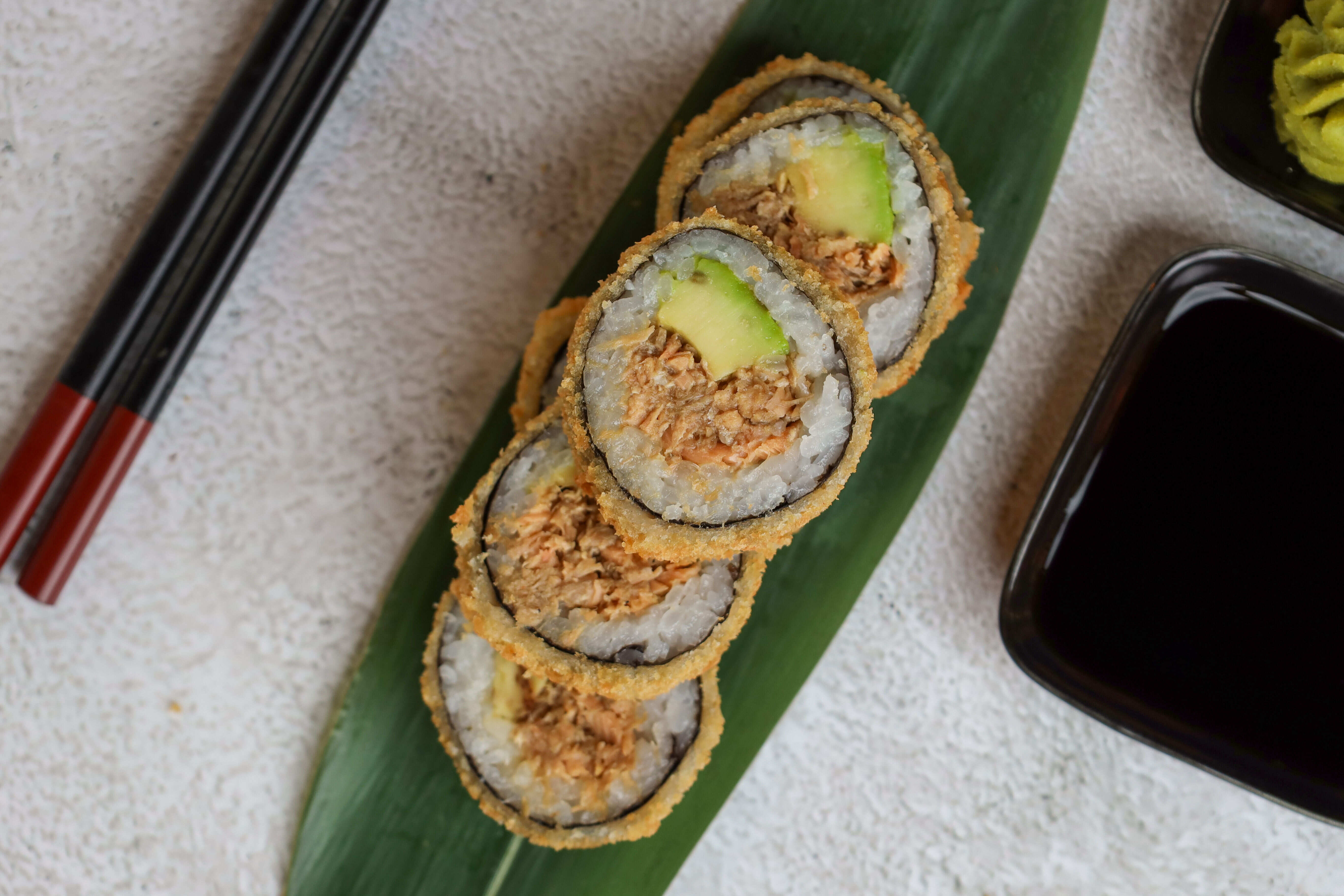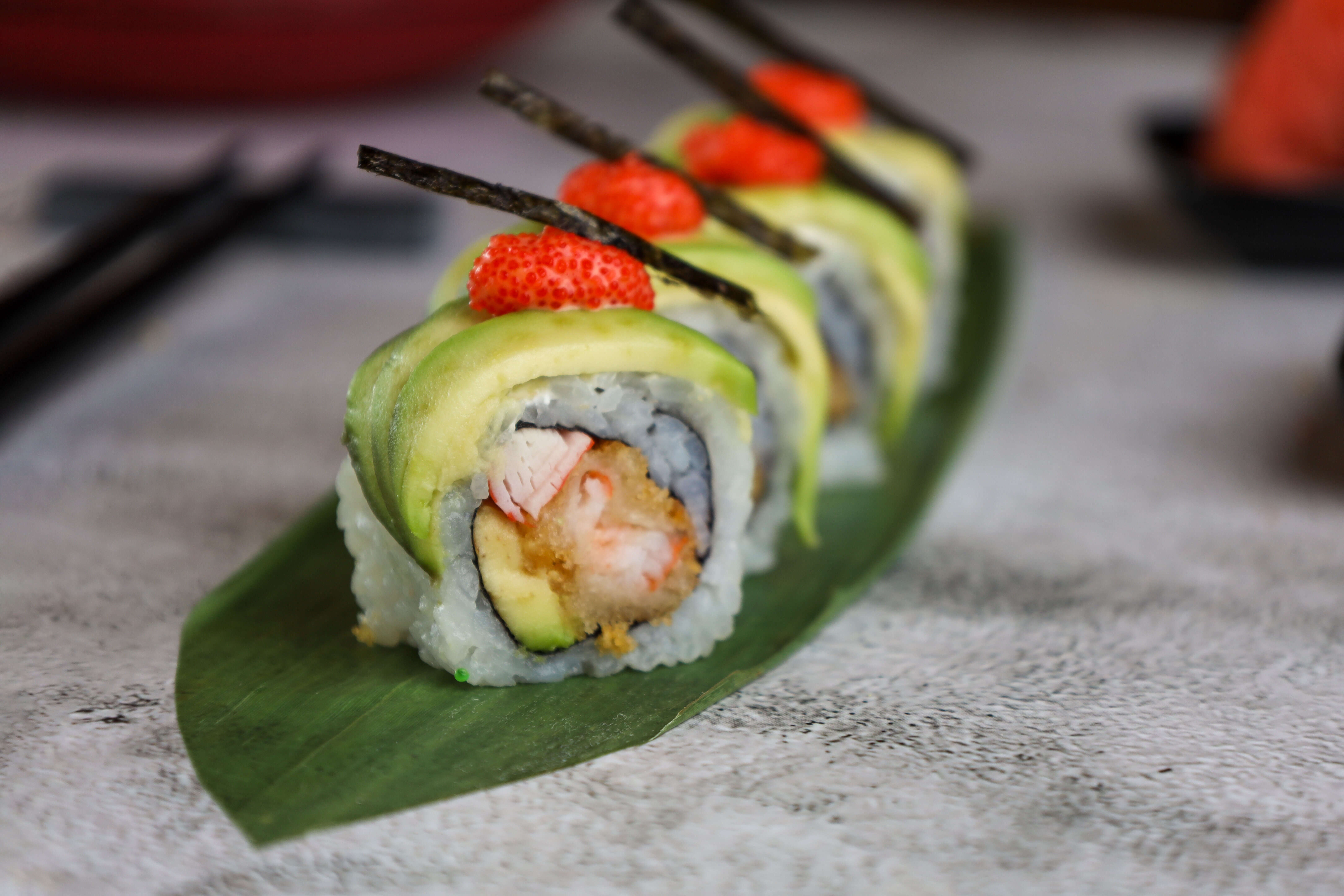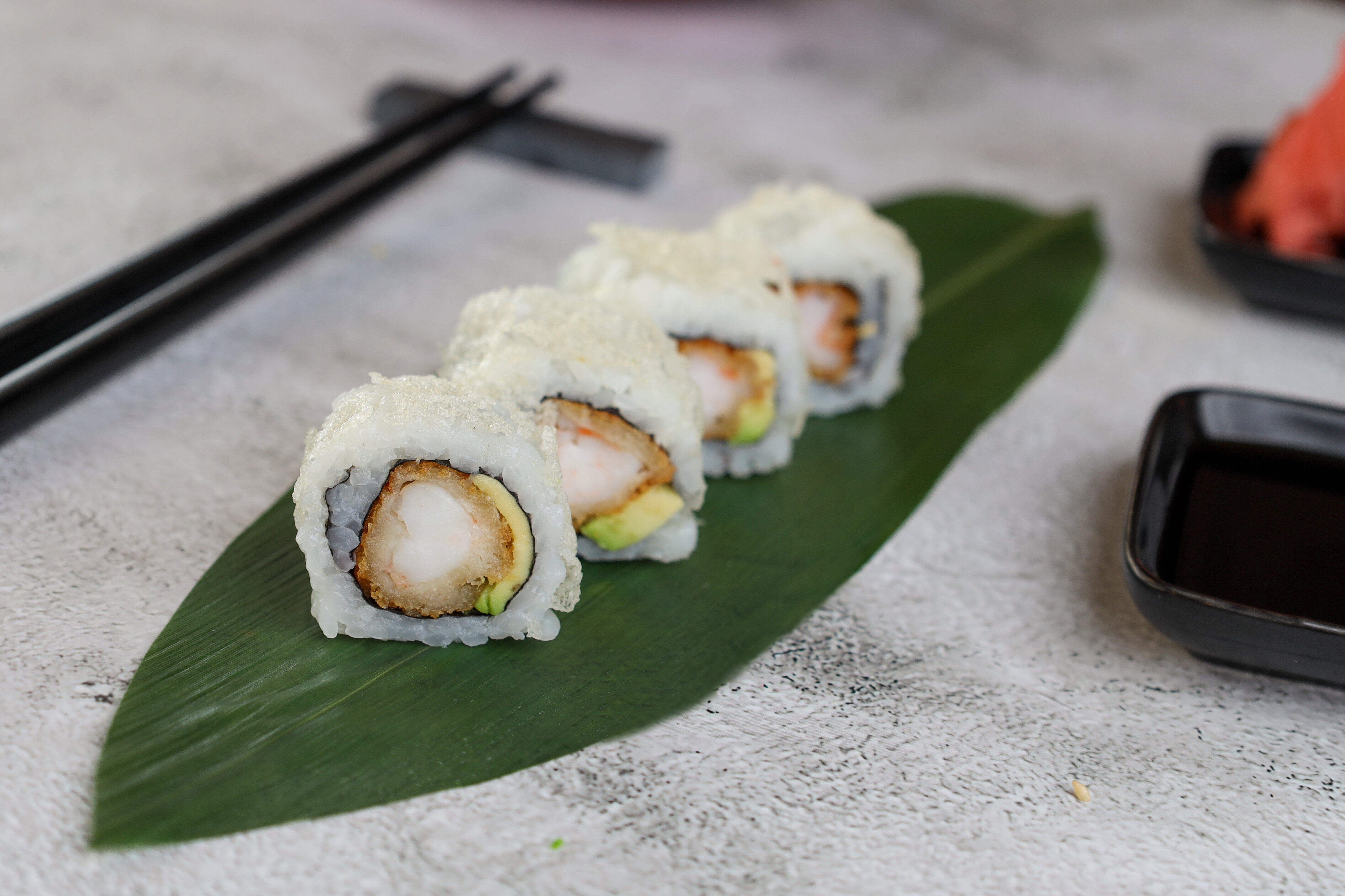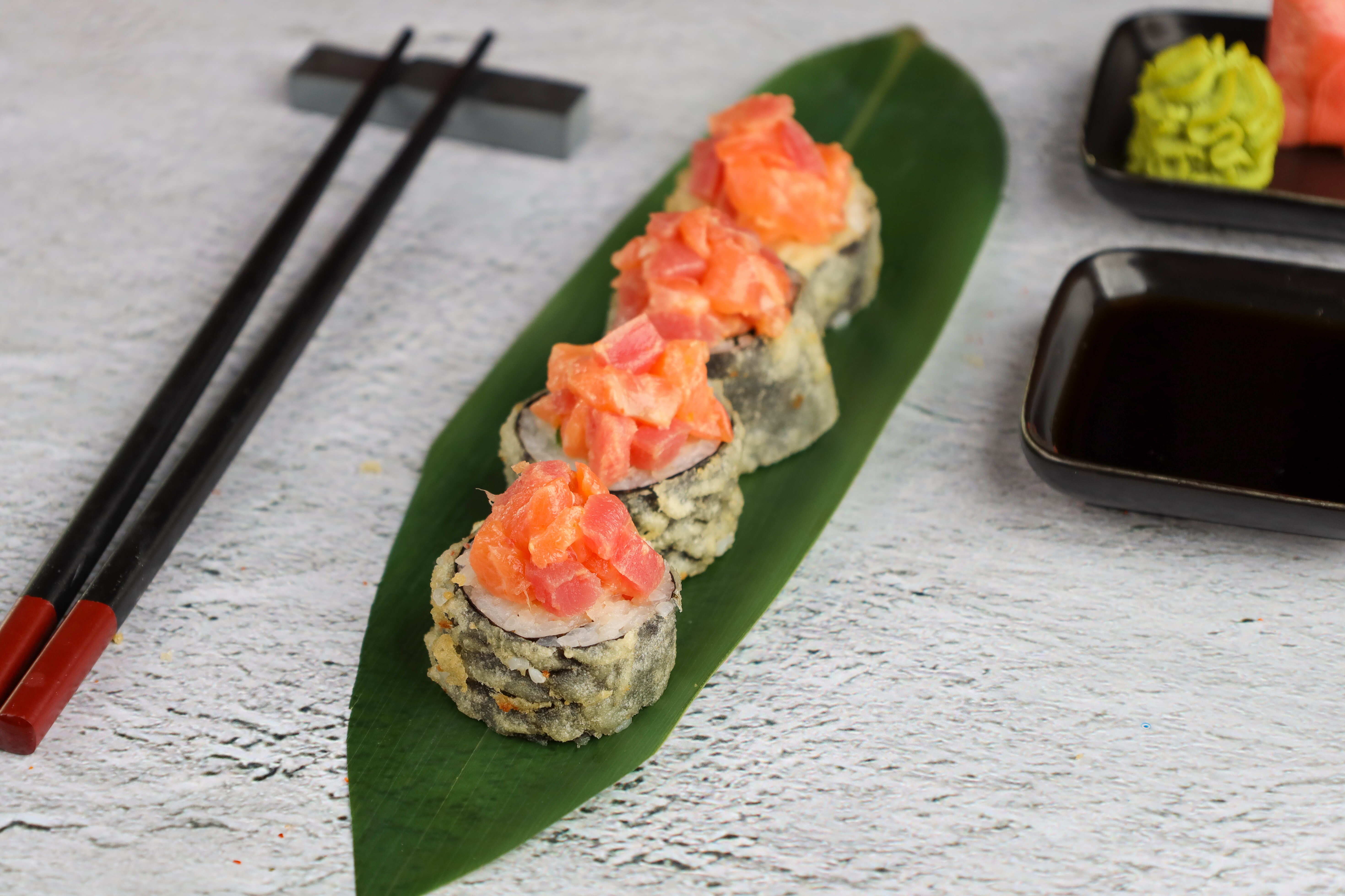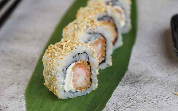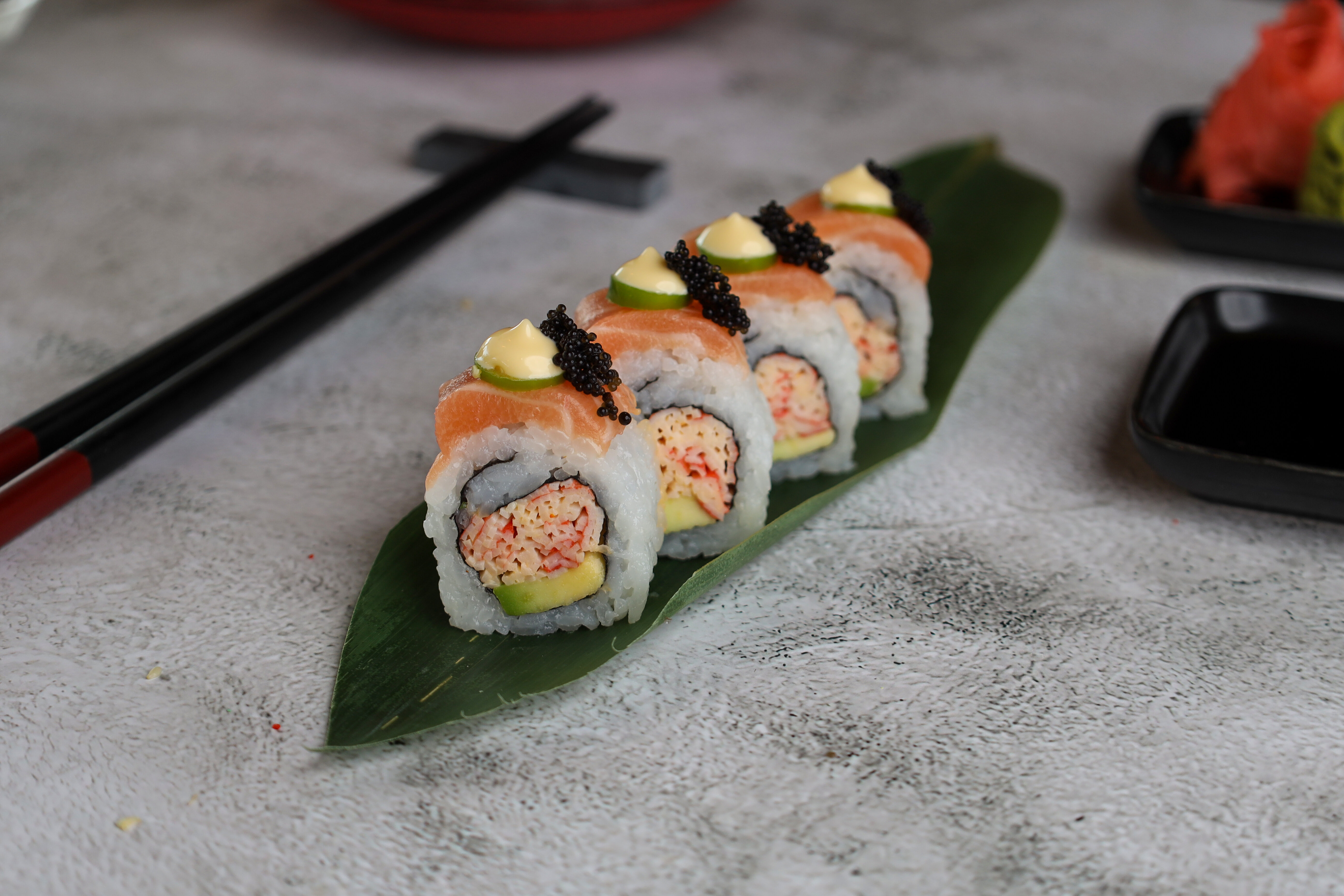 سوشي التنين؟ عبارة عن رول خاصة محشوة بأوراق نوري ملفوفة حول المكونات من الداخل وأرز السوشي من الخارج. هنا، يتم وضع سمك السلمون وتيمبورا الروبيان والخيار داخل النوري، وفي الأعلى مغطى بسرطان البحر والأفوكادو . يرش المايونيز والصلصة الحارة وصلصة أوناجي، مما