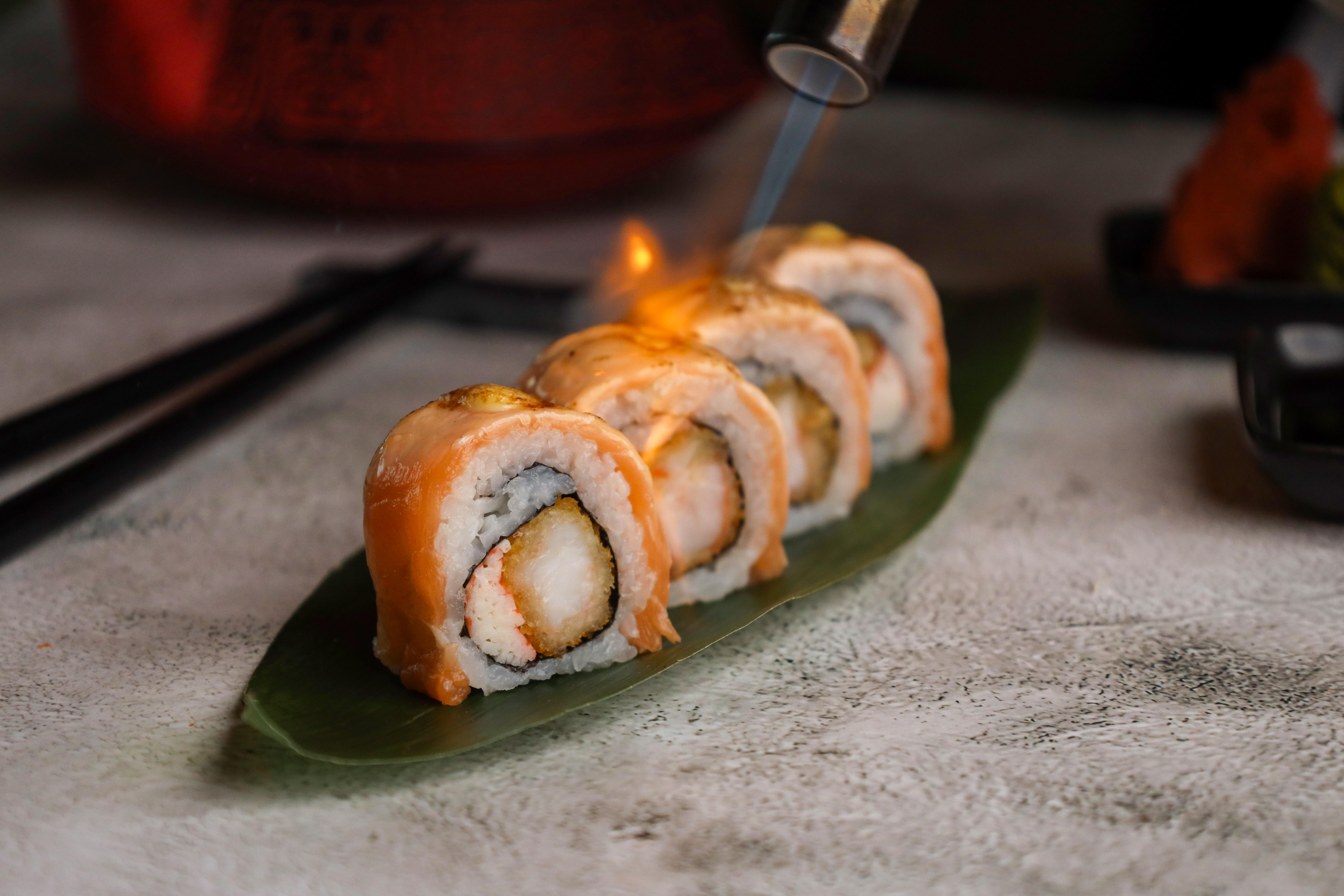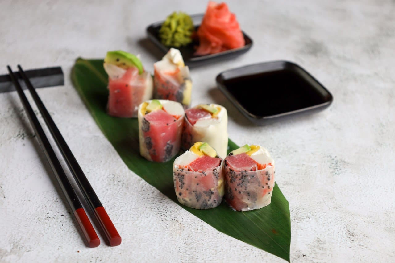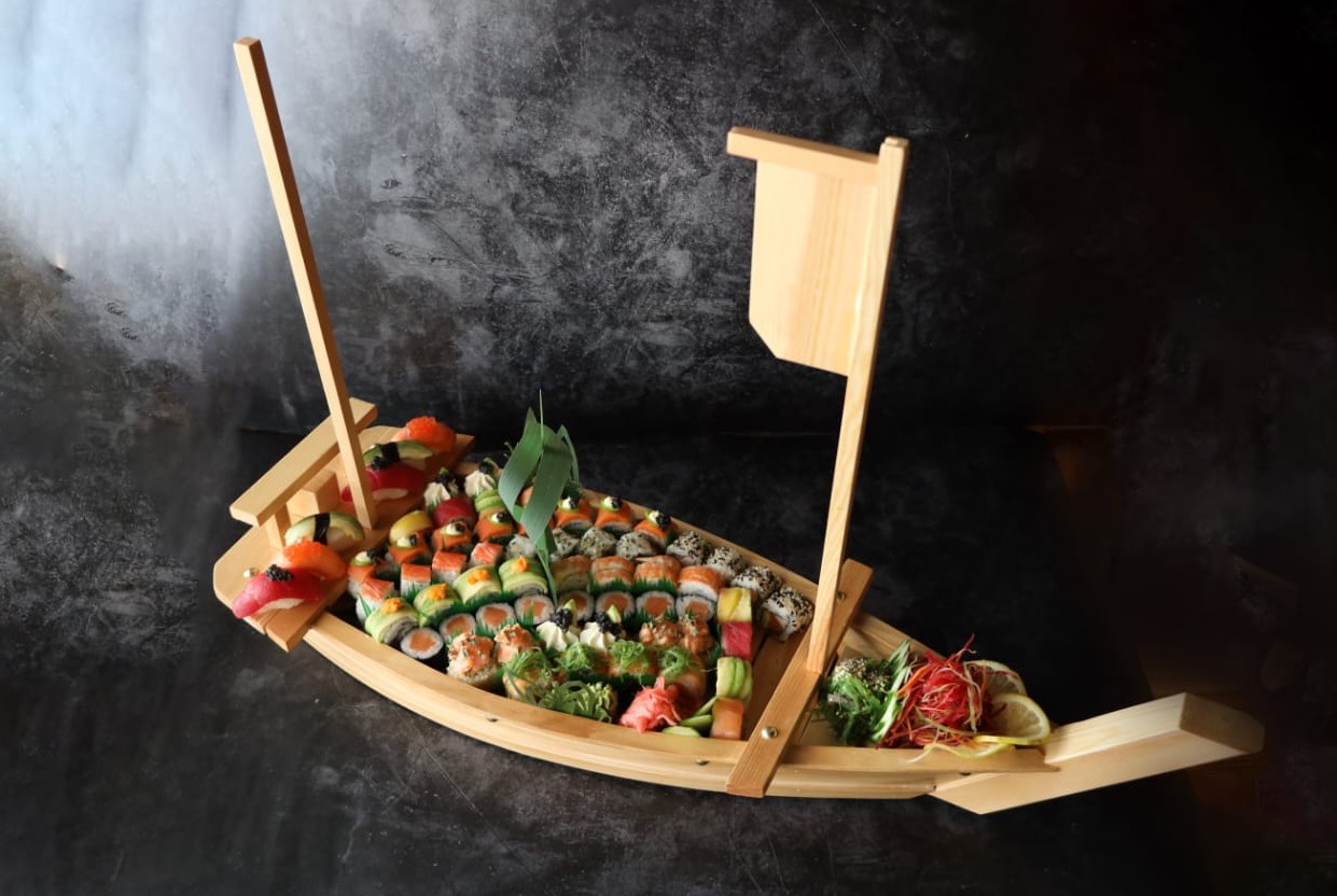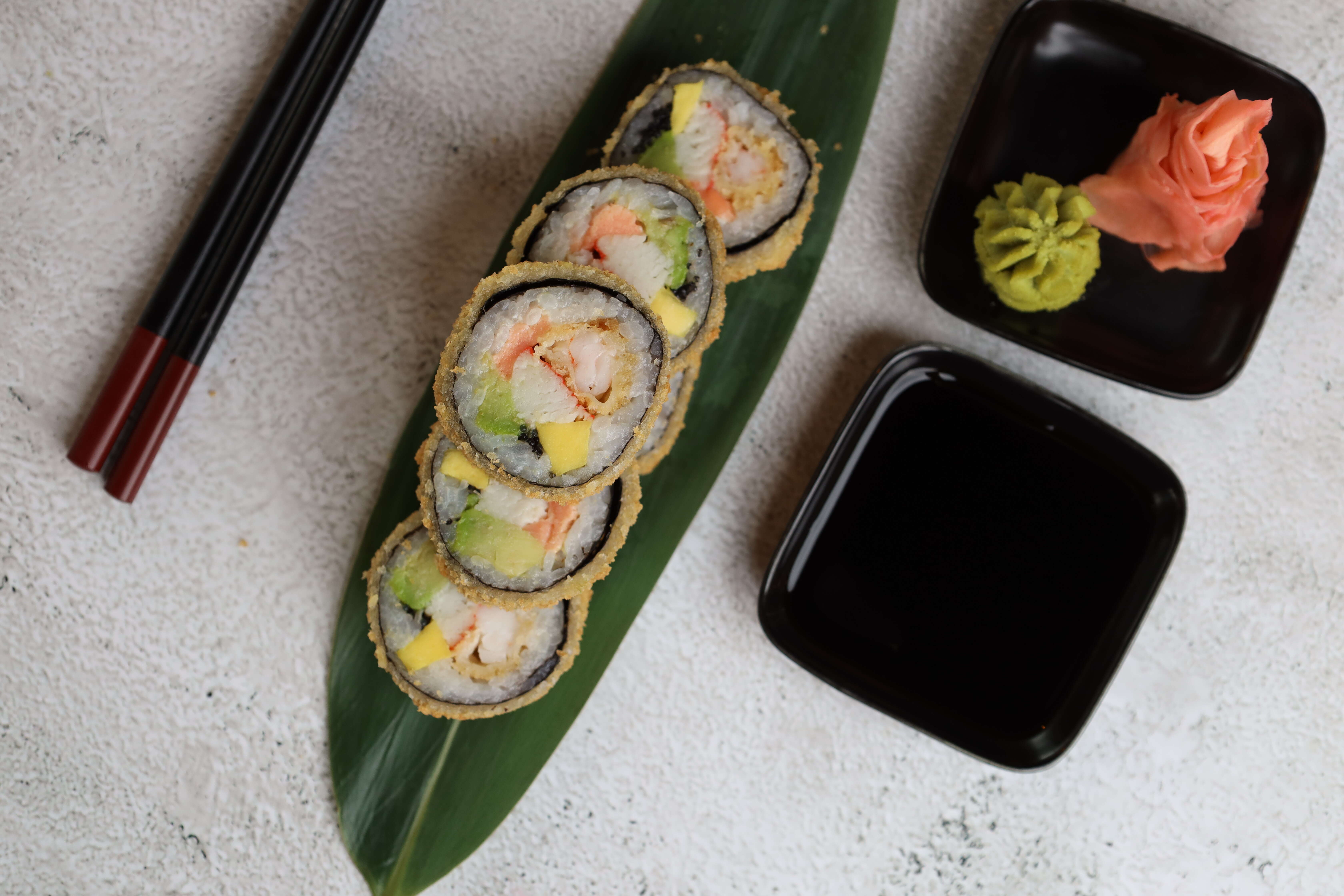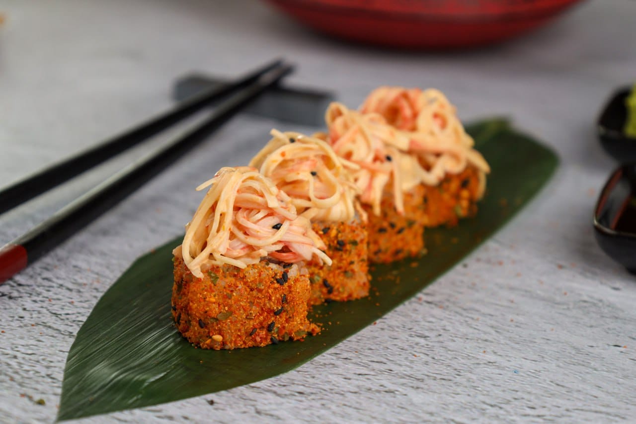 سوشي التنين؟ عبارة عن رول خاصة محشوة بأوراق نوري ملفوفة حول المكونات من الداخل وأرز السوشي من الخارج. هنا، يتم وضع سمك السلمون وتيمبورا الروبيان والخيار داخل النوري، وفي الأعلى مغطى بسرطان البحر والأفوكادو . يرش المايونيز والصلصة الحارة وصلصة أوناجي، مما