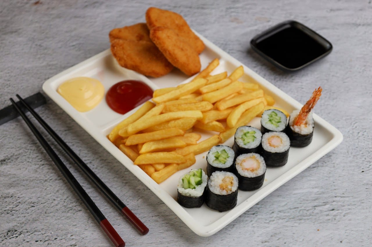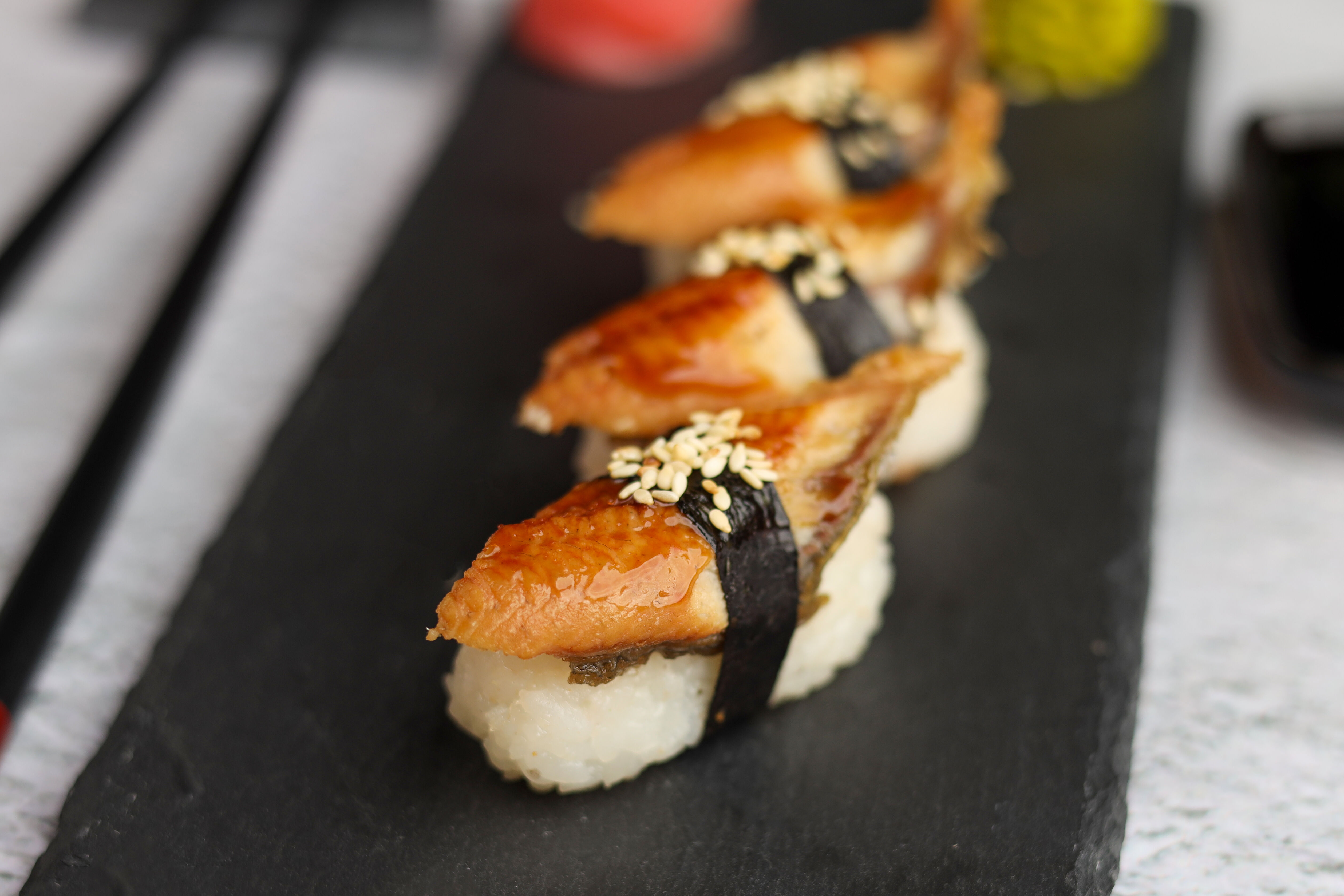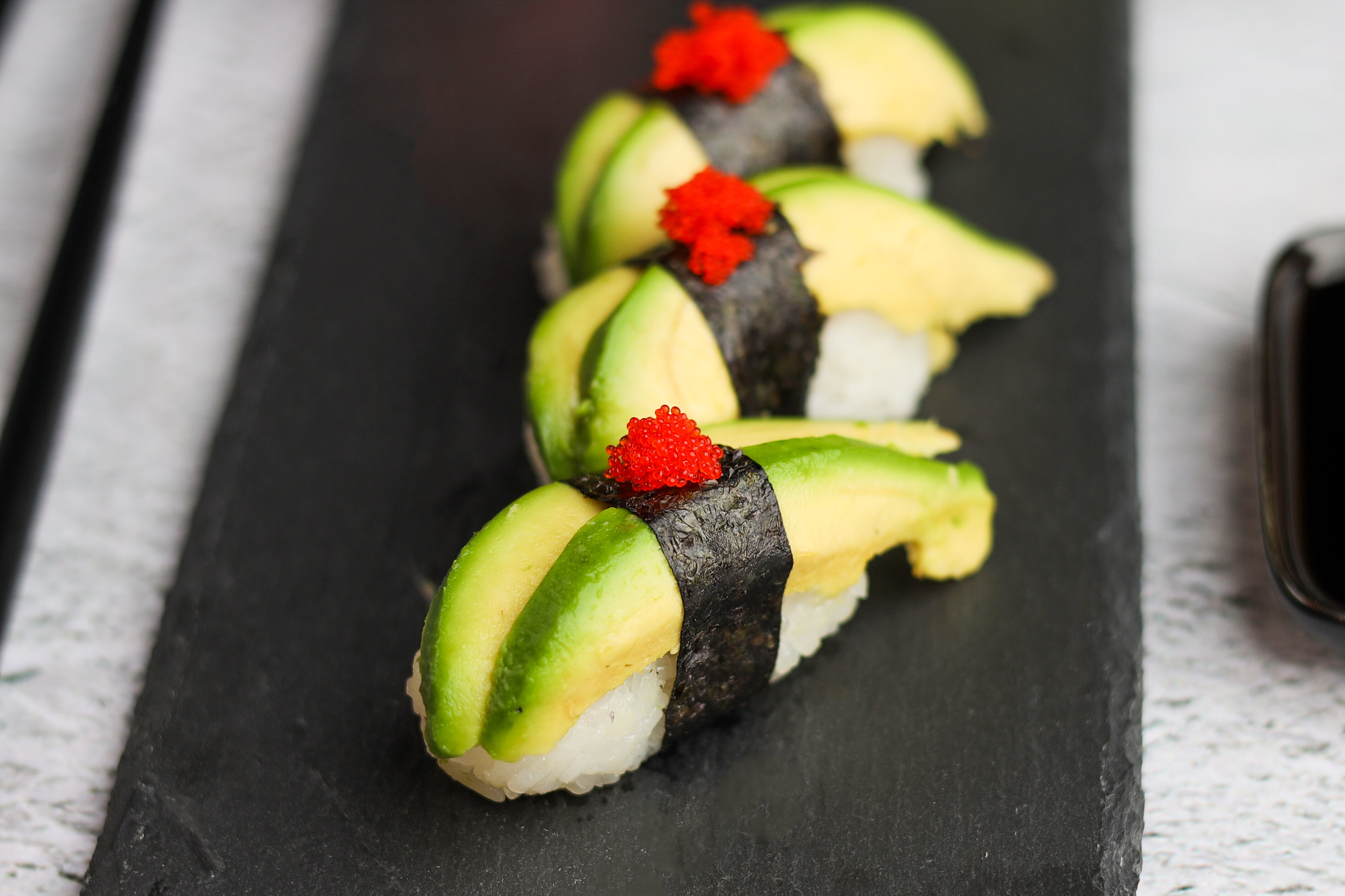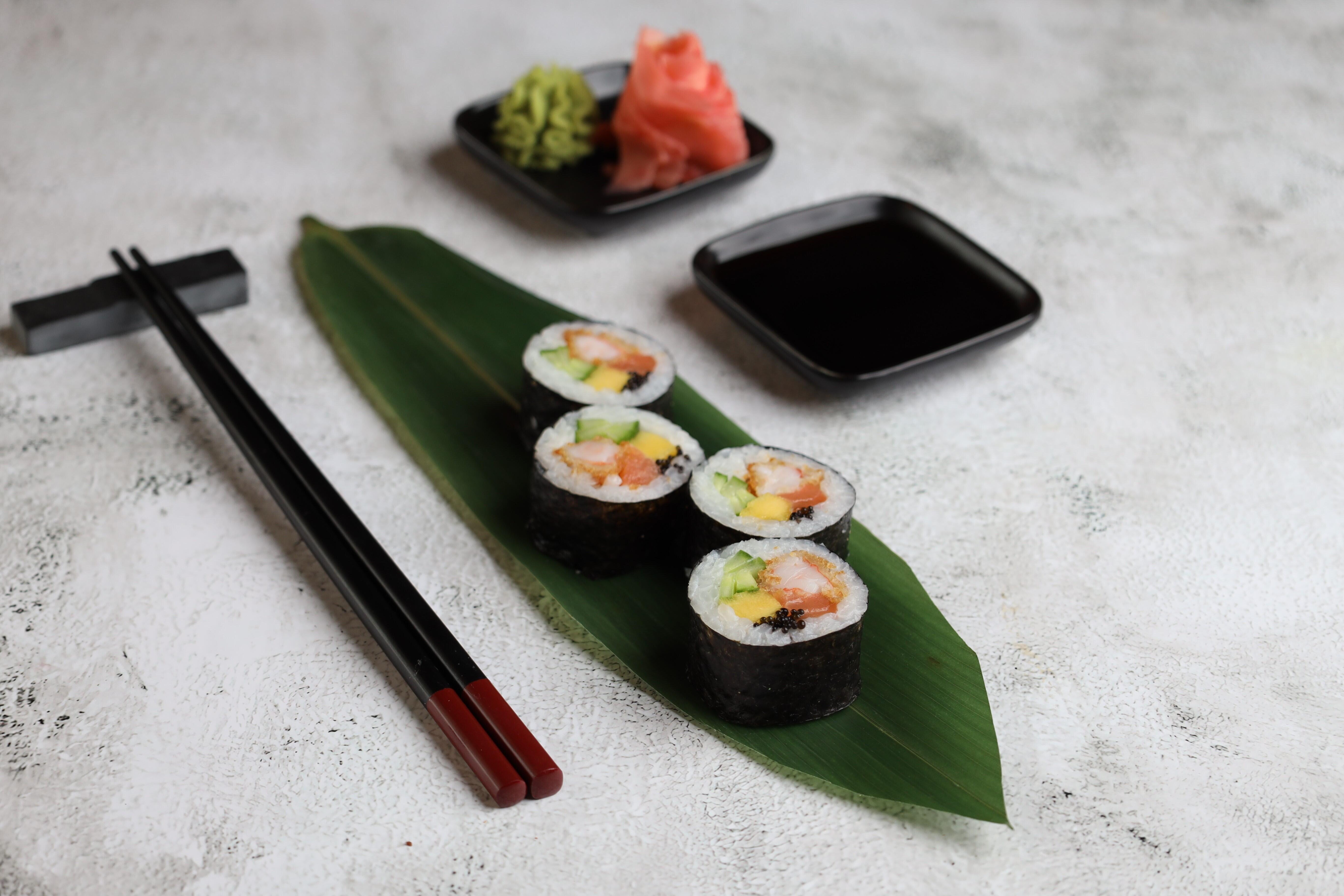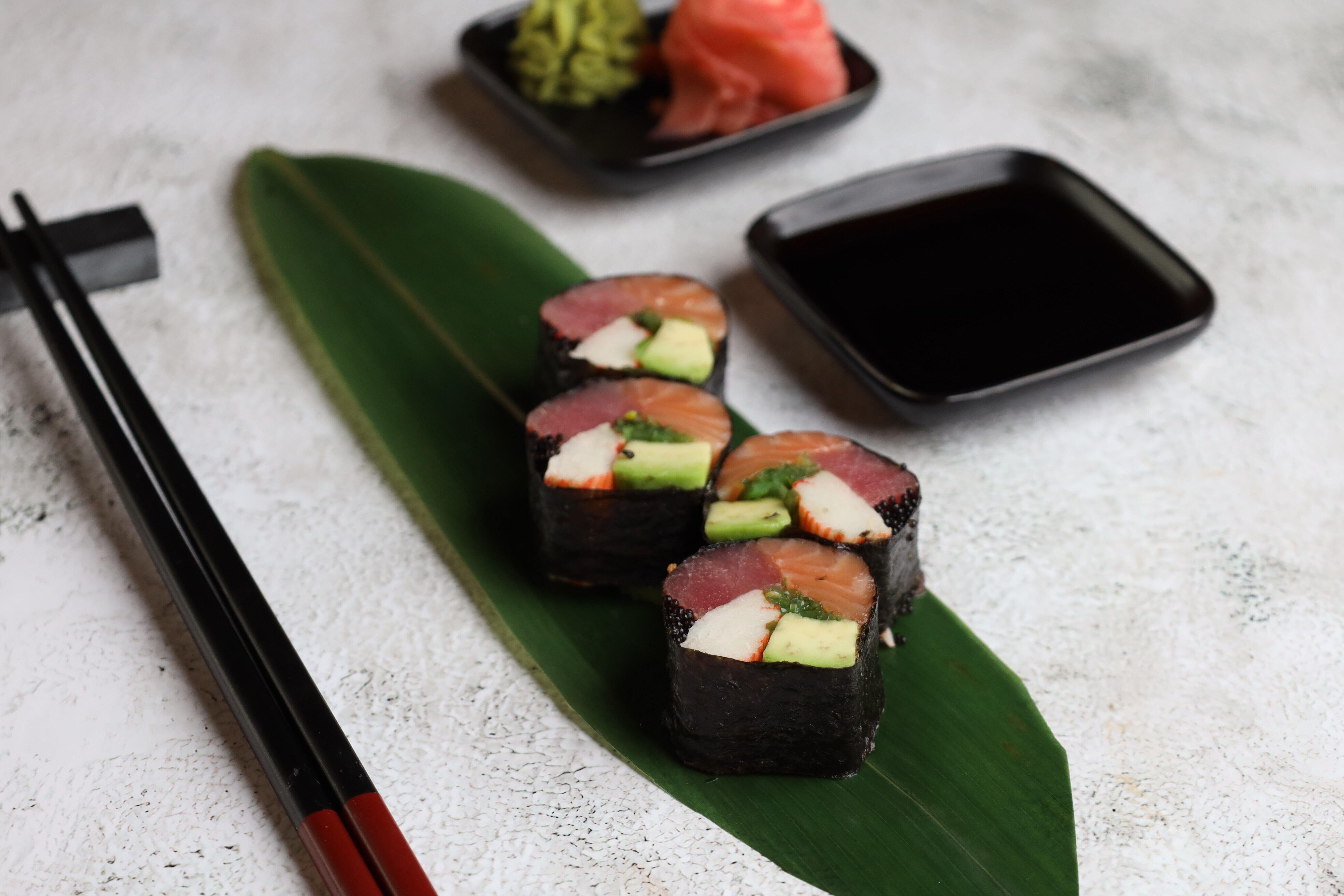 سوشي التنين؟ عبارة عن رول خاصة محشوة بأوراق نوري ملفوفة حول المكونات من الداخل وأرز السوشي من الخارج. هنا، يتم وضع سمك السلمون وتيمبورا الروبيان والخيار داخل النوري، وفي الأعلى مغطى بسرطان البحر والأفوكادو . يرش المايونيز والصلصة الحارة وصلصة أوناجي، مما