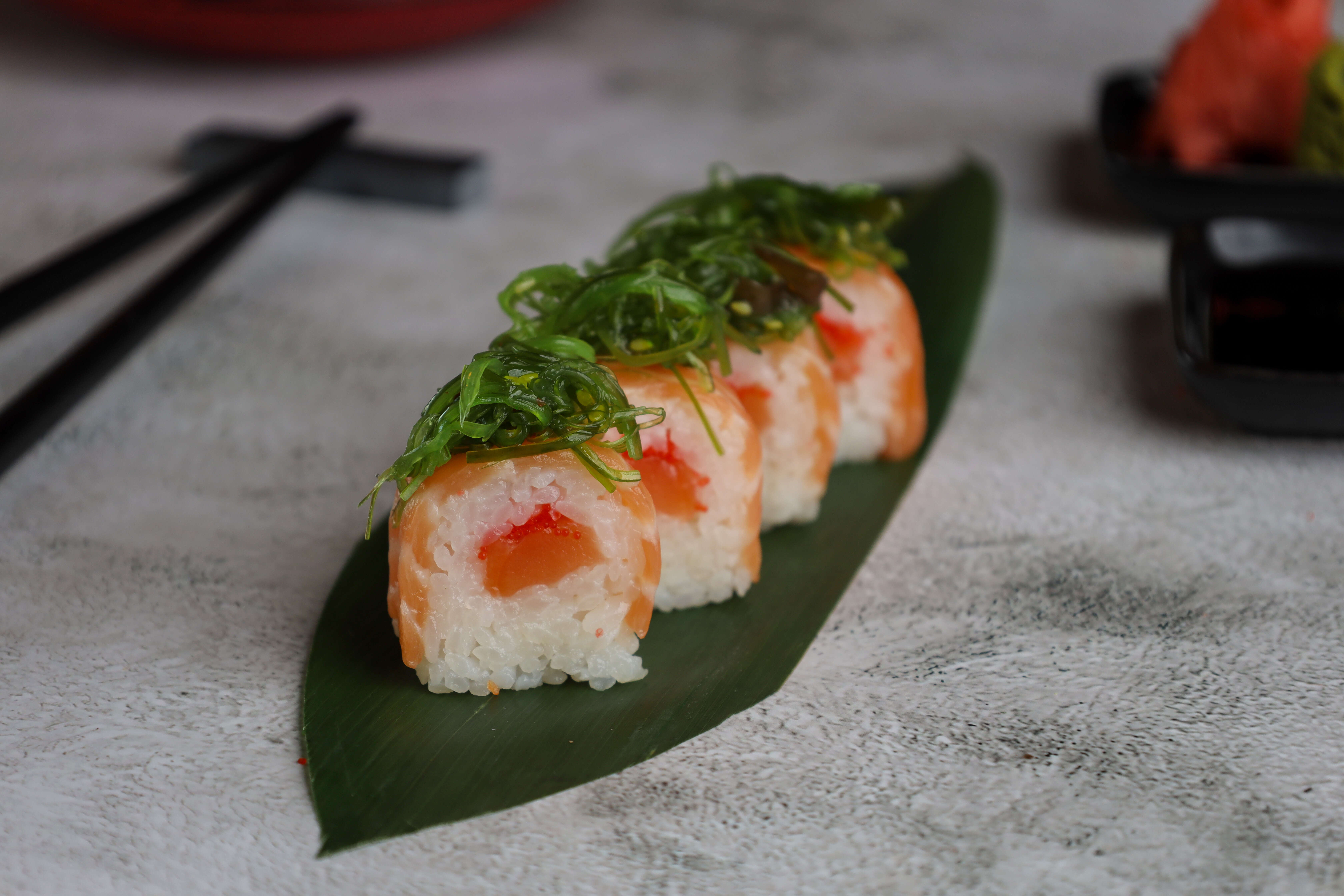 سالمون, جبنة , توبيكو كافيار ومغطى من الخارج كاملا بشرائح من السالمون يعلوها سلطة الطحالب البحرية