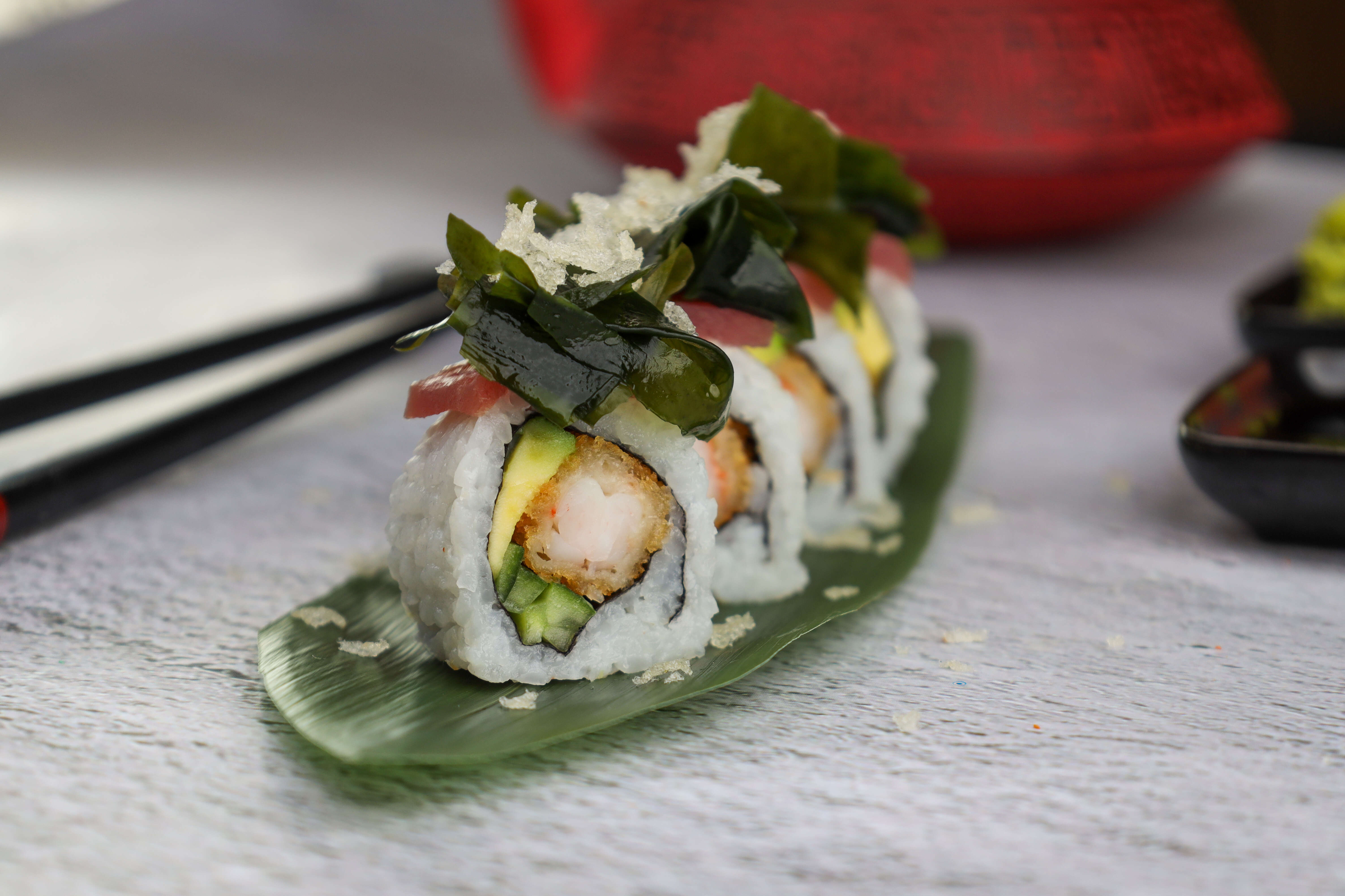 روبيان تمبورا, أفوكادو، خيار. يعلو الرول شرائح التونا الطازجة و واكامي والورق المقرمش لطحالب البحر