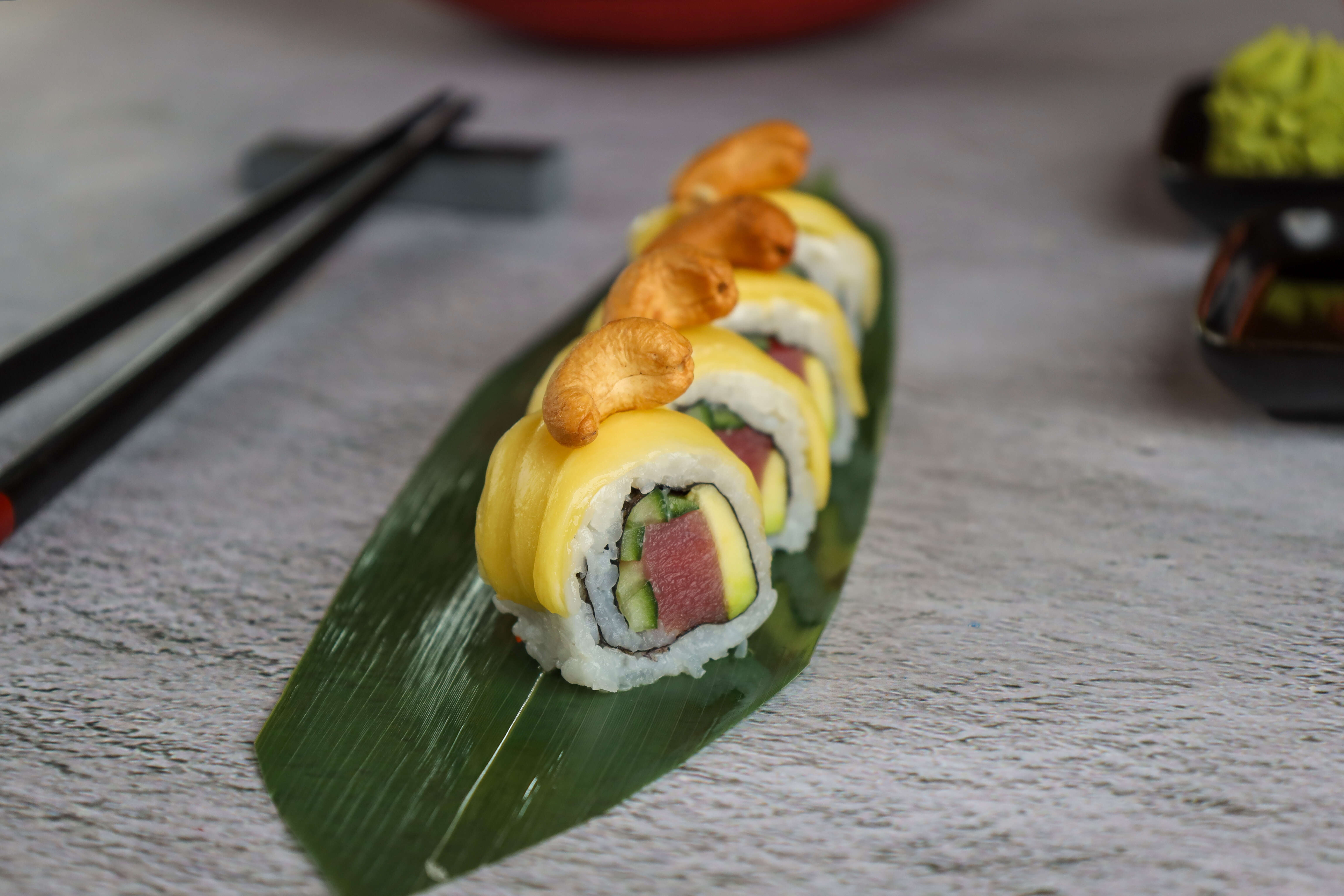 سمك تونا, أفوكادو, خيار ويعلوه شرائح من المانغو بالصوص الحار