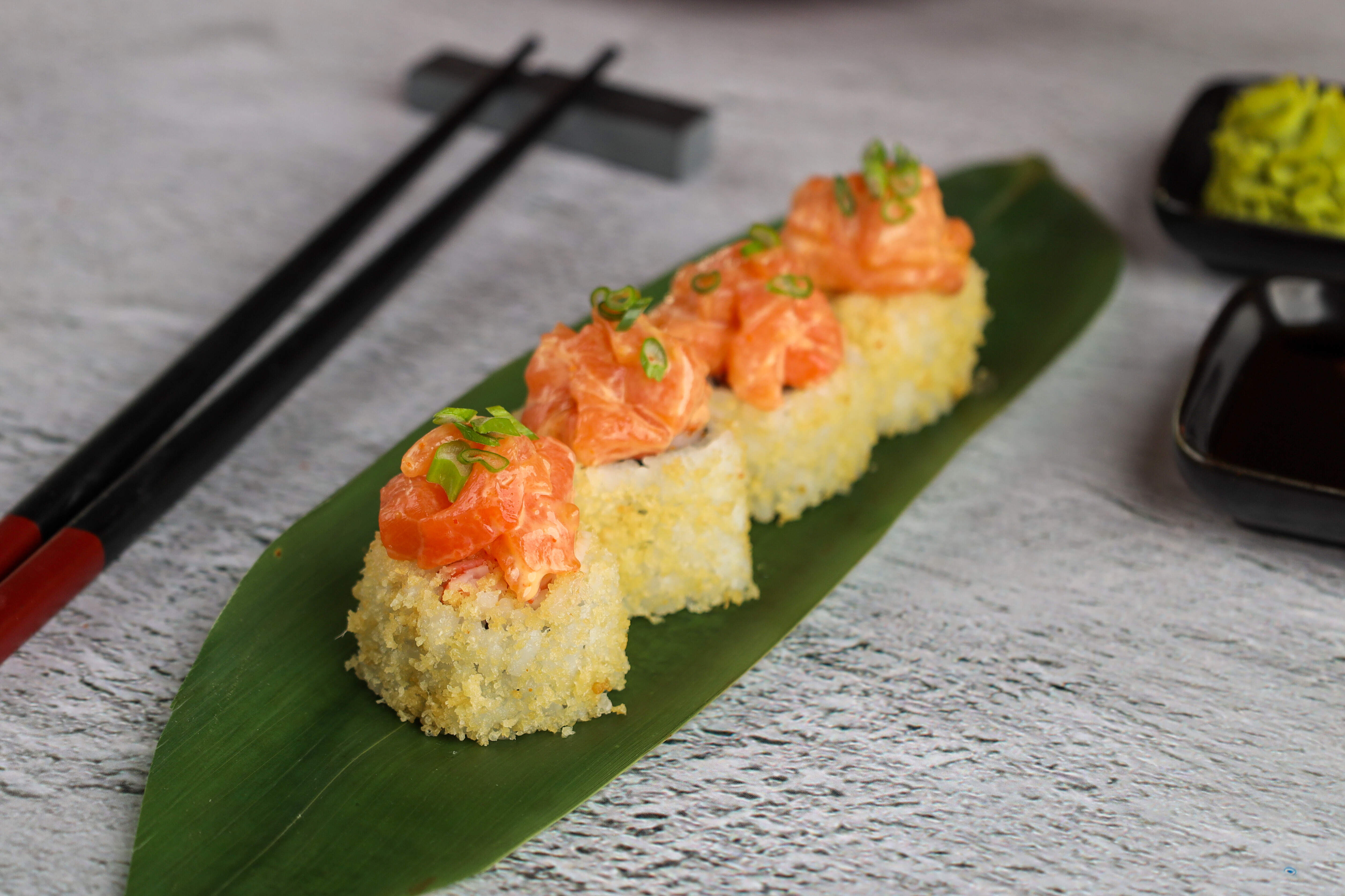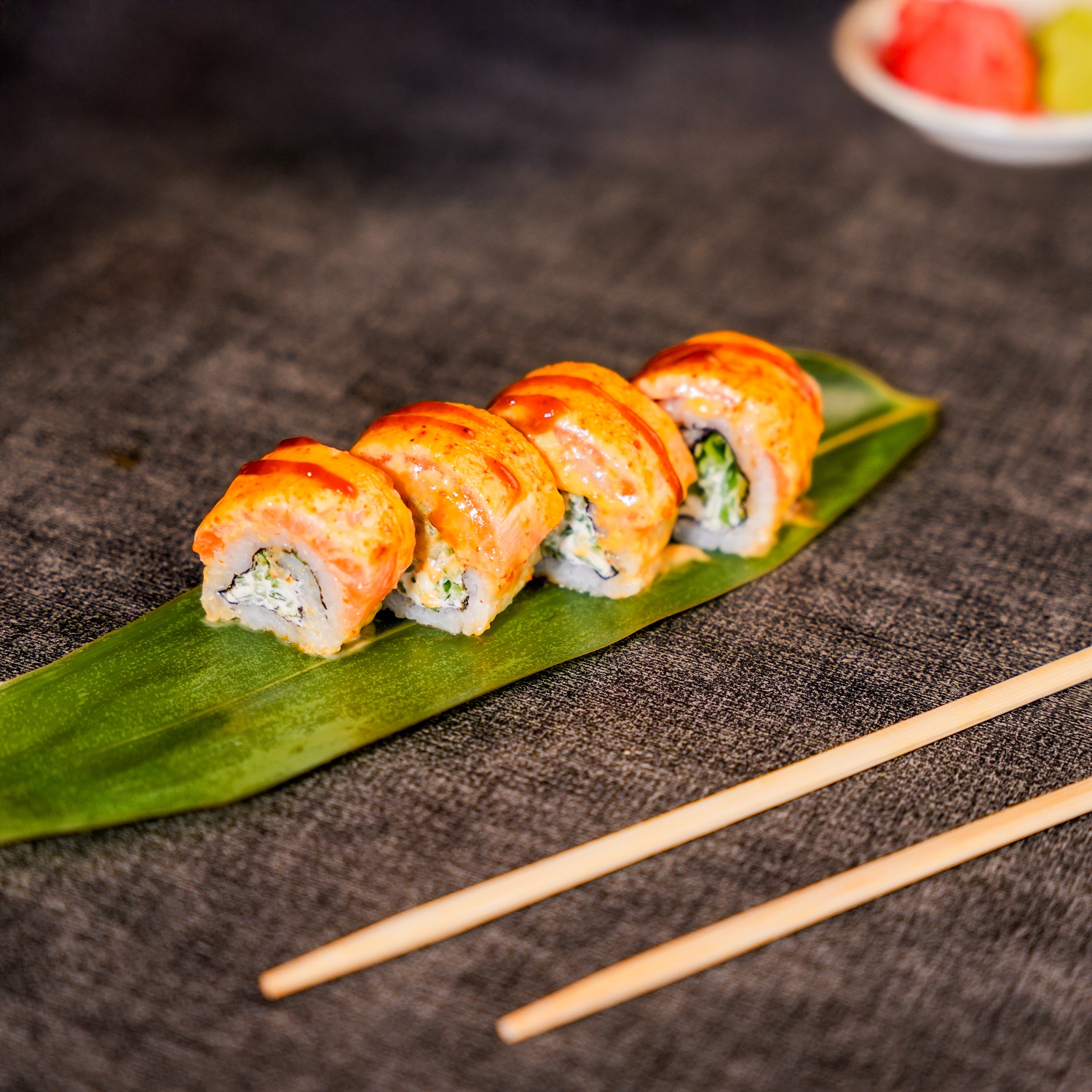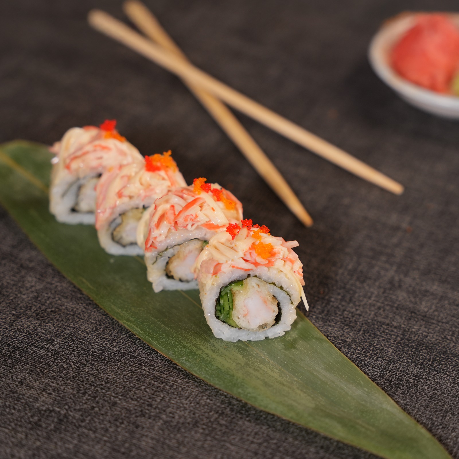 رول سلمون مشوي، مطبوخ بالكامل. تحتوي على الروبيان تمبورا و السلطعون مع "مايونيز الكيوبي" ومغطاة بطبقة من السلمون المشوي