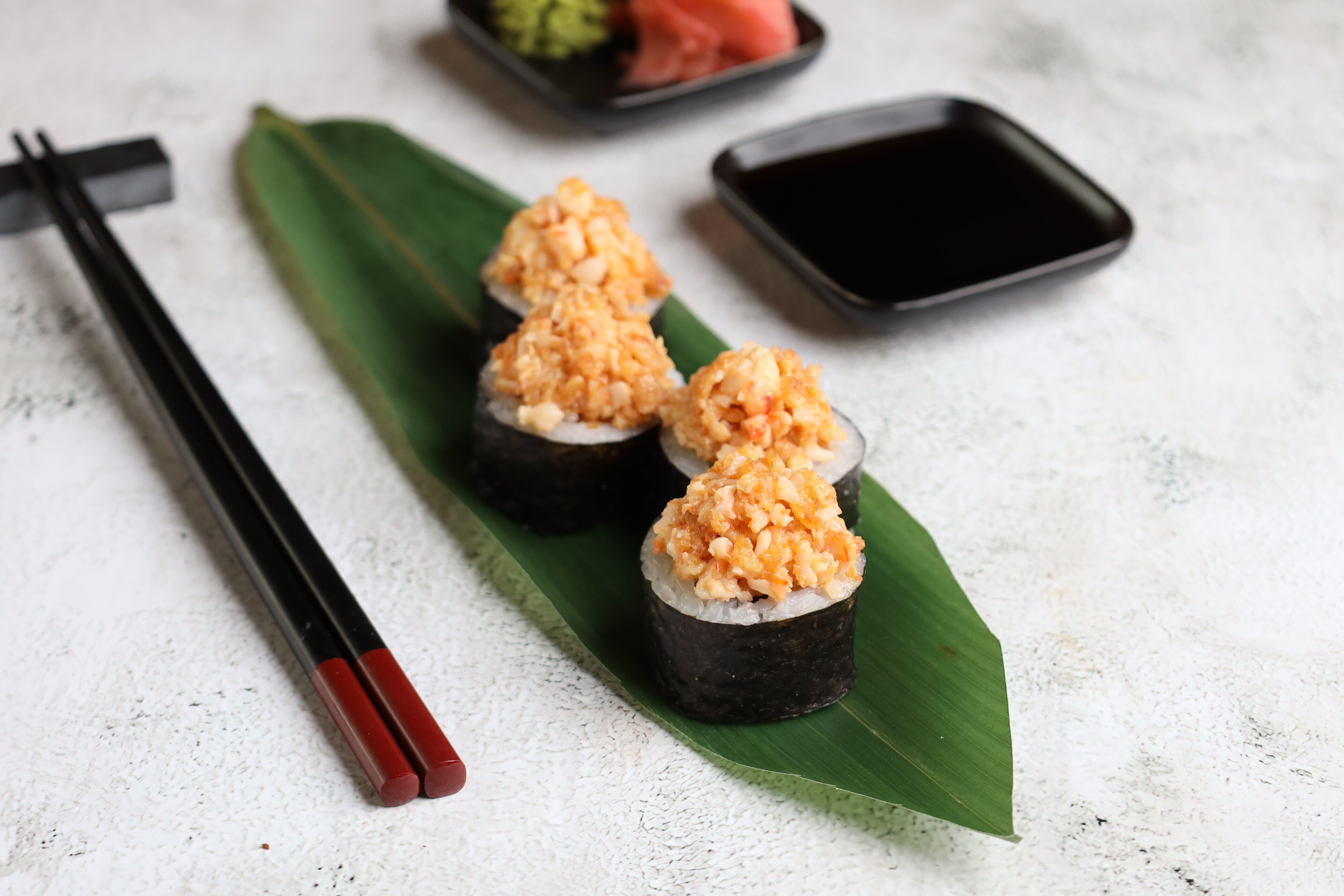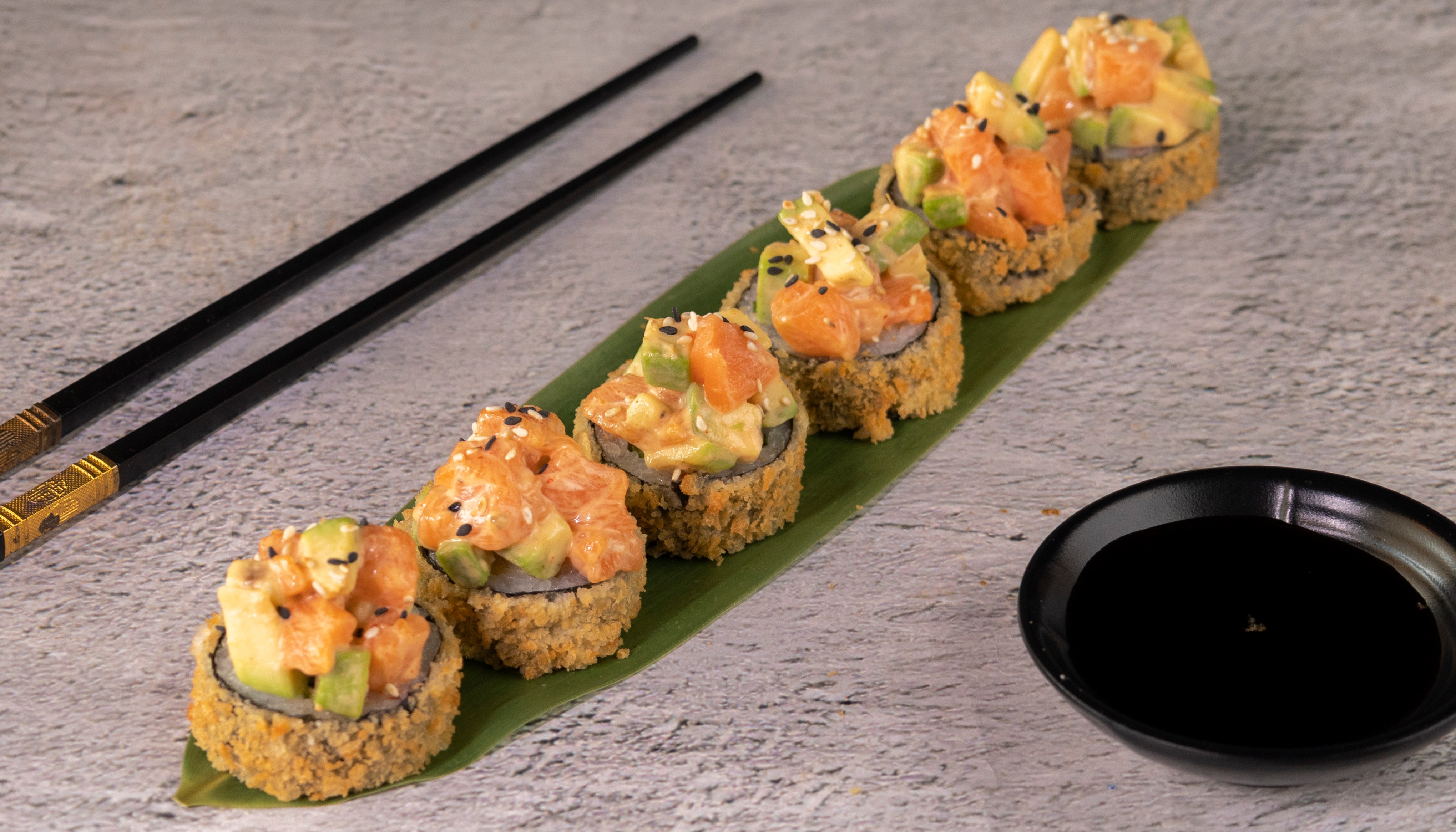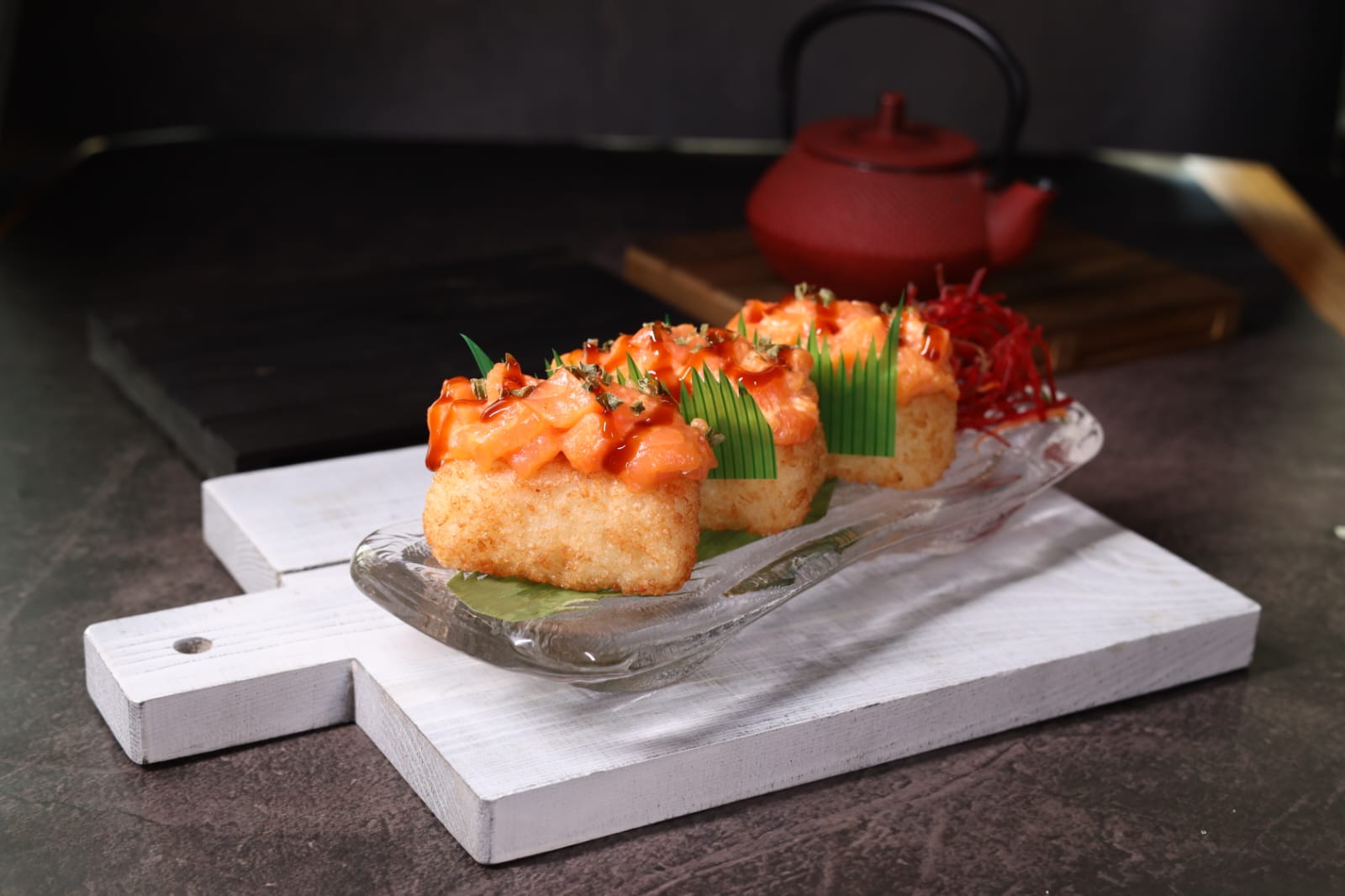 يُحضر السلمون بقطع صغيرة الحجم متبلة بصلصة المايونيز الحار وبضع قطرات من صلصة الترياكي، والتي يمكن وضعها بسهولة فوق مربعات الأرز المقرمشة.