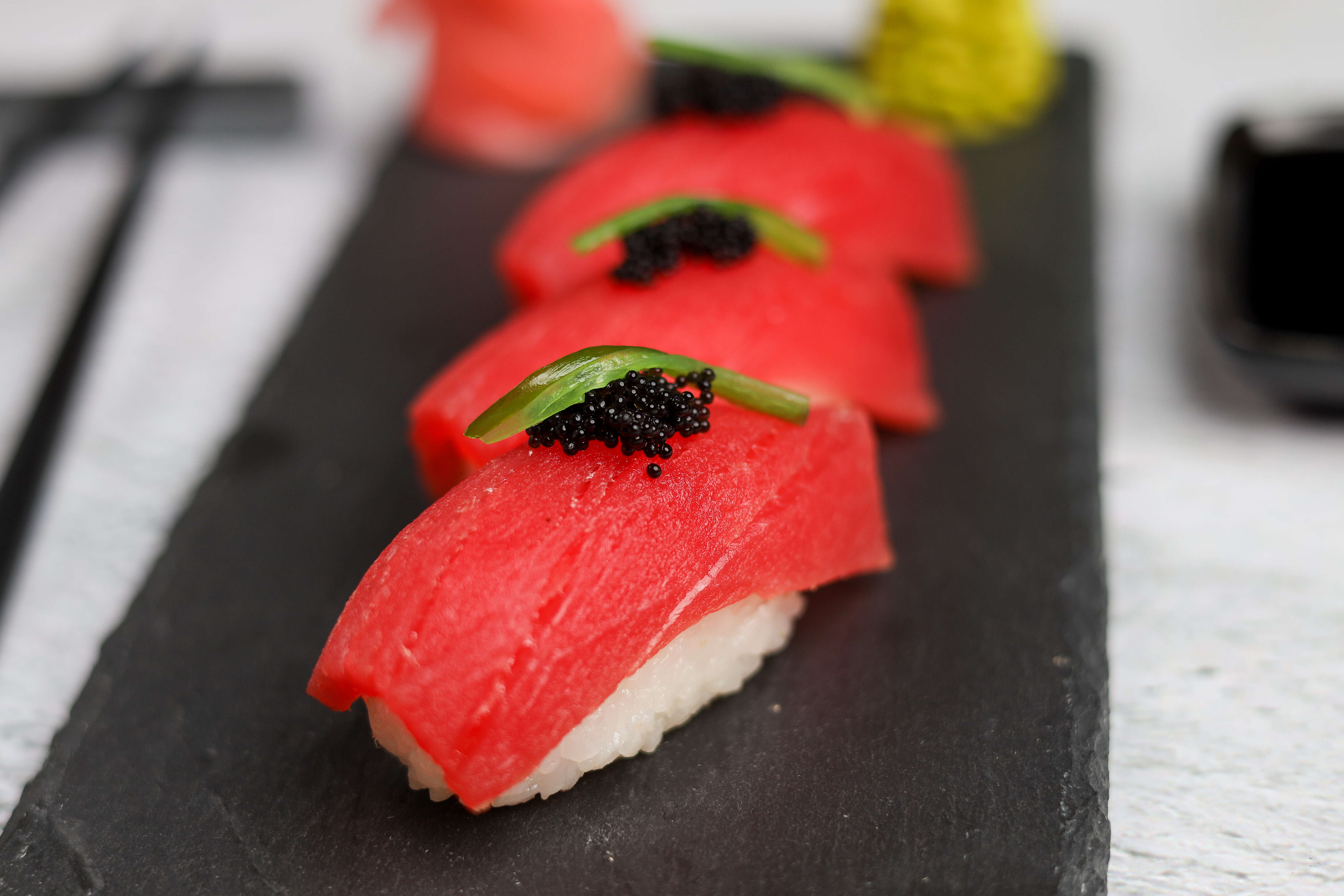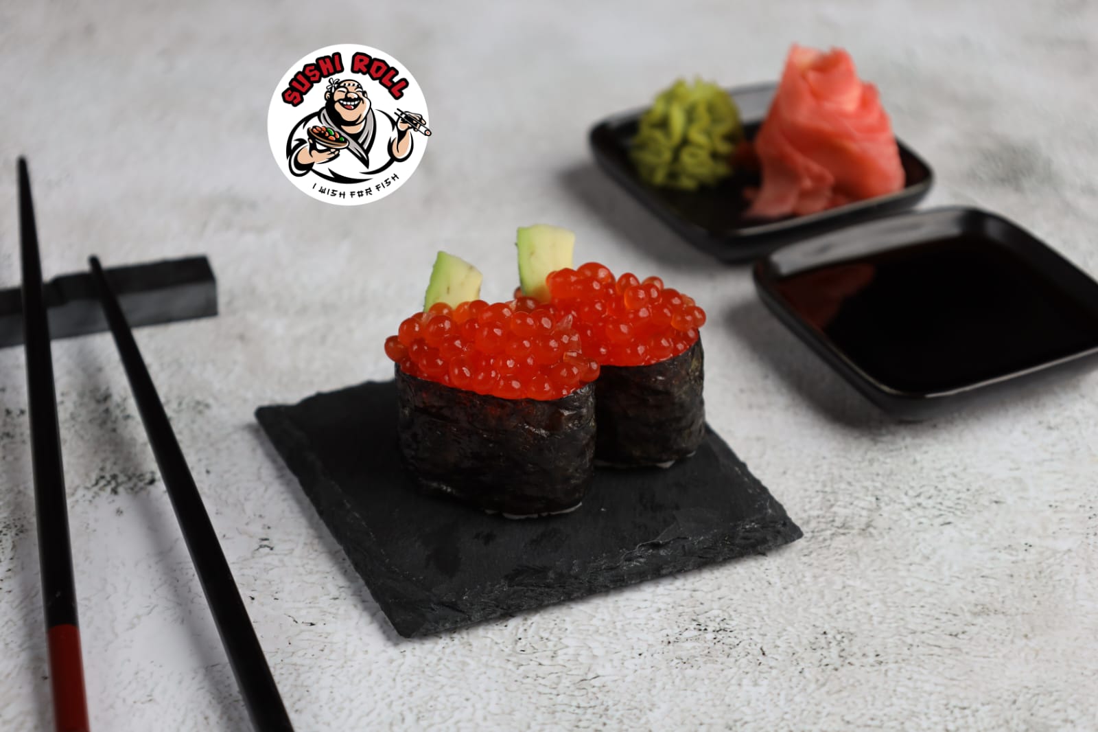 سلمون مقرمش ، أفوكادو ، شرائح جزر ، شرائح فلفل حار ، كافيار ،