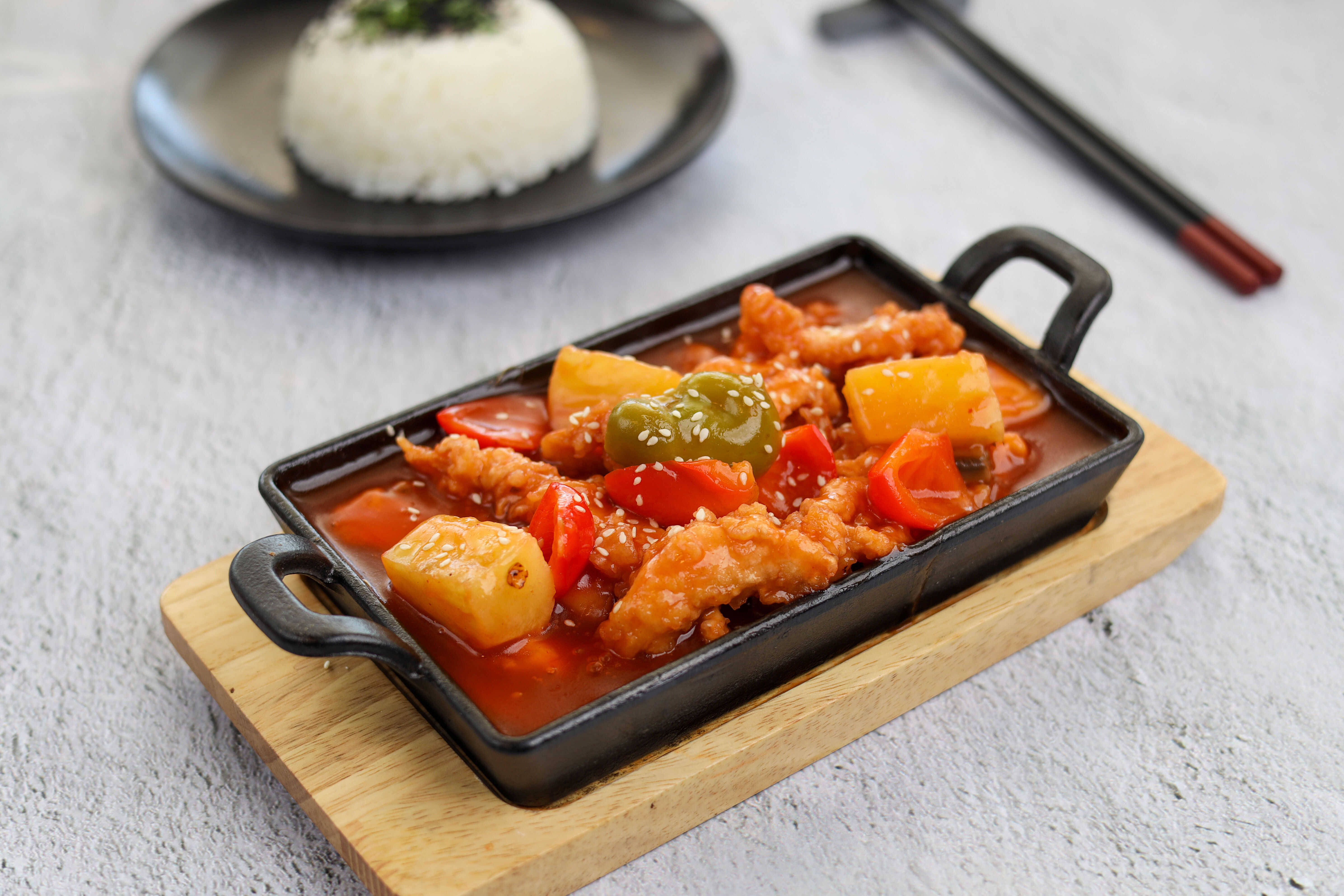 طبق صيني لدجاج حلو و حامض مع الفلفل الملون , الفطر الاناناس مع صوص حلو حامض دجاج