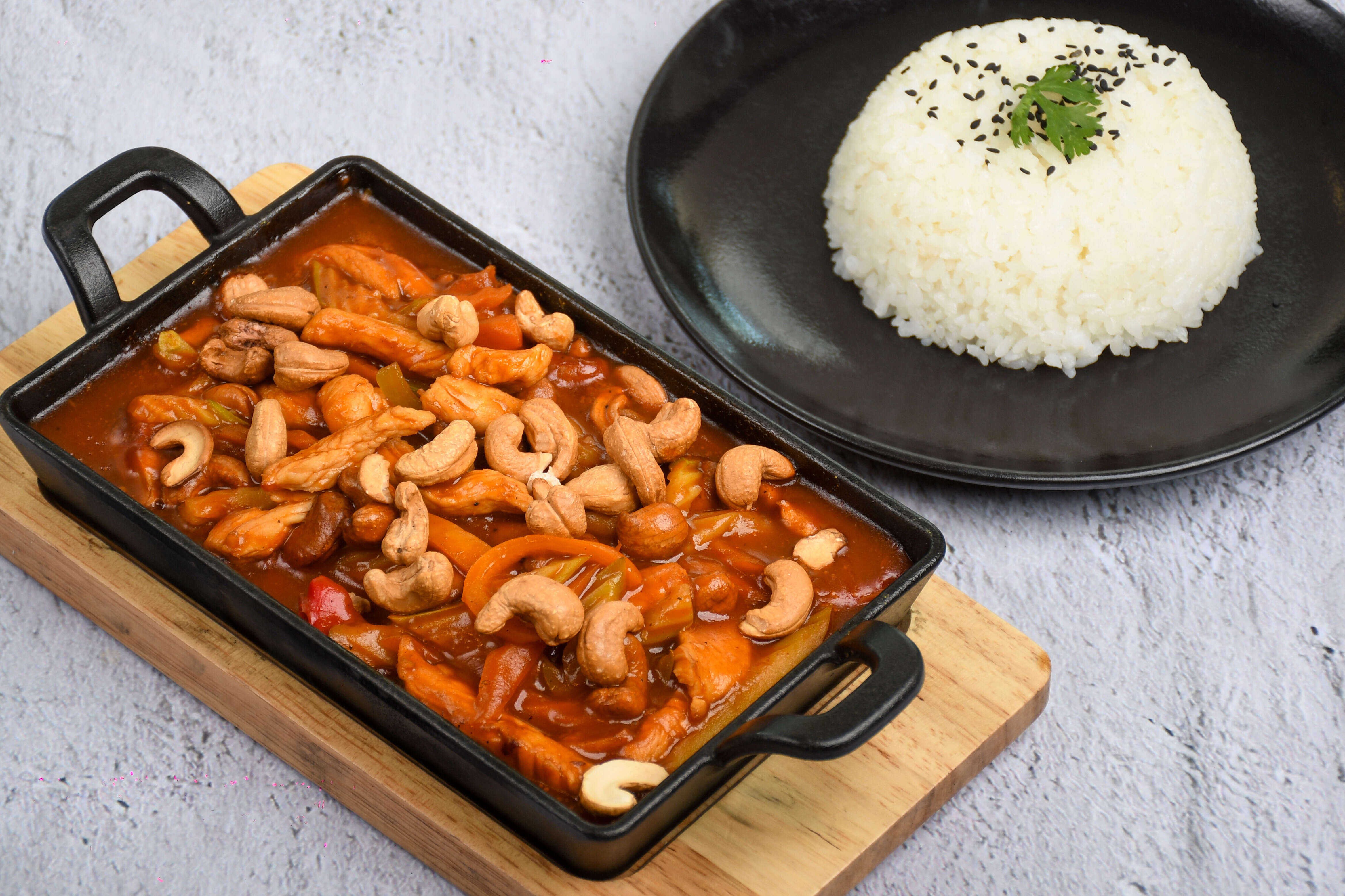 طبق صيني من الدجاج , الفطر ,الخضار المشكلة, الكاجو مع صلصة أسيوية خاصة