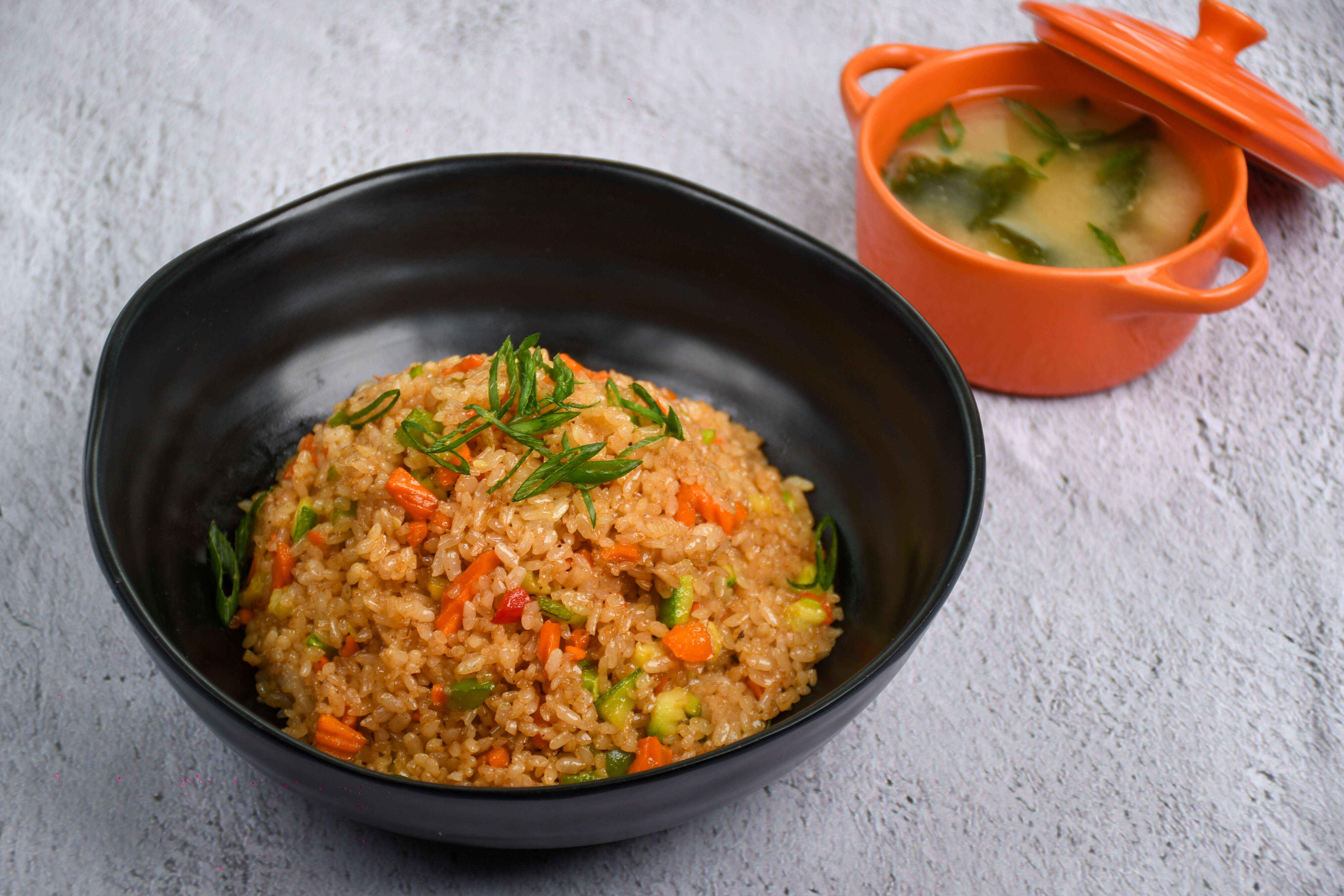 يأتي الرز الأسيوي بالخضار بصلصة السمك والصويا مع البيض المخفوق او بدونه و رشة من البصل الاخضر مع شوربة الميسو كطبق جانبي