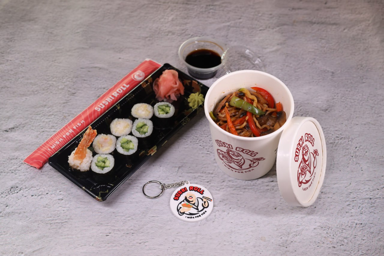 روبيان ماكي تيمبورا وماكي الخيار ونودلز الخضار في عبوة.