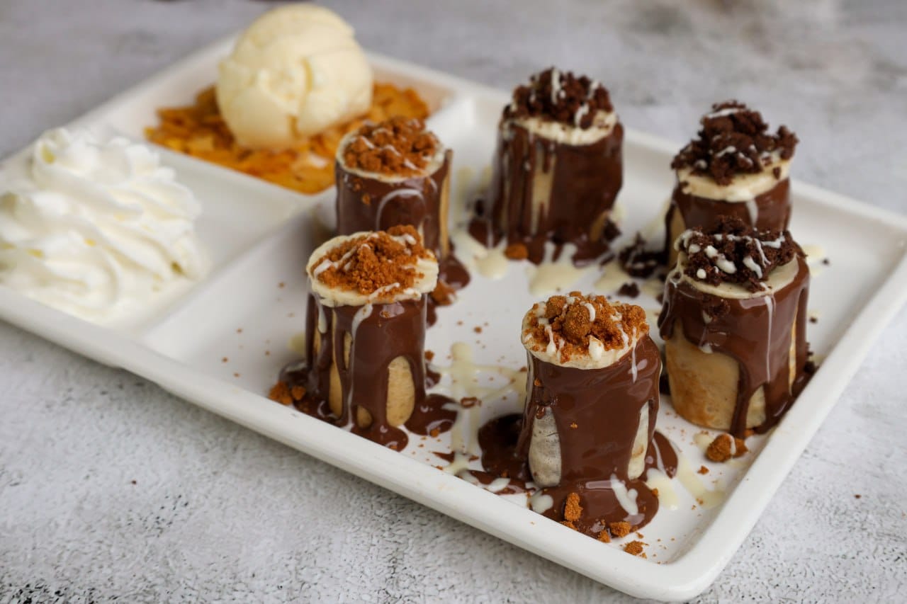 انها رول، مثل الموسيقى التي تعشق سماعها ، لكن هذا السوشي روك اند رول هو الذي سوف تعشق أكله ، رول مقلي في داخله الكراب مع قليل من السبايسي والخيار ، ويعلوه قليل من السبايسي سالمون والتونا ، مع صوص الترياكي
